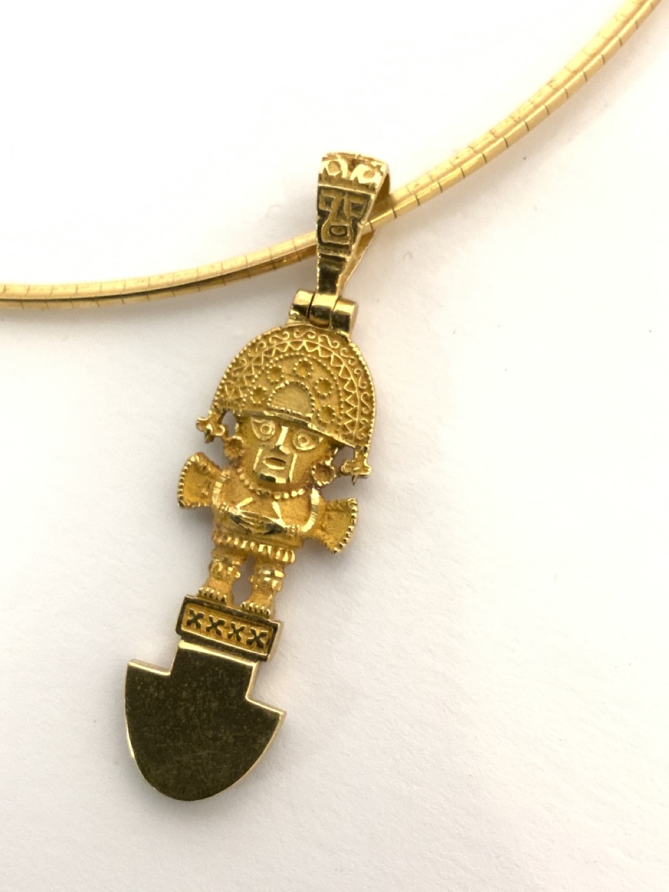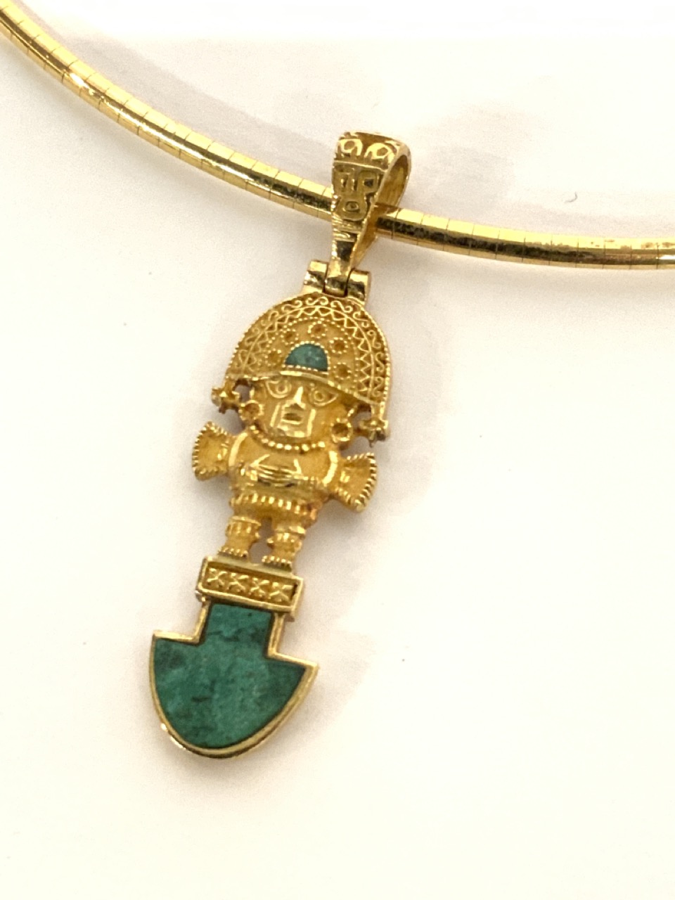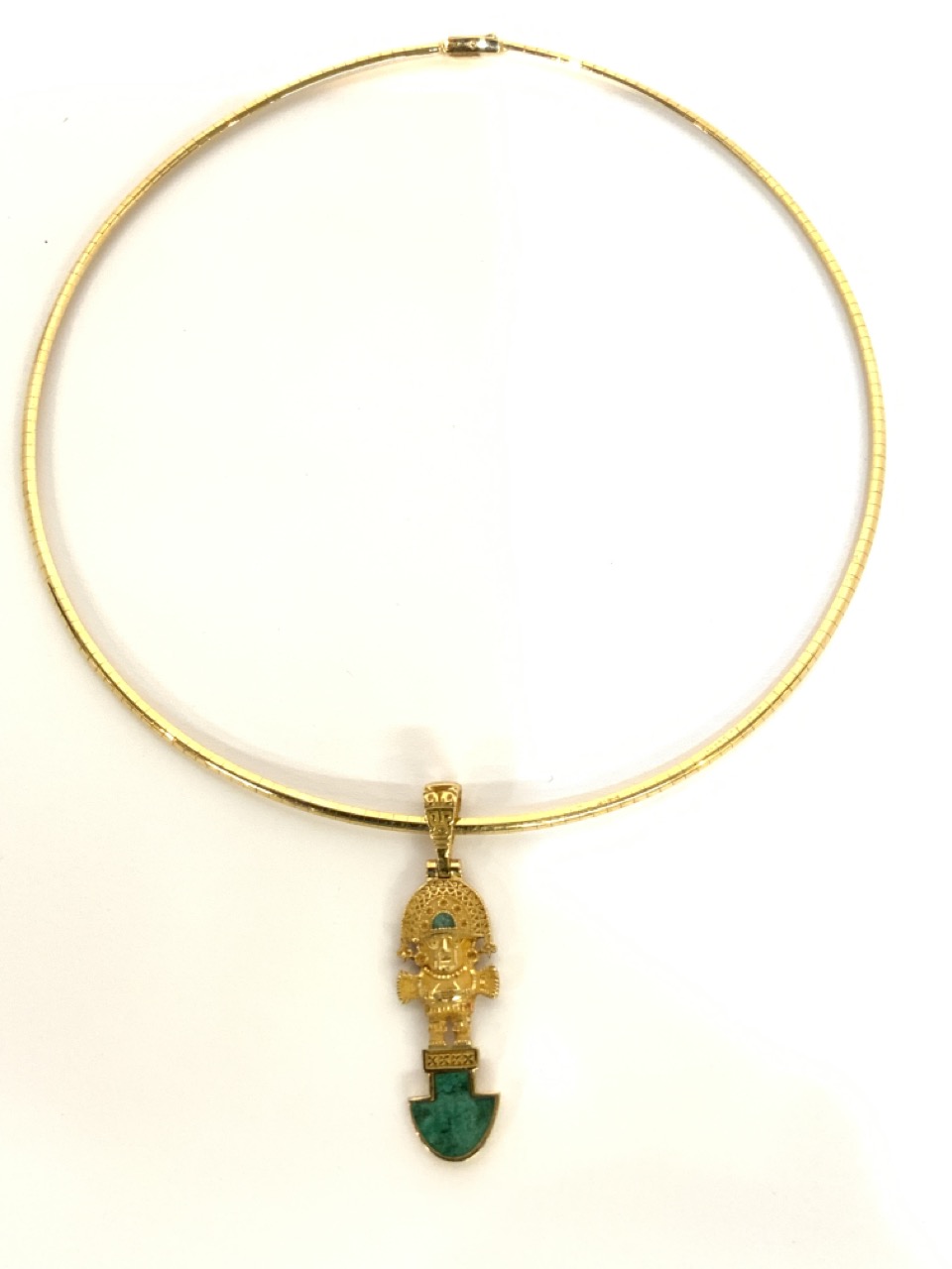 18k yellow gold choker style necklace with 18k y.g. Mexican Aztec pendant with malachite stones.