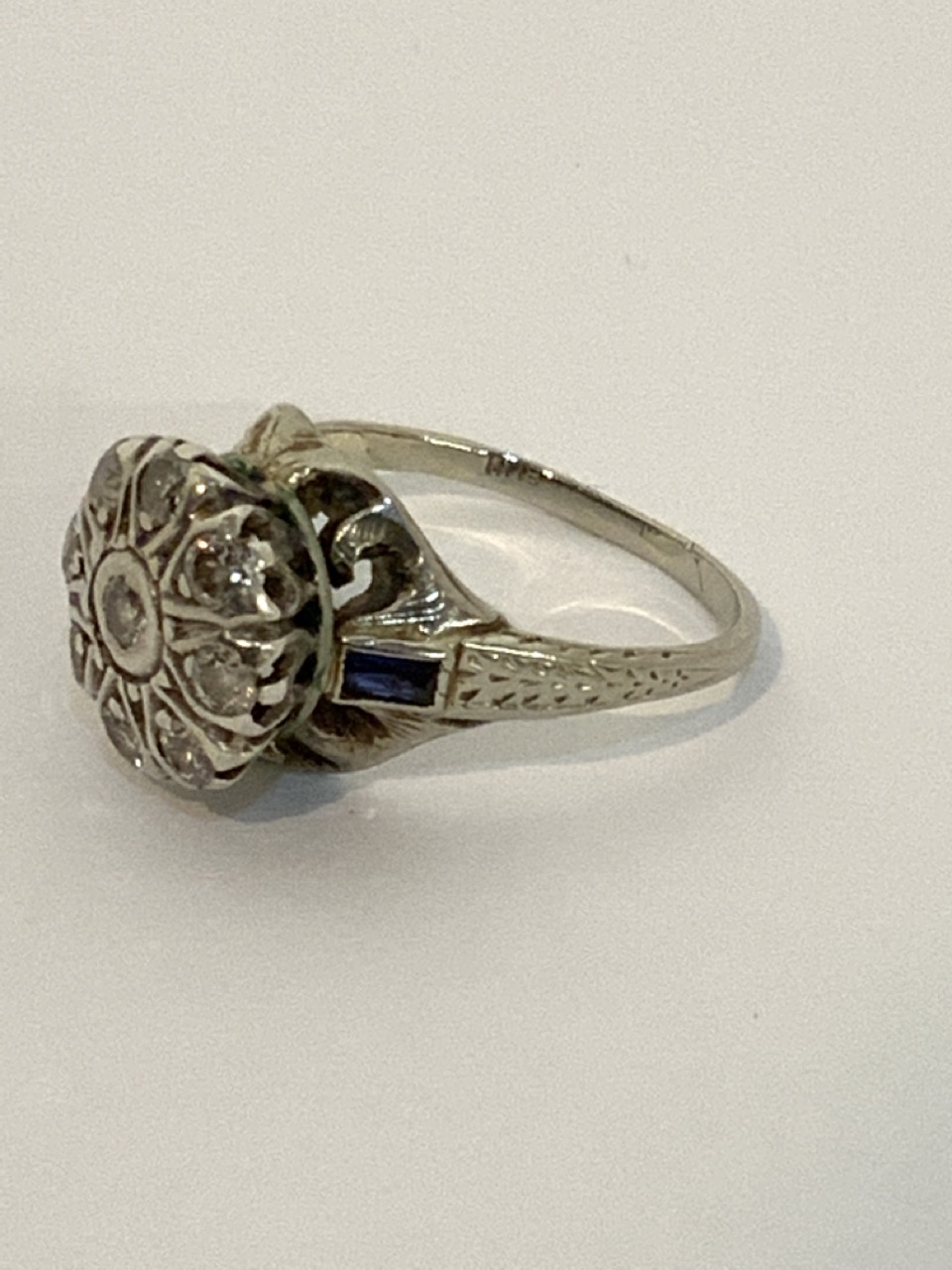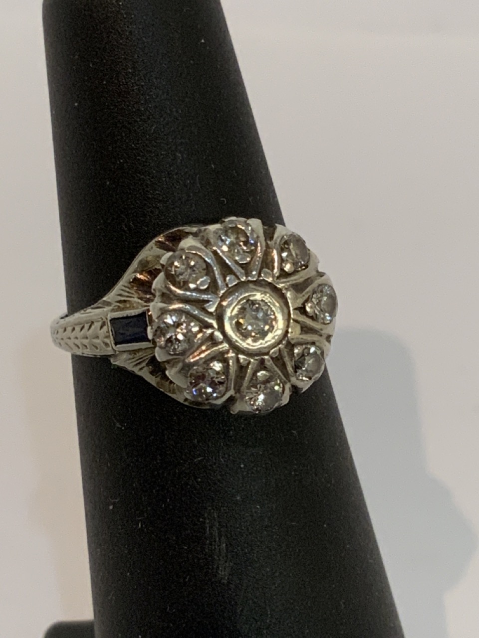 Edwardian platinum diamond and blue sapphire ring. 9 round brilliant diamonds and 2 blue sapphires.
