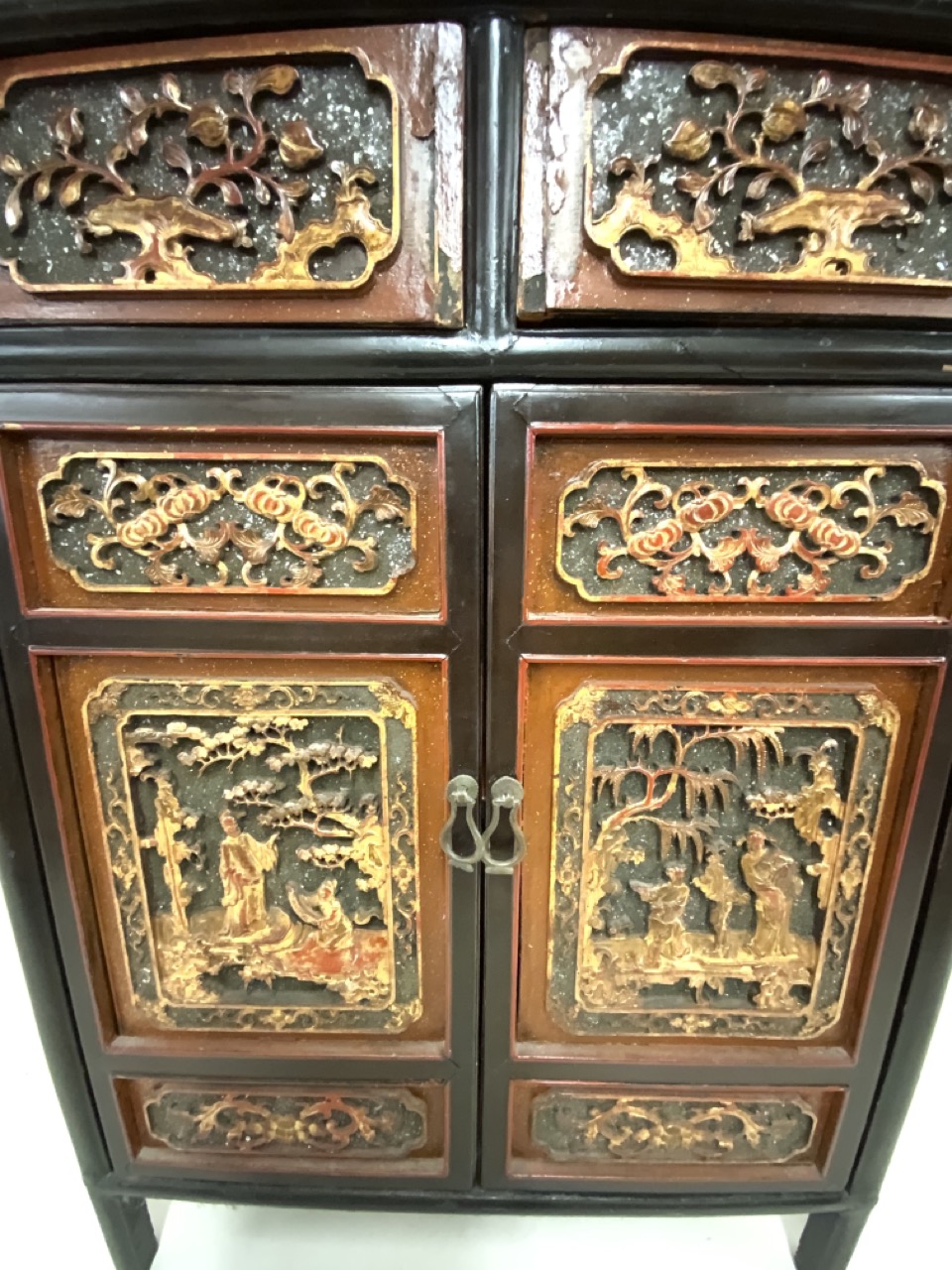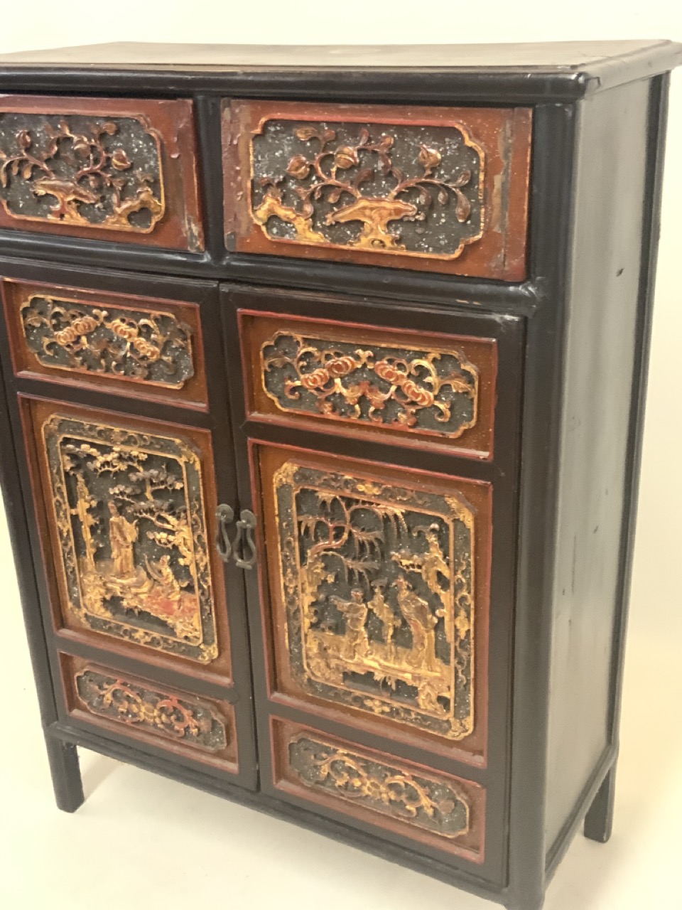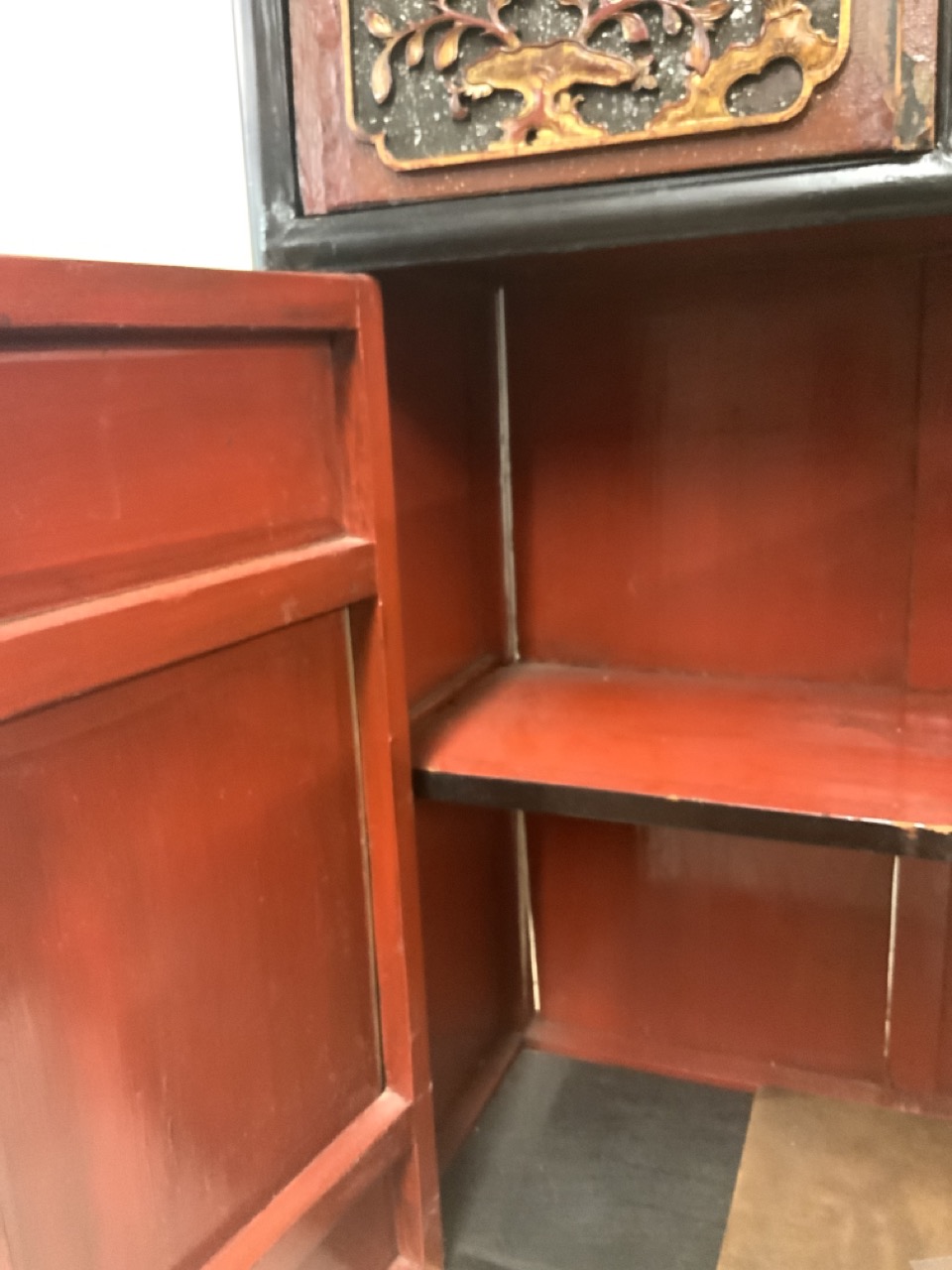 Chinese red and black lacquered cabinet. Highly ornate carved door panels. Late 19th or early 20th century.