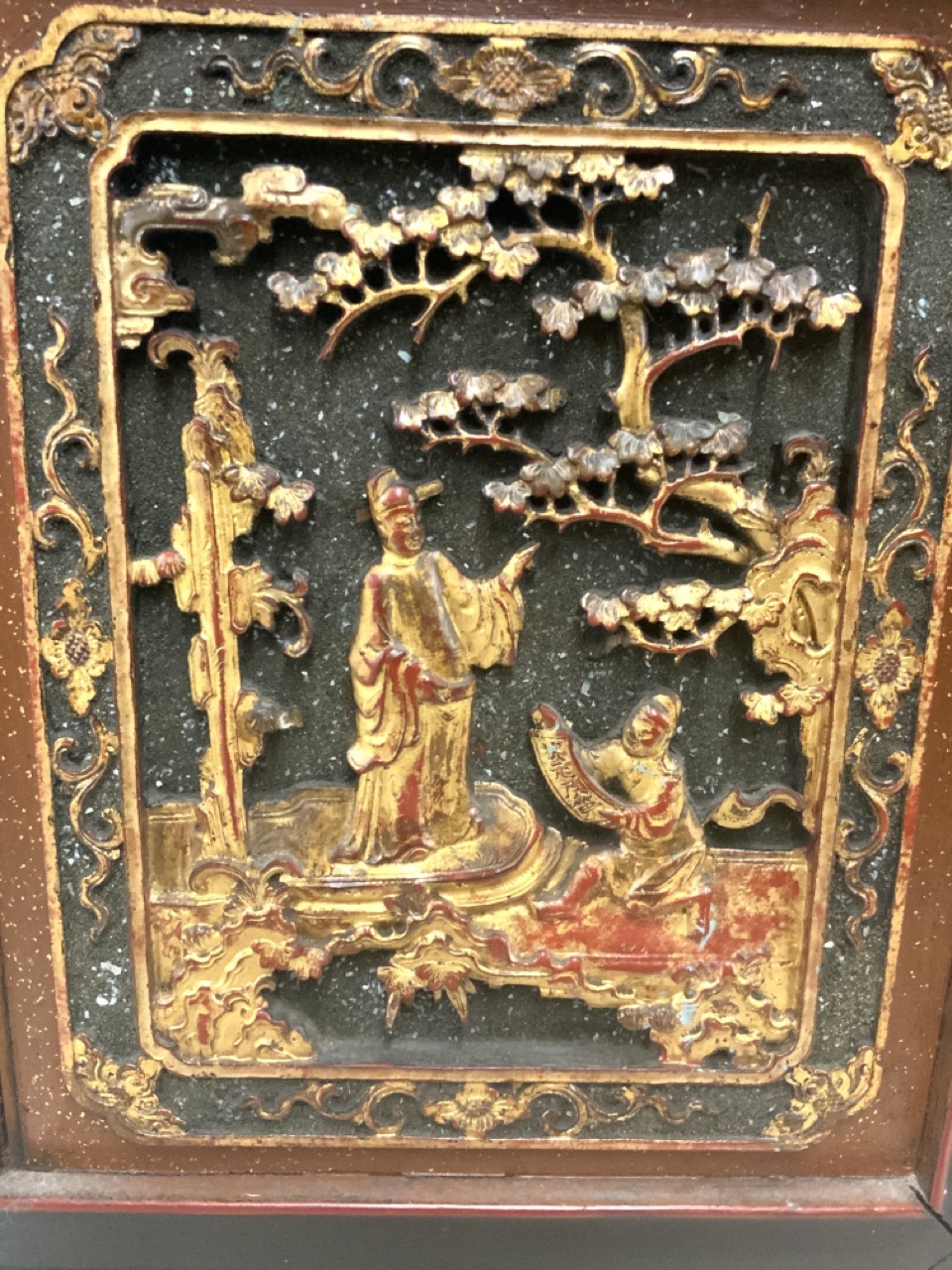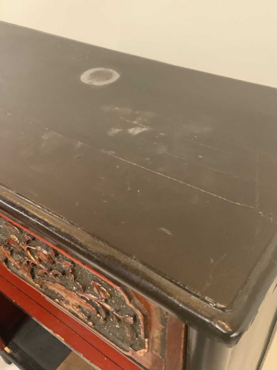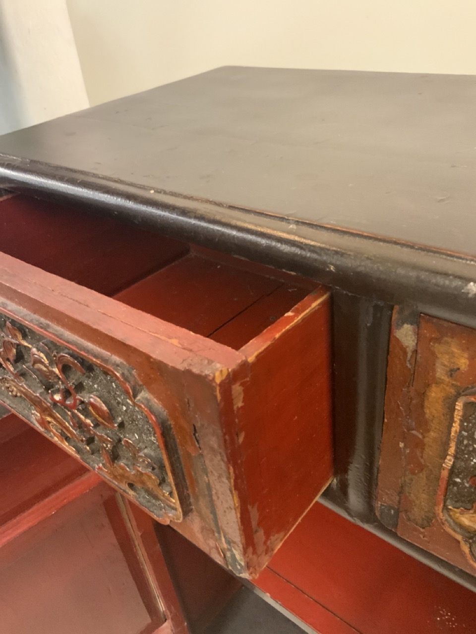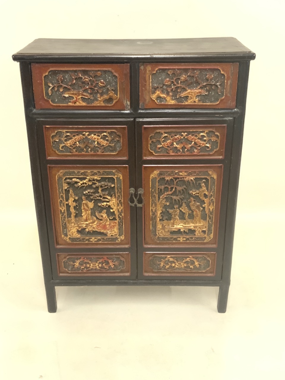 Chinese red and black lacquered cabinet. Highly ornate carved door panels. Late 19th or early 20th century.