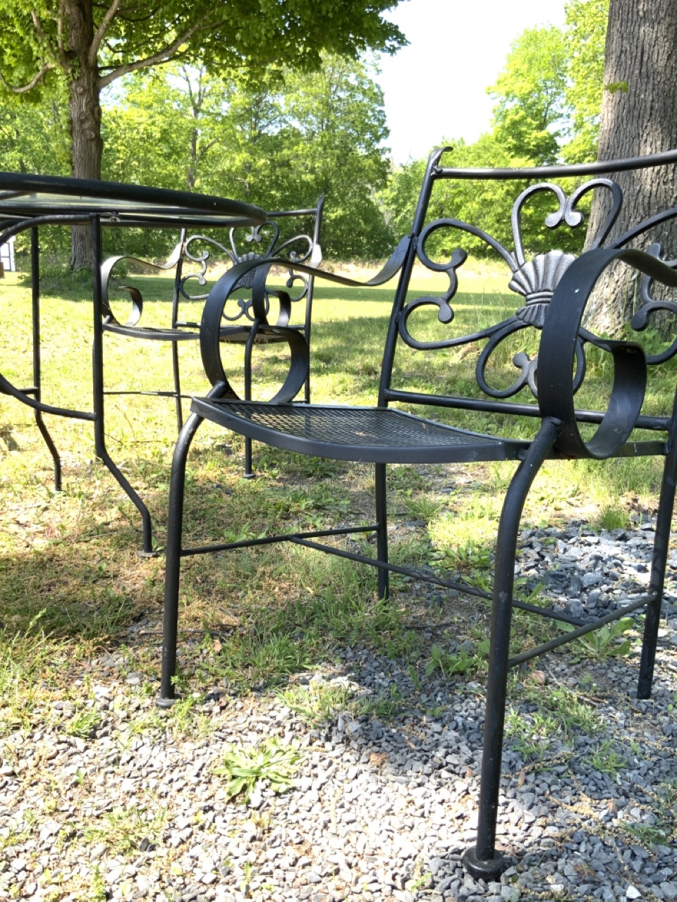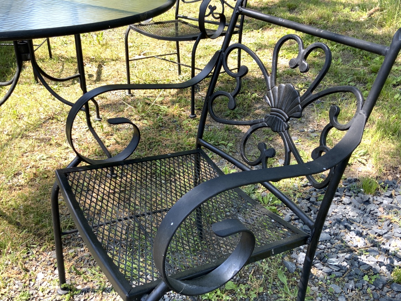 A round iron outdoor dining table with four arm chairs.