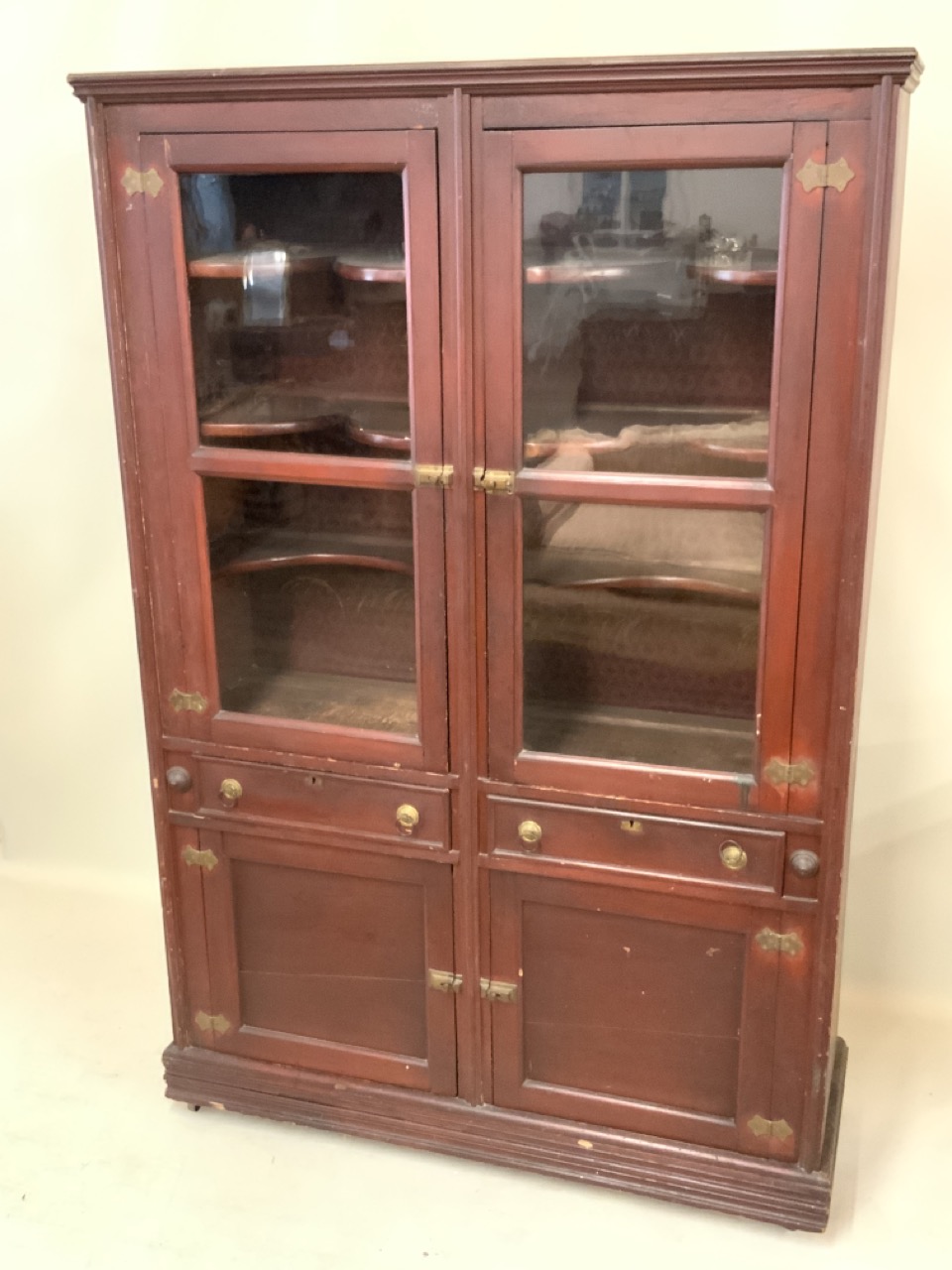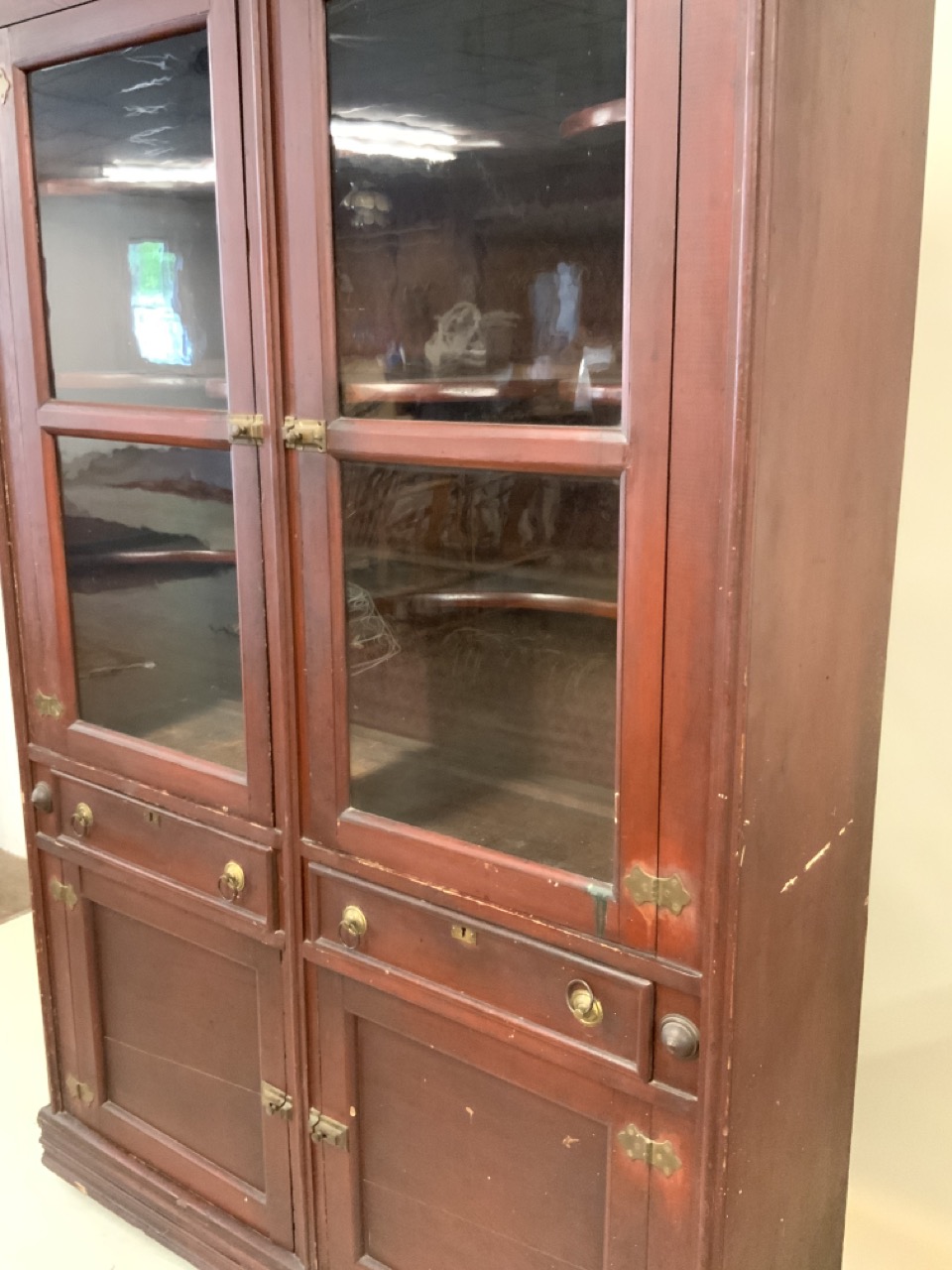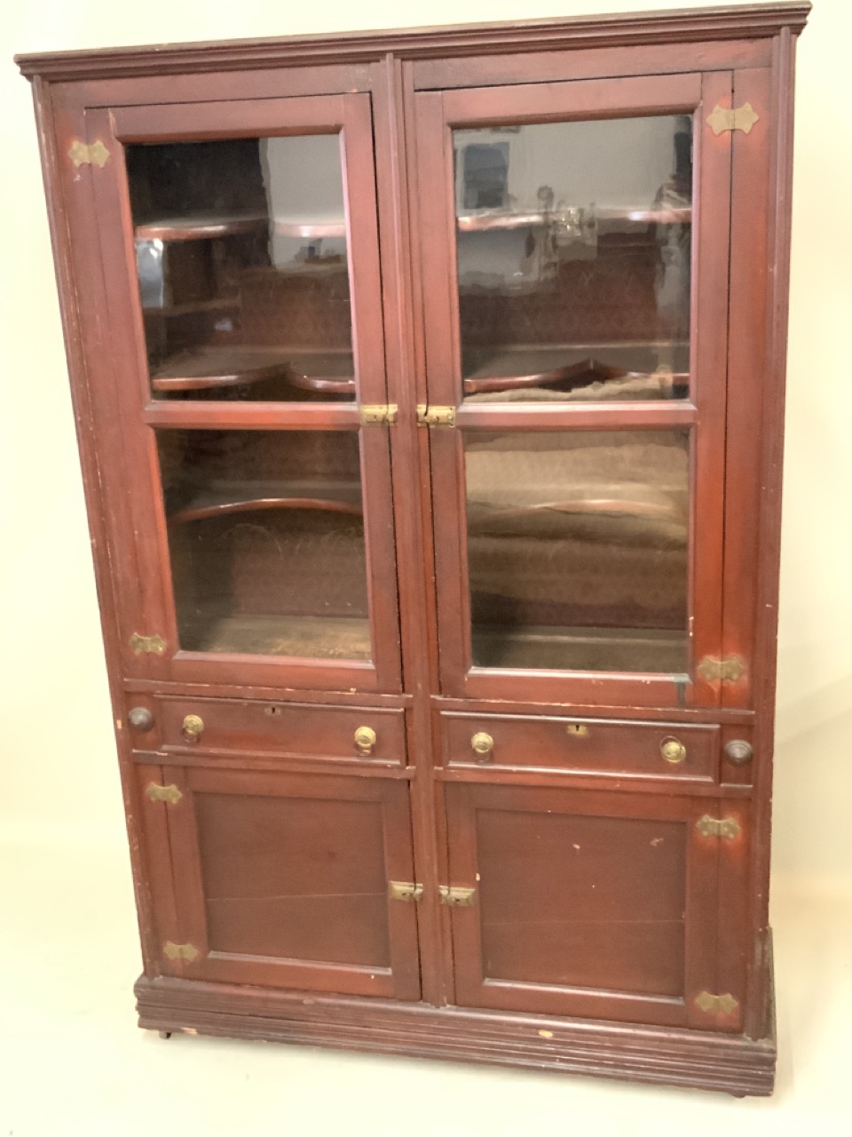 A handmade Americna pantry cabinet. C. 1870 made partially with shipping containers. A piece with good character. Red paint and brass hinges.