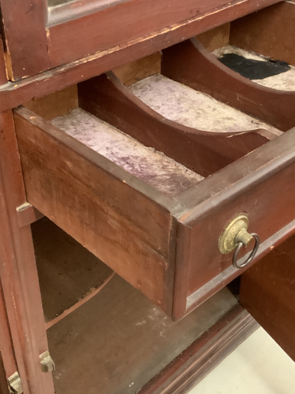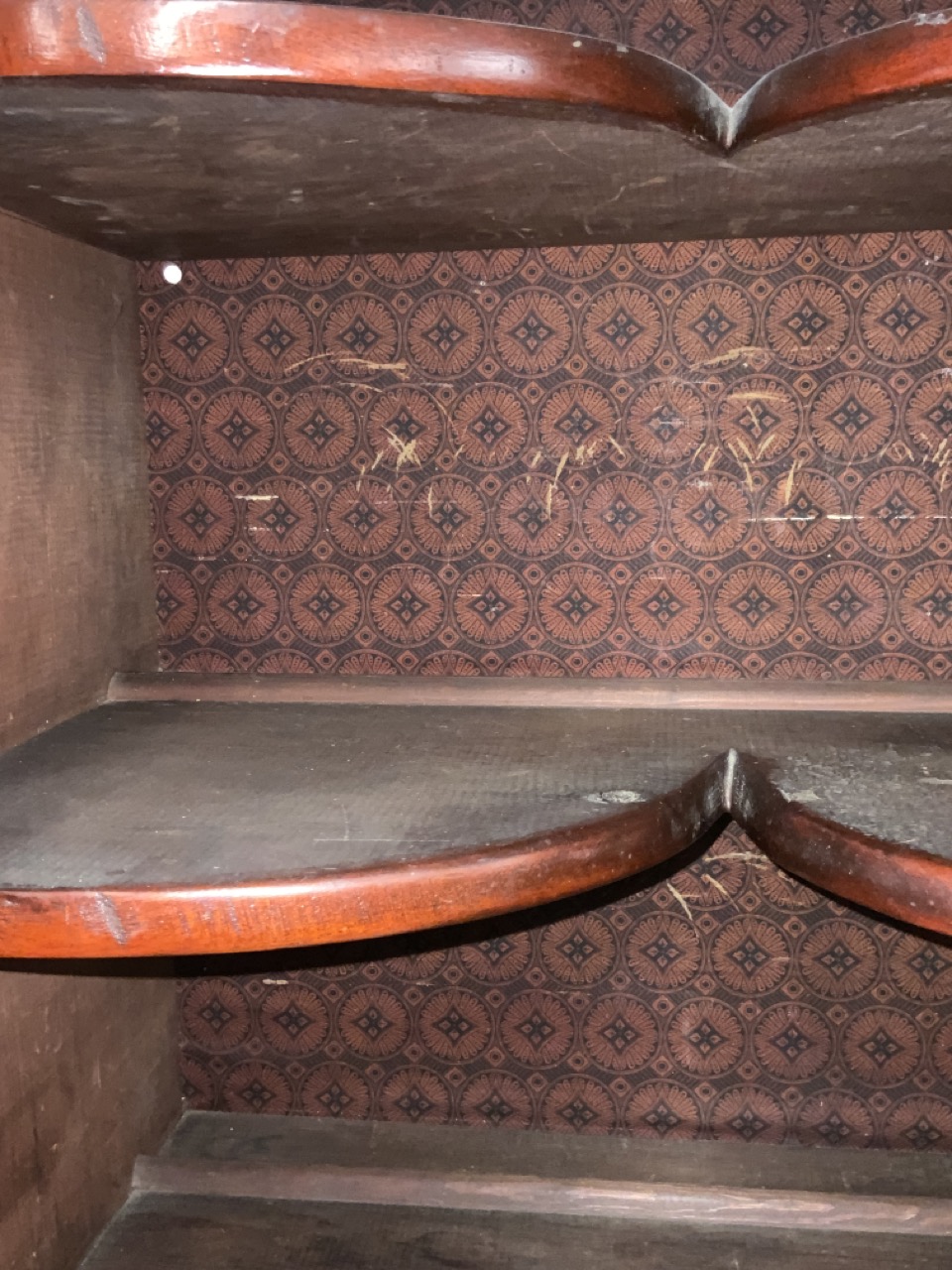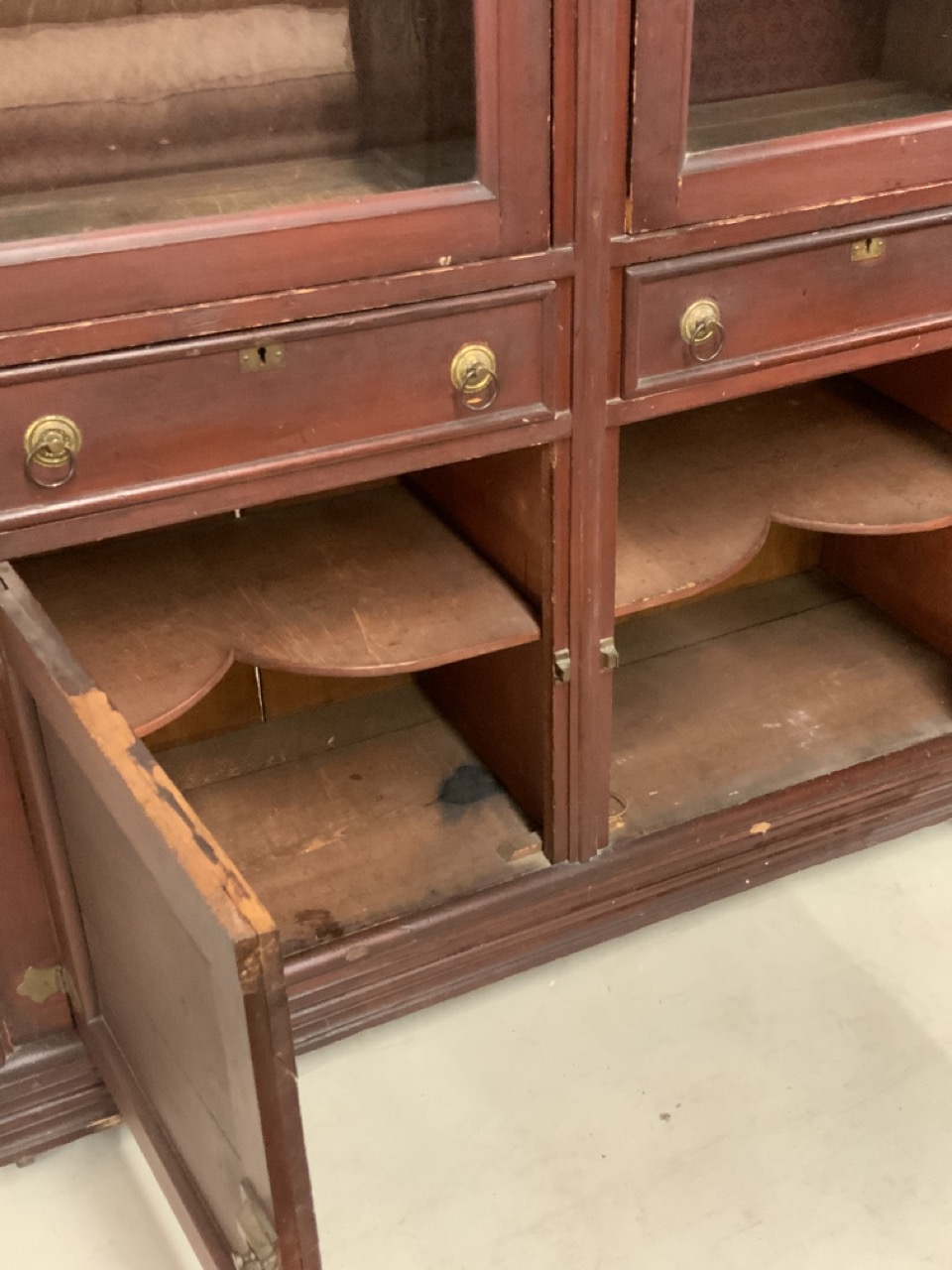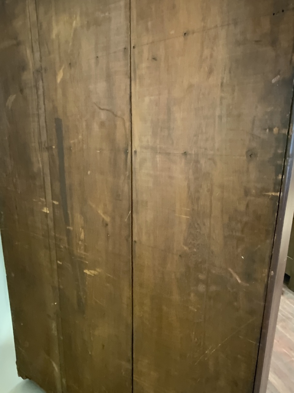 A handmade Americna pantry cabinet. C. 1870 made partially with shipping containers. A piece with good character. Red paint and brass hinges.