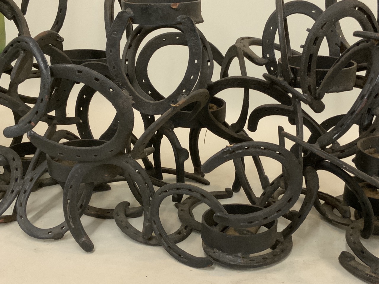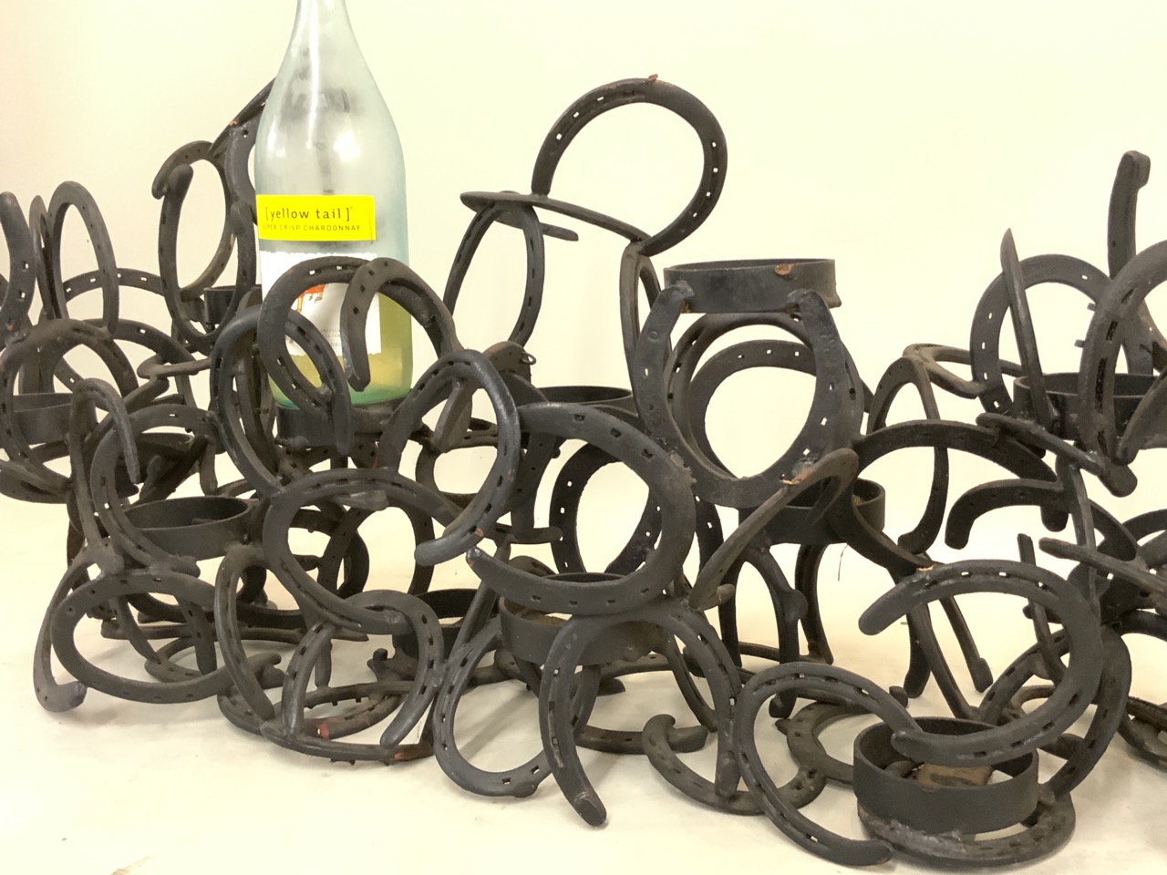 A whimsical cast iron horseshoe wine rack.