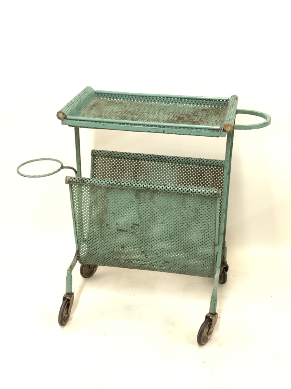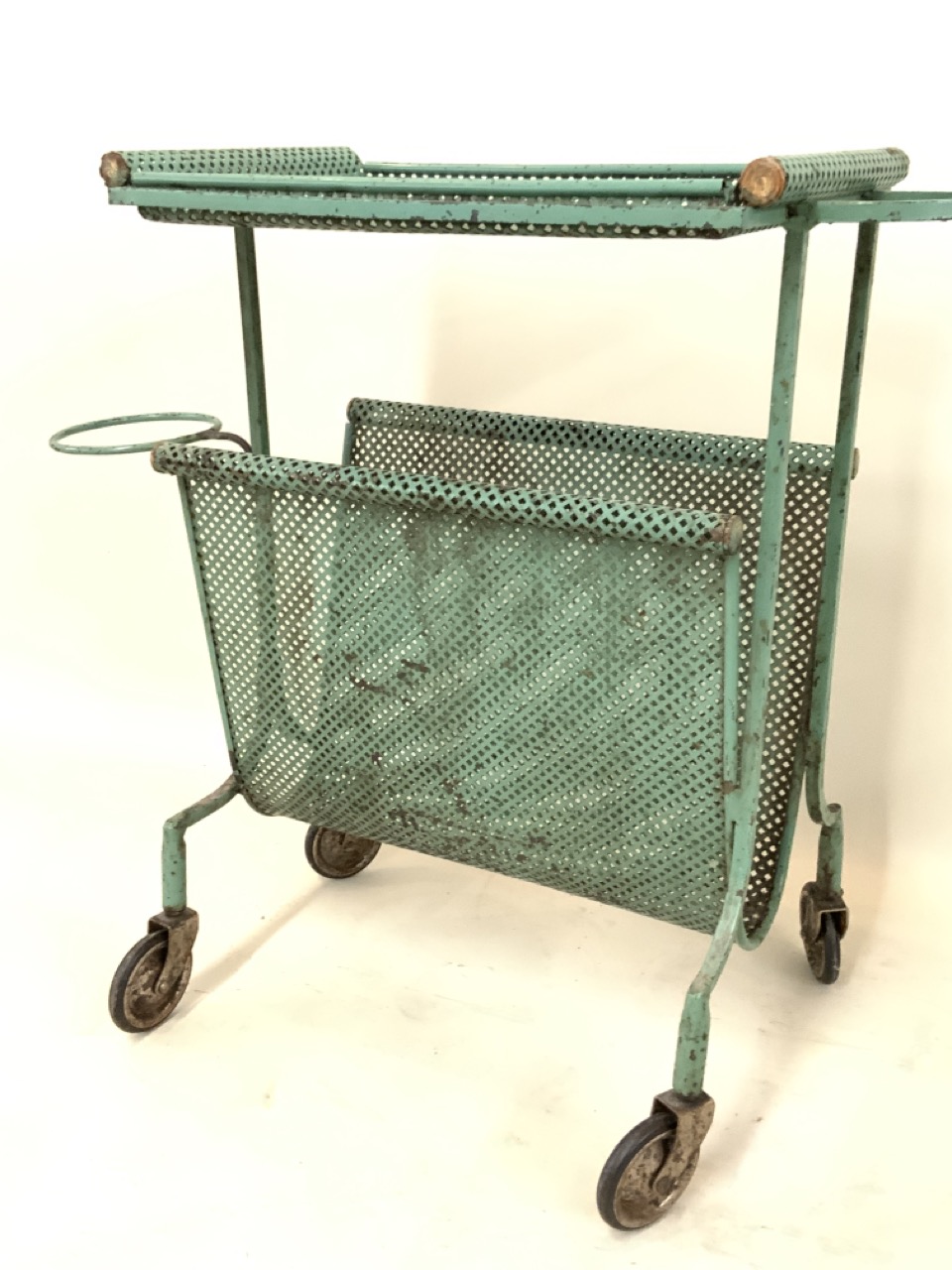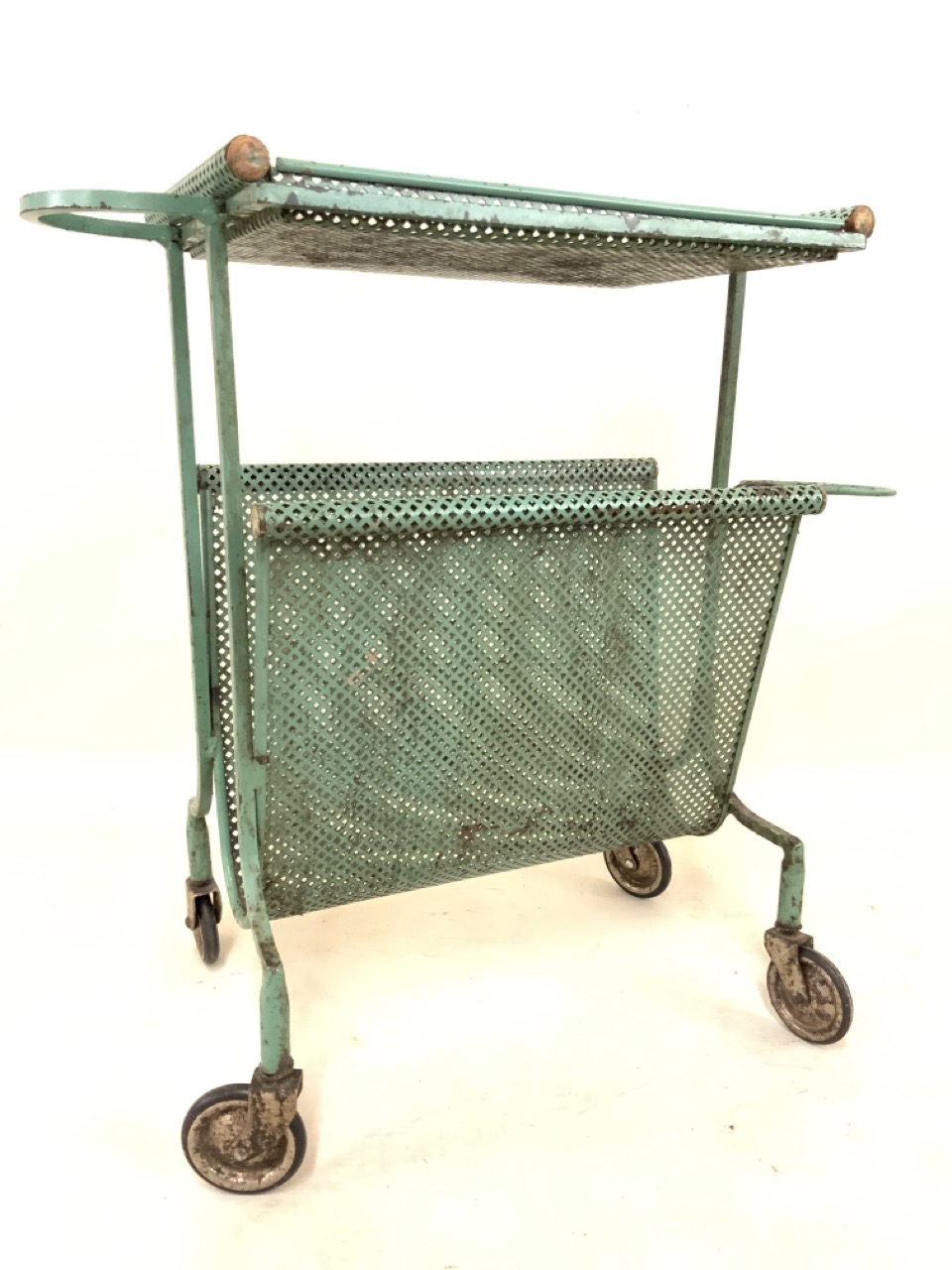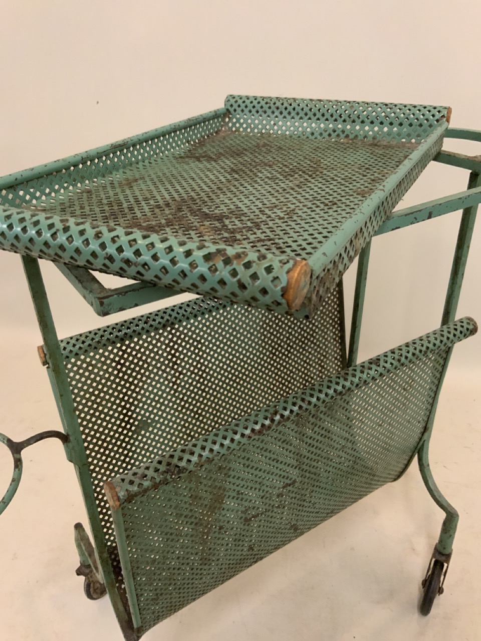 Wrough iron green utility style cart or bar cart with magazine rack set on castor wheels. Metal mesh shelving excellent condition.