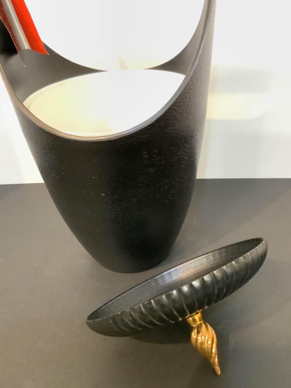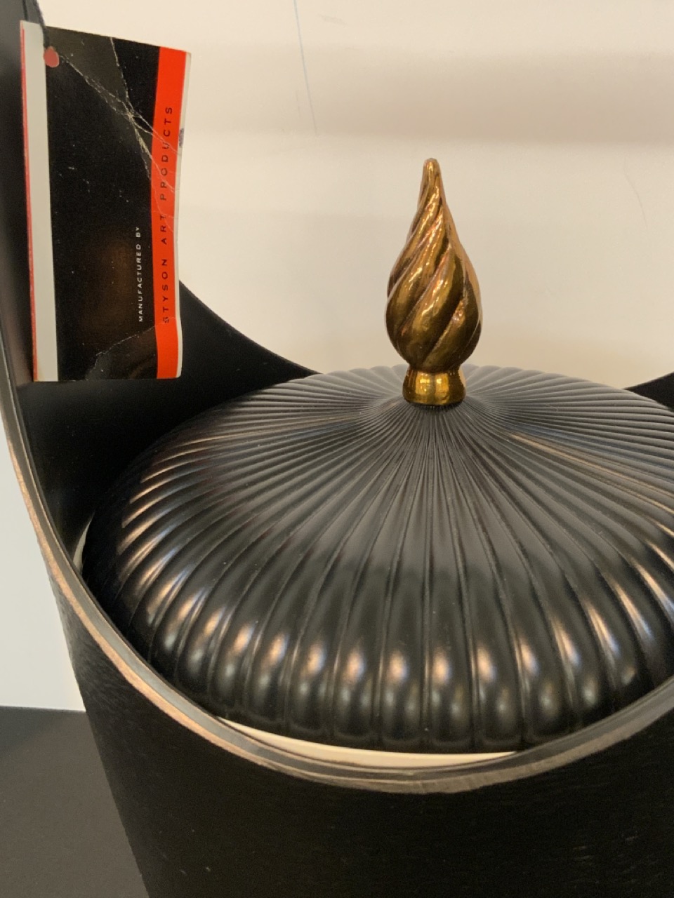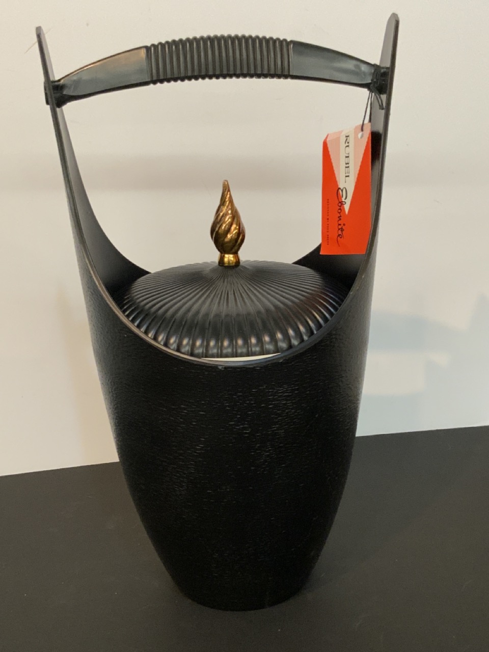 Fred Press Hollywood Regency style black ebonite ice bucket with flame finial top.