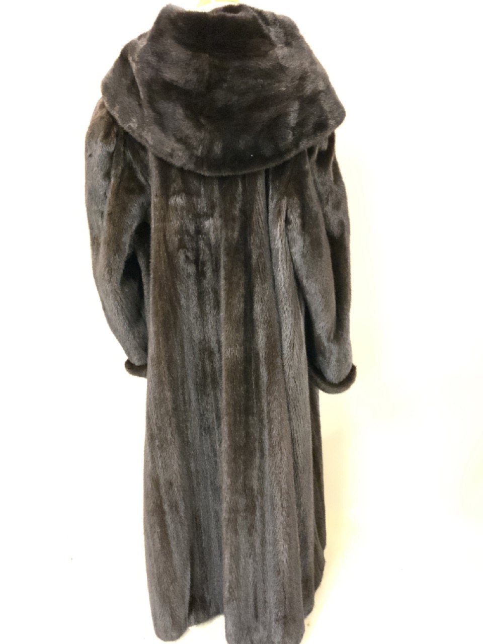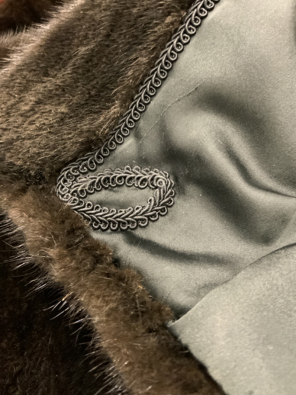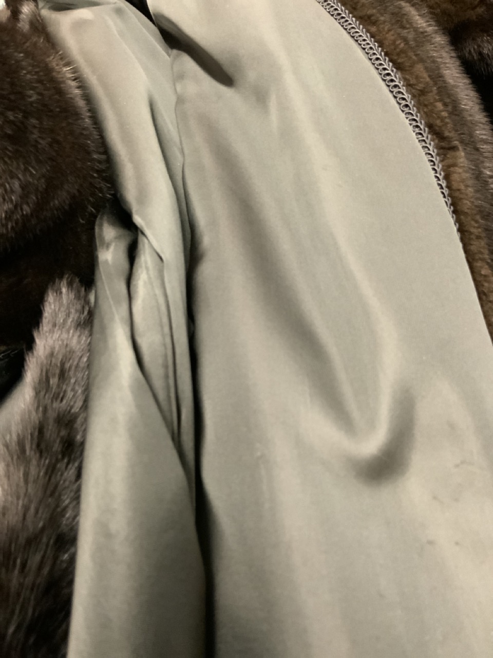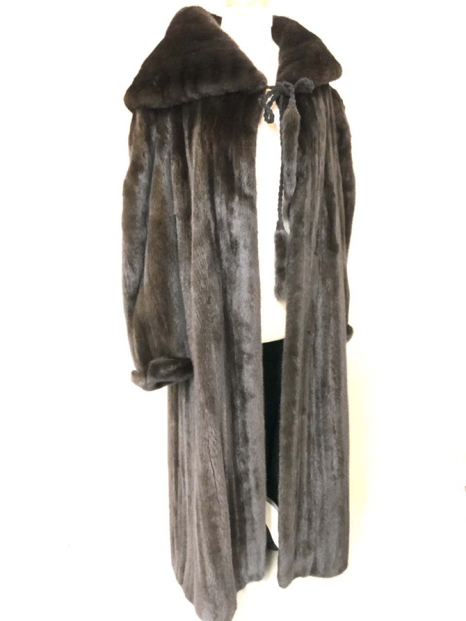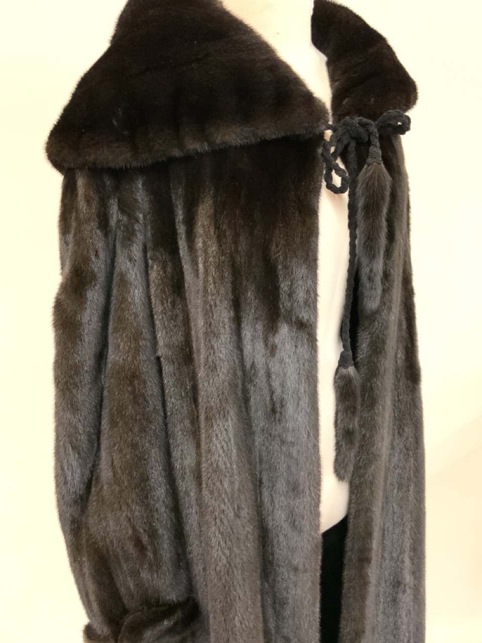 Full length mink cape/cloak style coat with tassle cord closure. Fine lining. Condition is excellent. No dryness, no wear, no tears. There is no monogramming in the interior.
