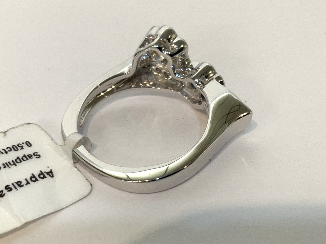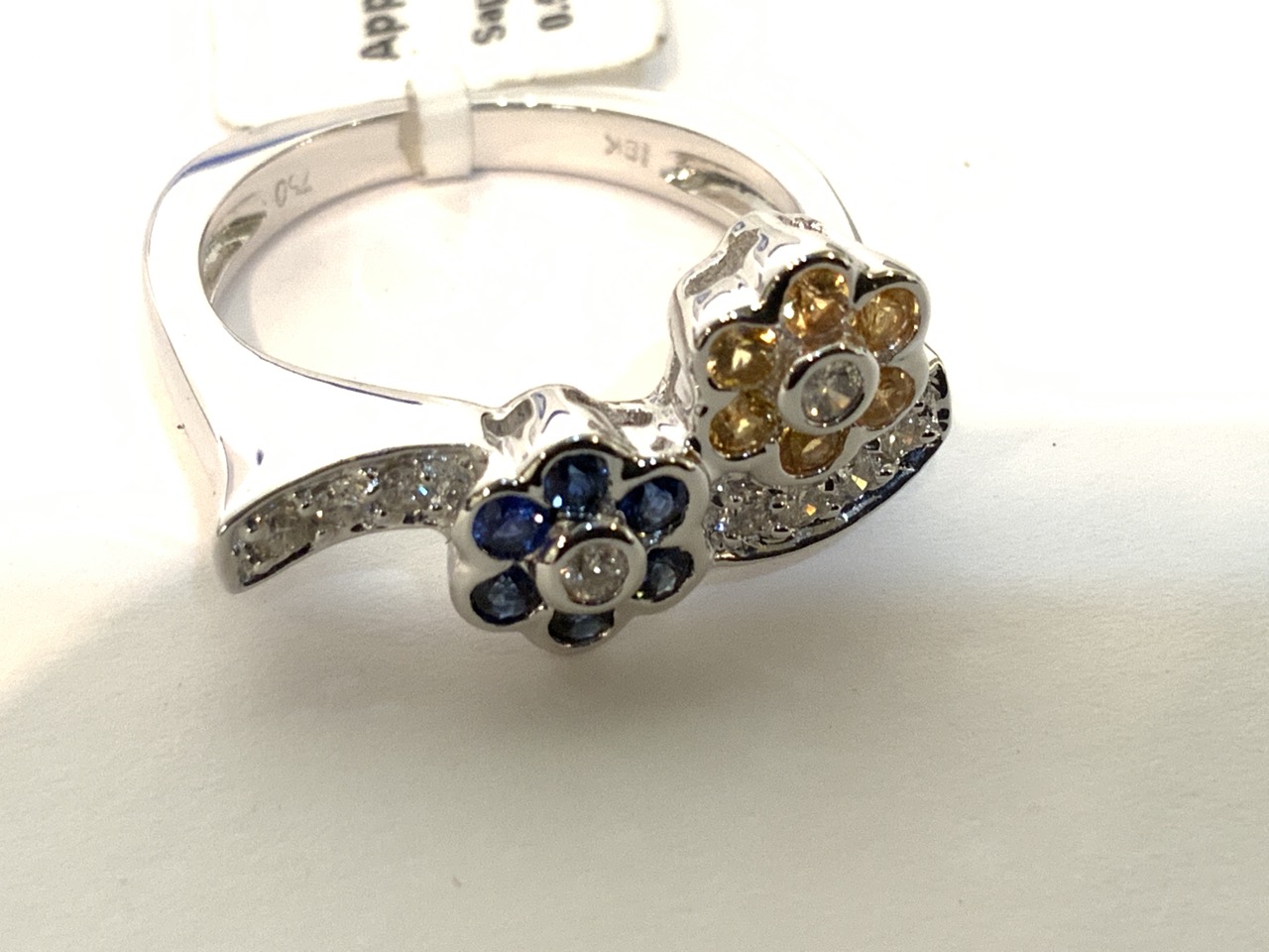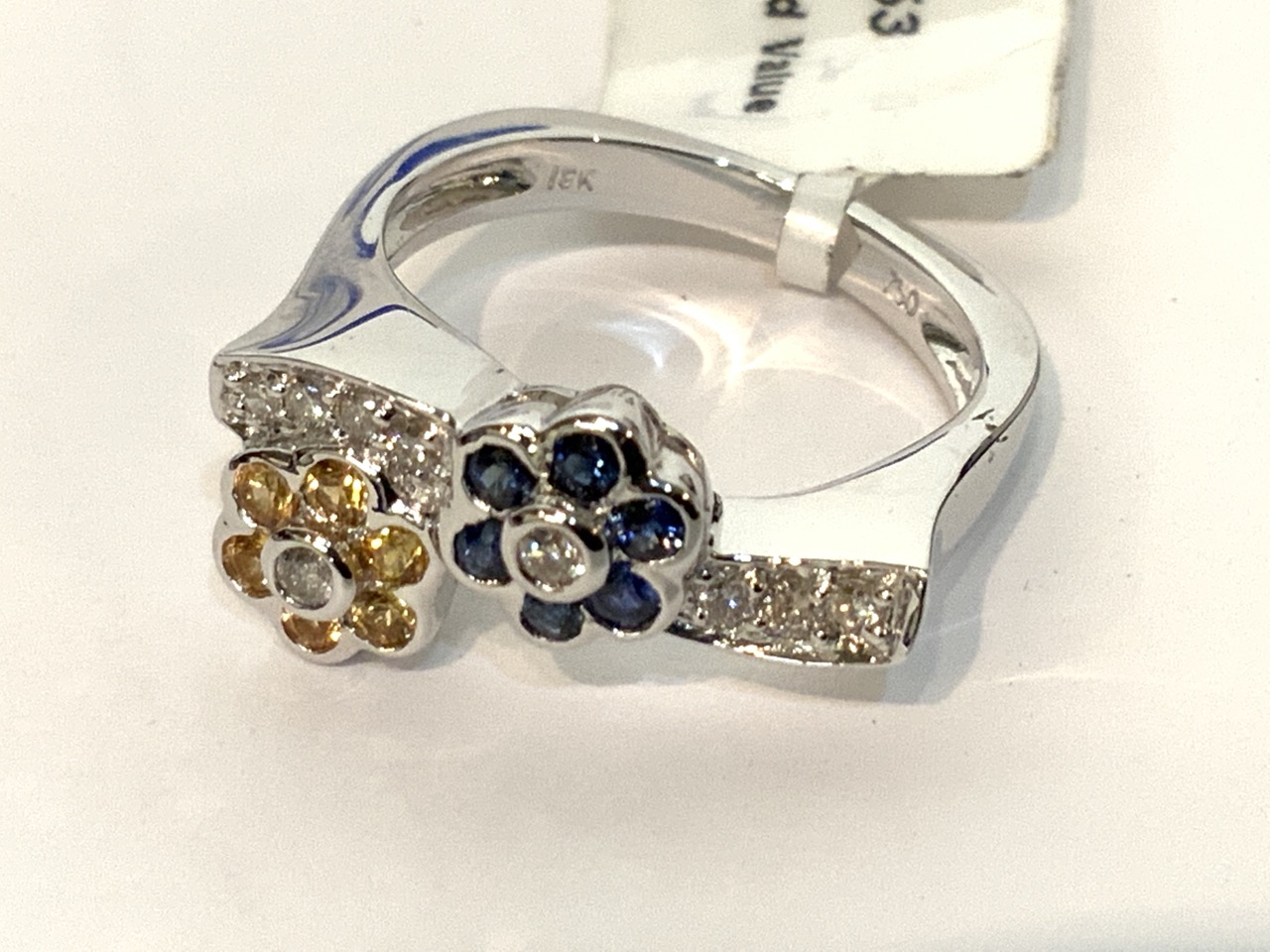 18k white gold sapphire and diamond ring. Twelve blue and yellow sapphires 2.00 X 1.30 mm .50 ct approx. weight and nine bead and bezel set round brilliant cut diamonds .22 ct approx. weight.