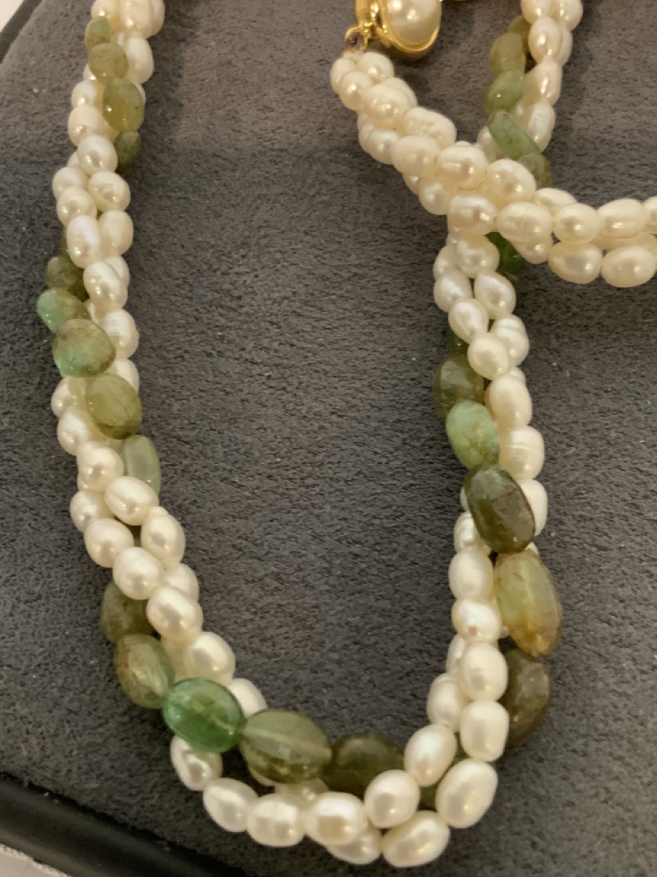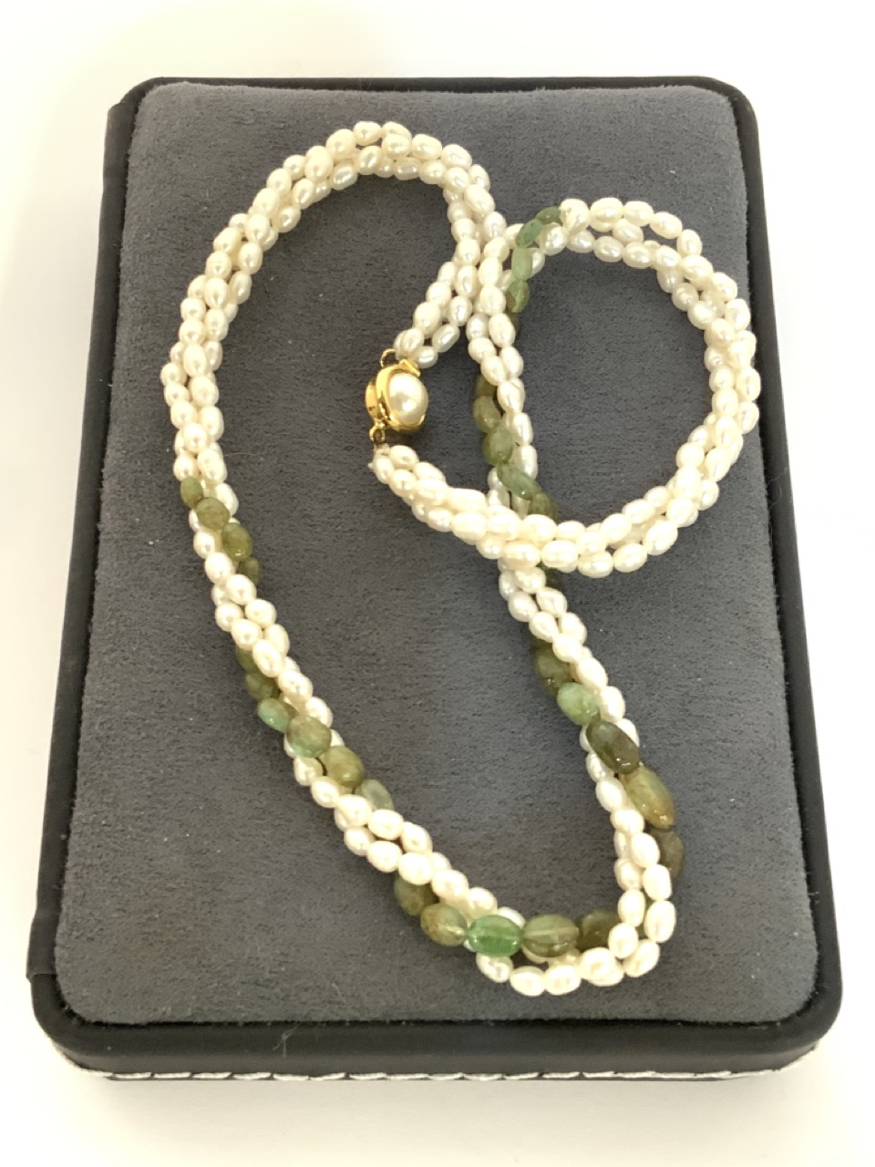 A triple strand freshwater pearl necklace. 3.5mm-5.5mm and graduated thirty-seven oval shaped natural emerald beads. Approx. 38.00ct. Naturally occuring. 19 3/4" length.