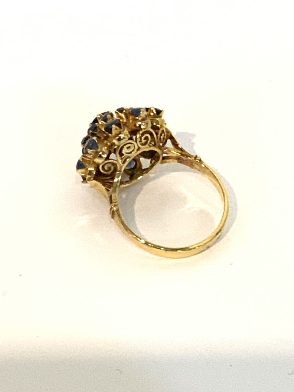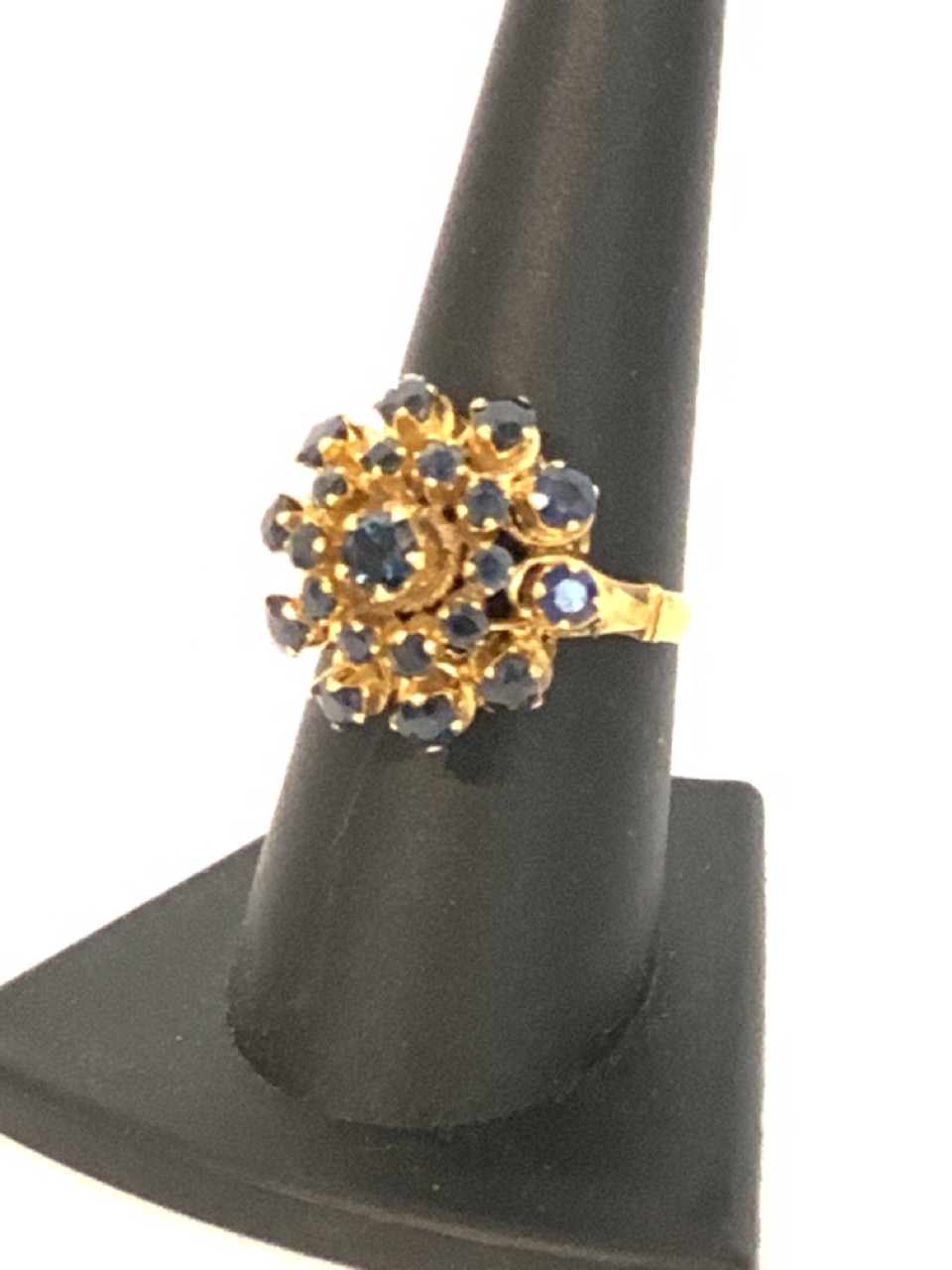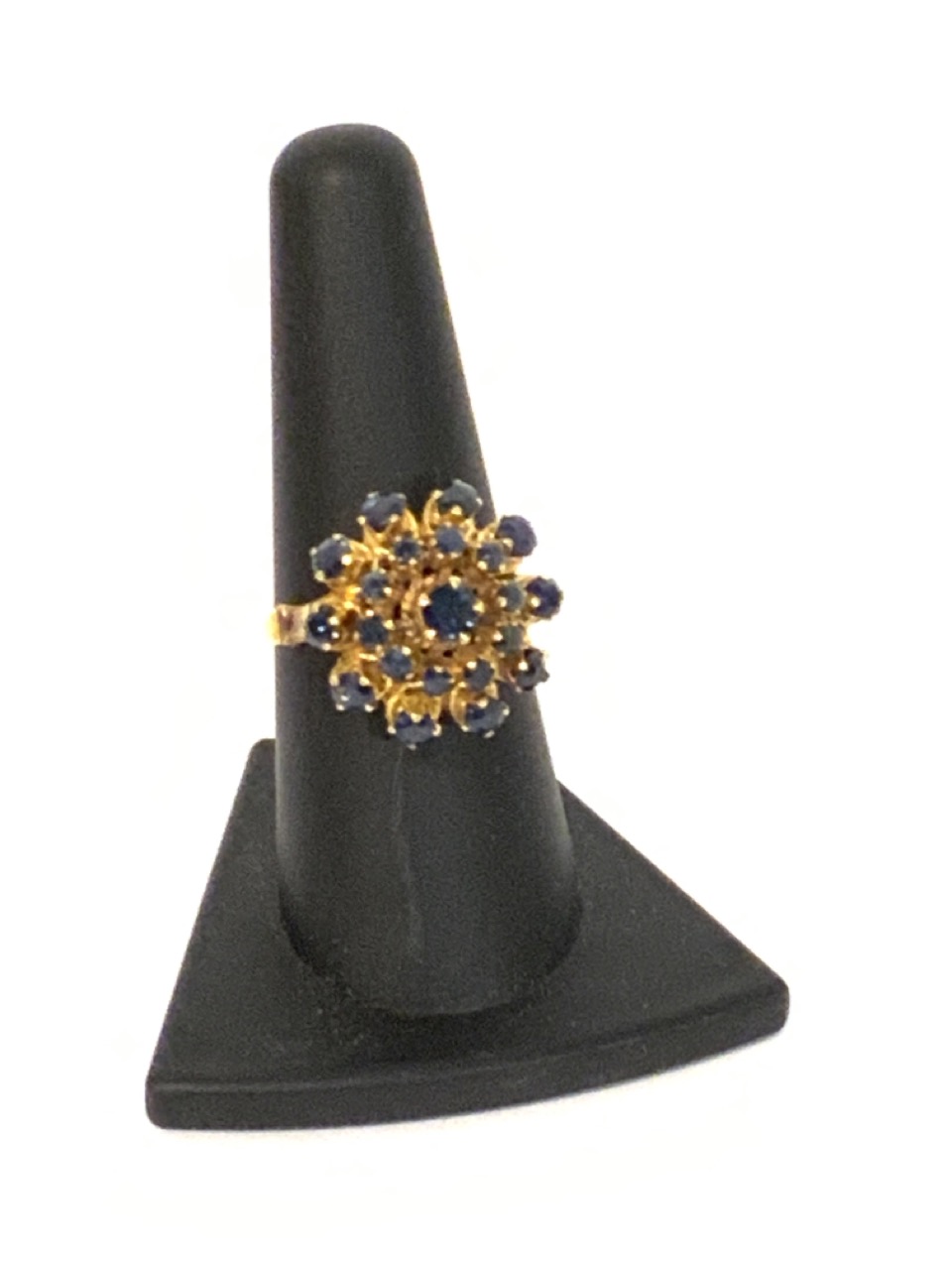 10k yellow gold cornflower blue sapphire cluster ring. 21 round sapphires. Size 8.