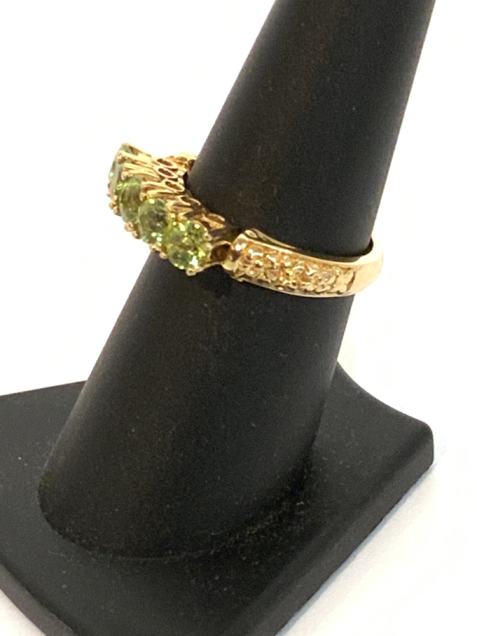 Five stone round peridot band style ring. 14k yellow gold. Stones approx. 4mm.