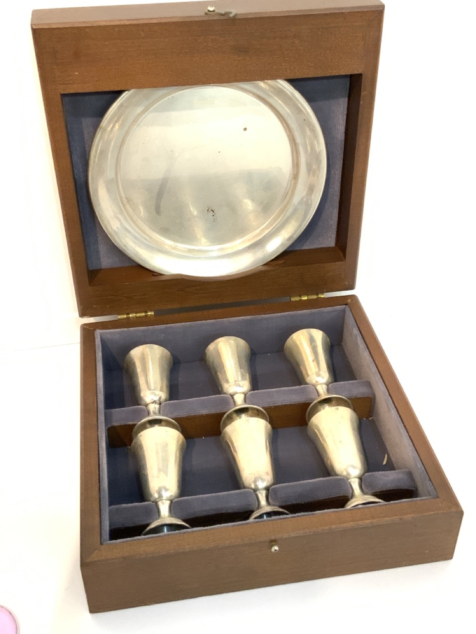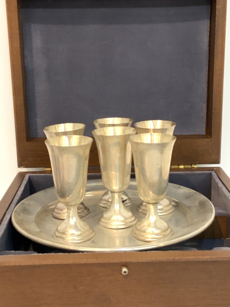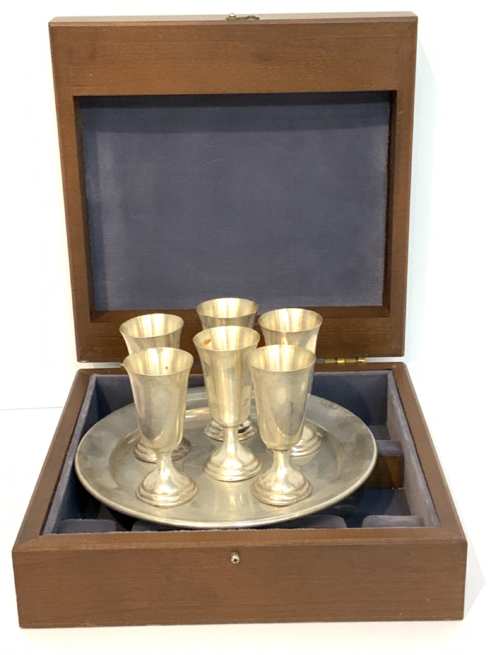 Tuttle sterling silver cordial glasses and tray. Housed in custom wood storage box.