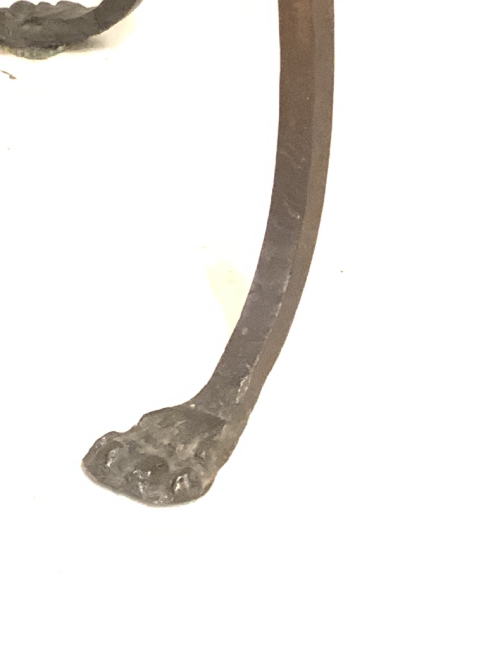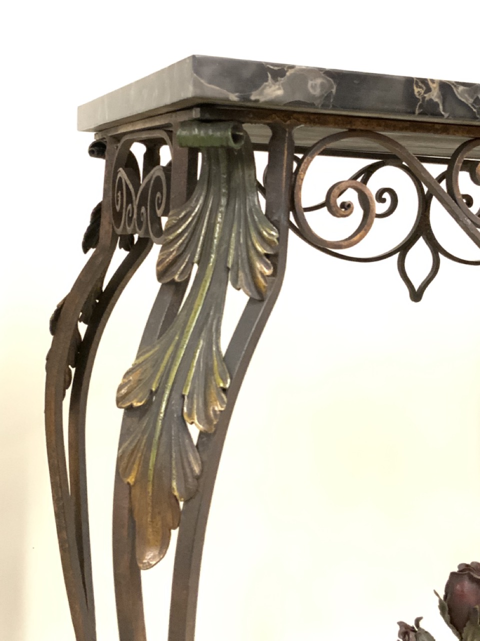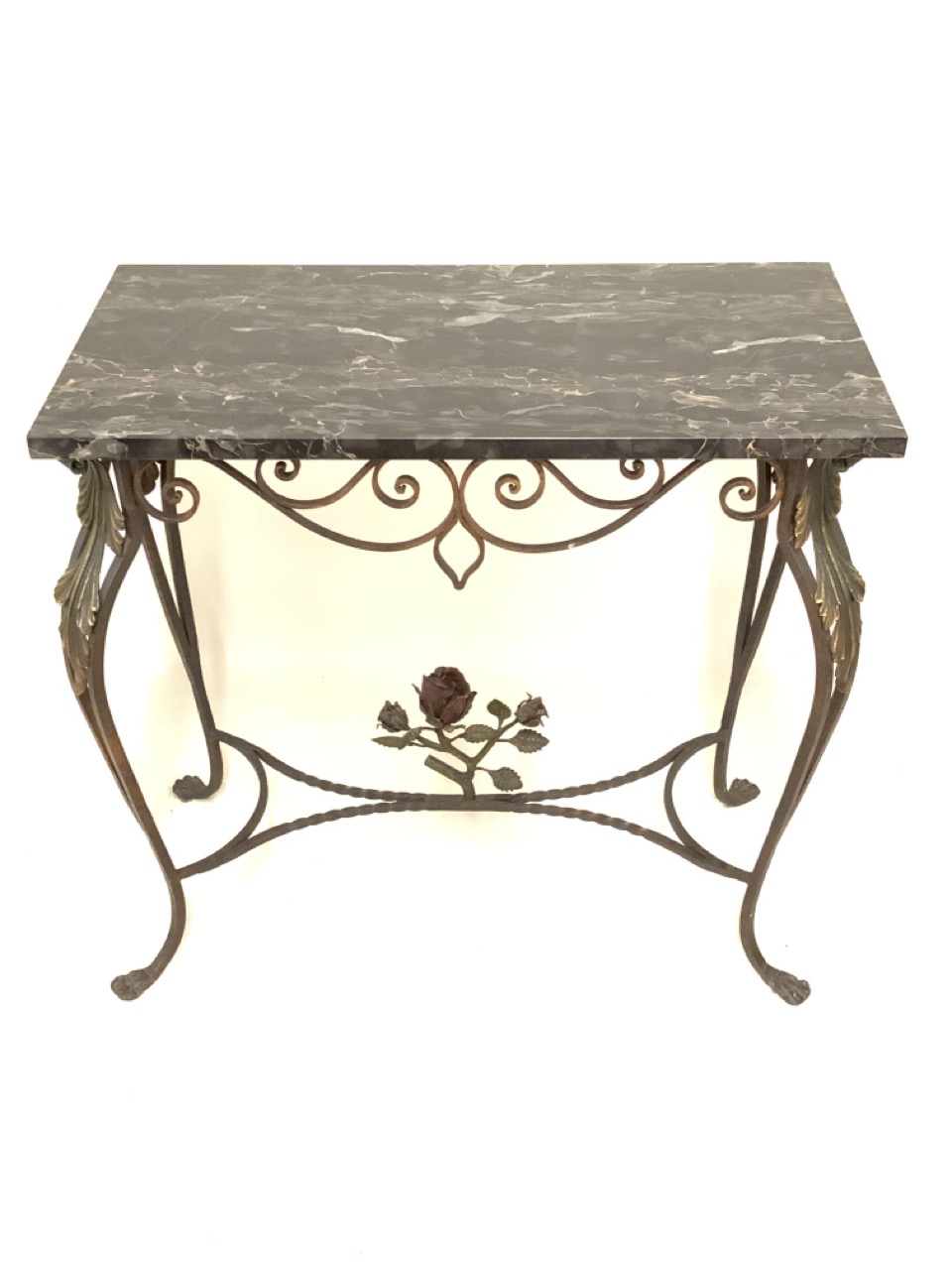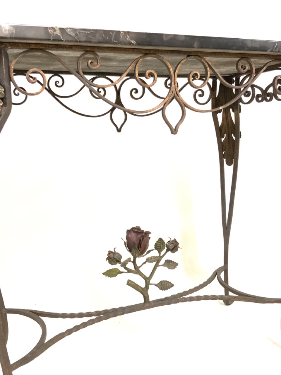The finest example we have hand for a hand wrought iron marble table with painted red rose finial centering stretcher and green foliage decorated on legs. Excellent condition. Family owned pieces from inception, New York City early 20th century.