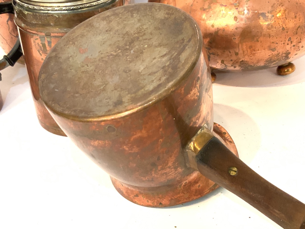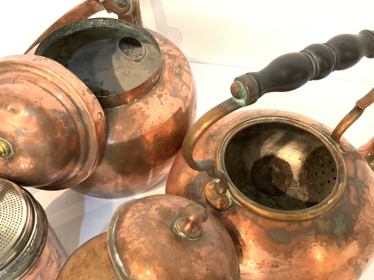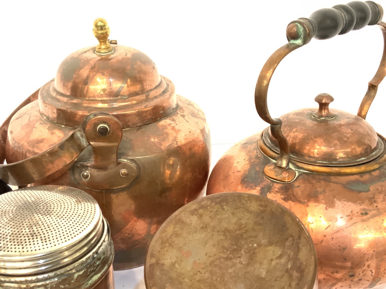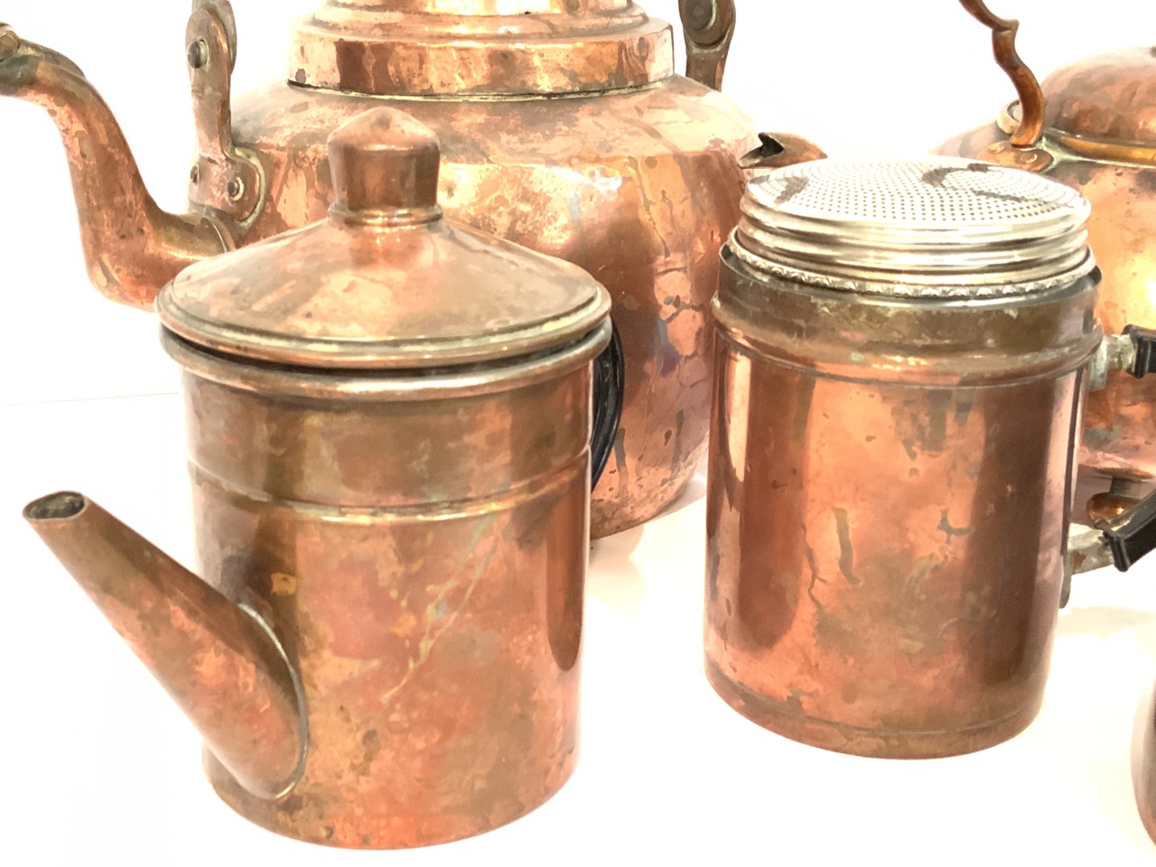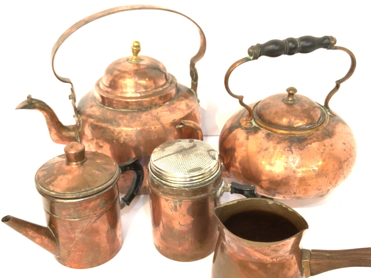 Five piece copper cookware including tea kettles, porringer, sugar shaker etc.