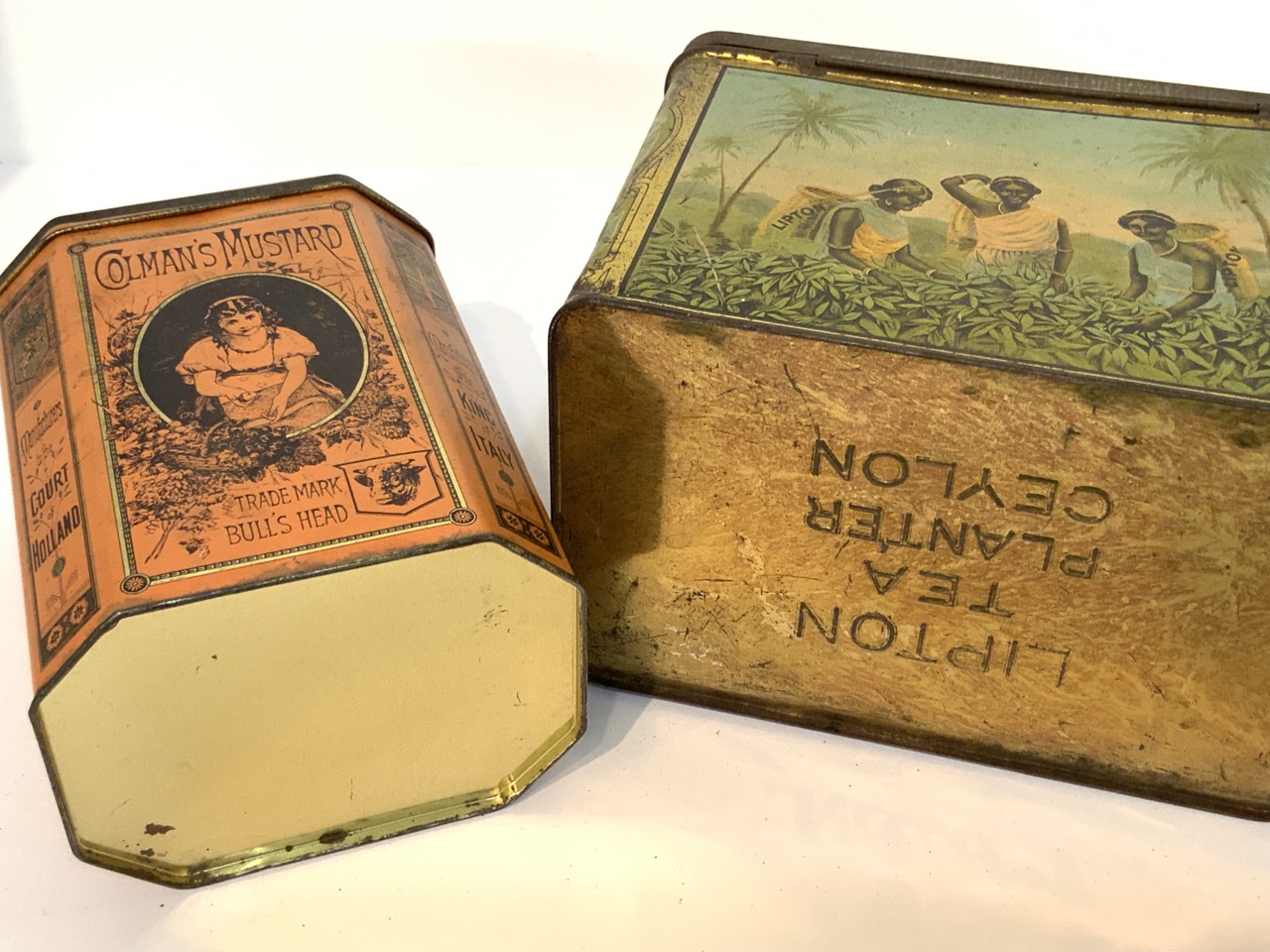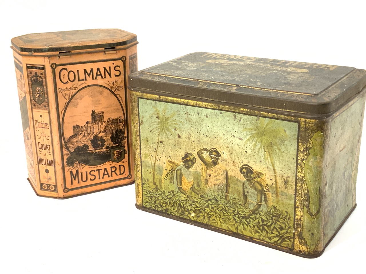 Two advertising tins for Coleman's Mustard and Thomas J. Lipton Tea.