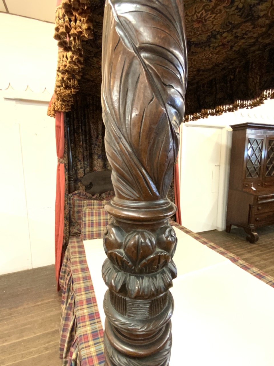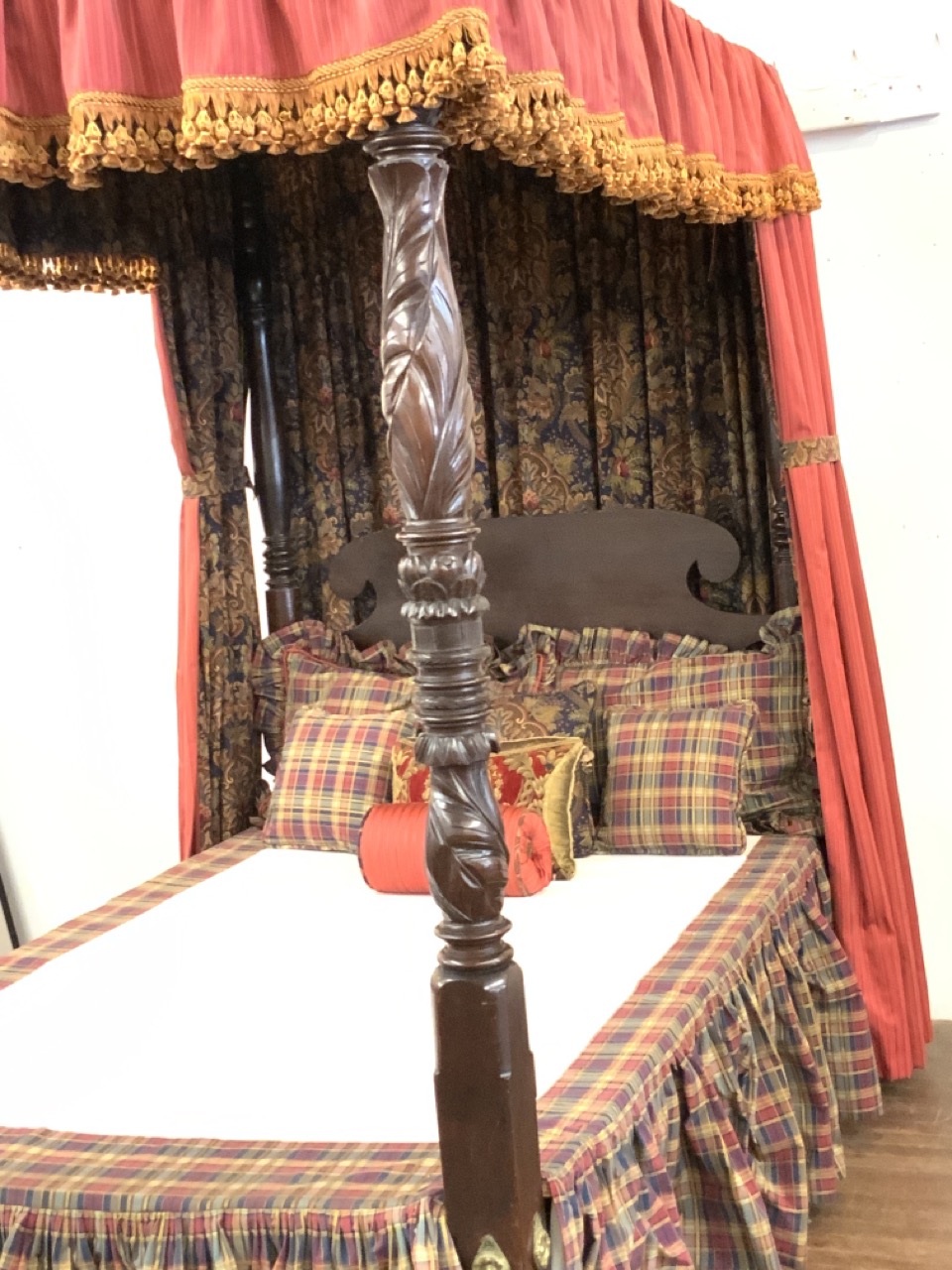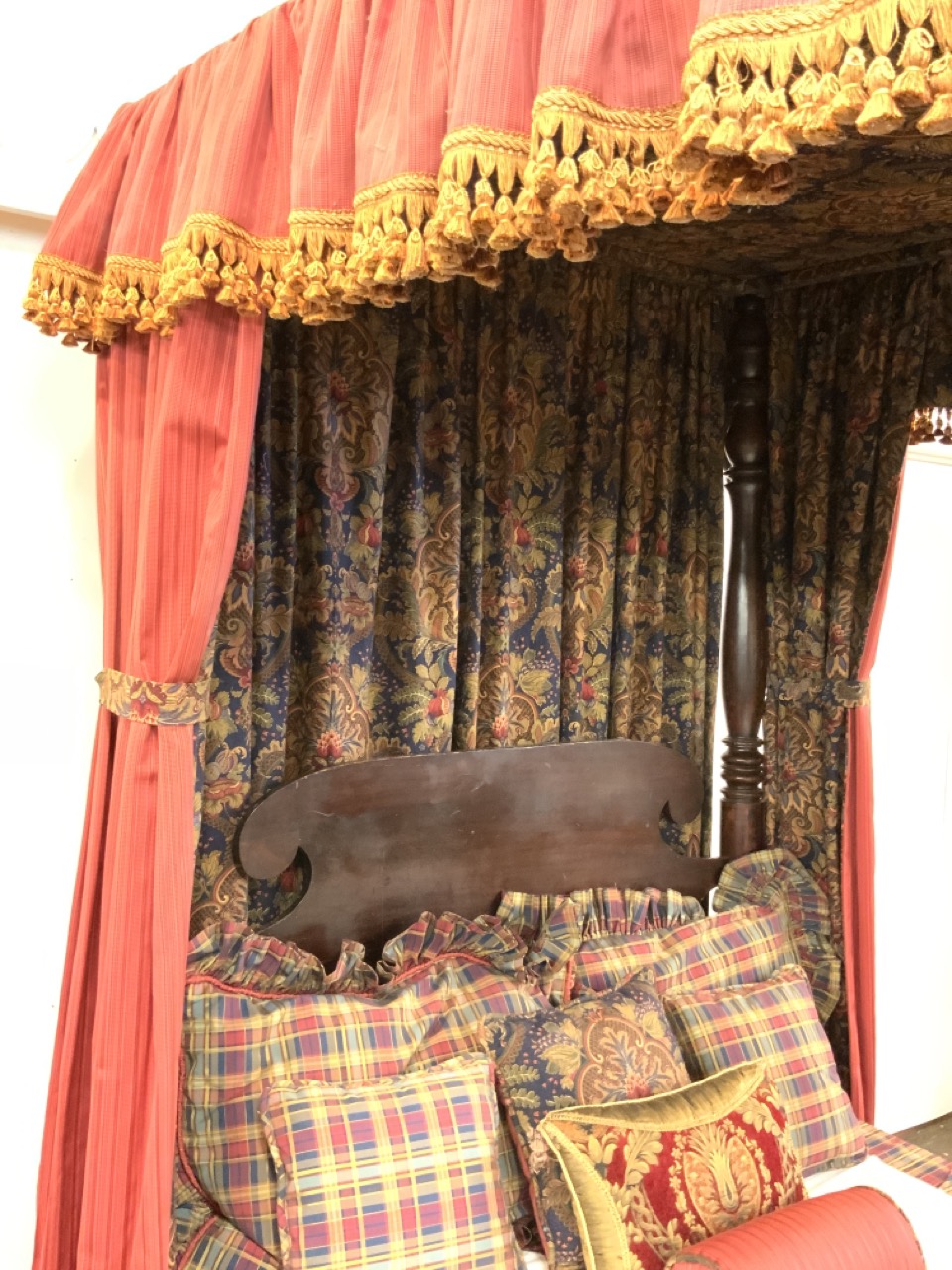 Empire carved mahogany four poster Tester bed. Custom made fabrics, pillows bedding as seen included.