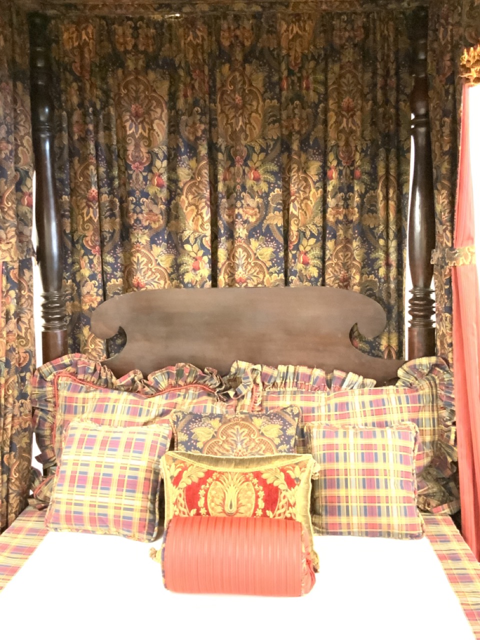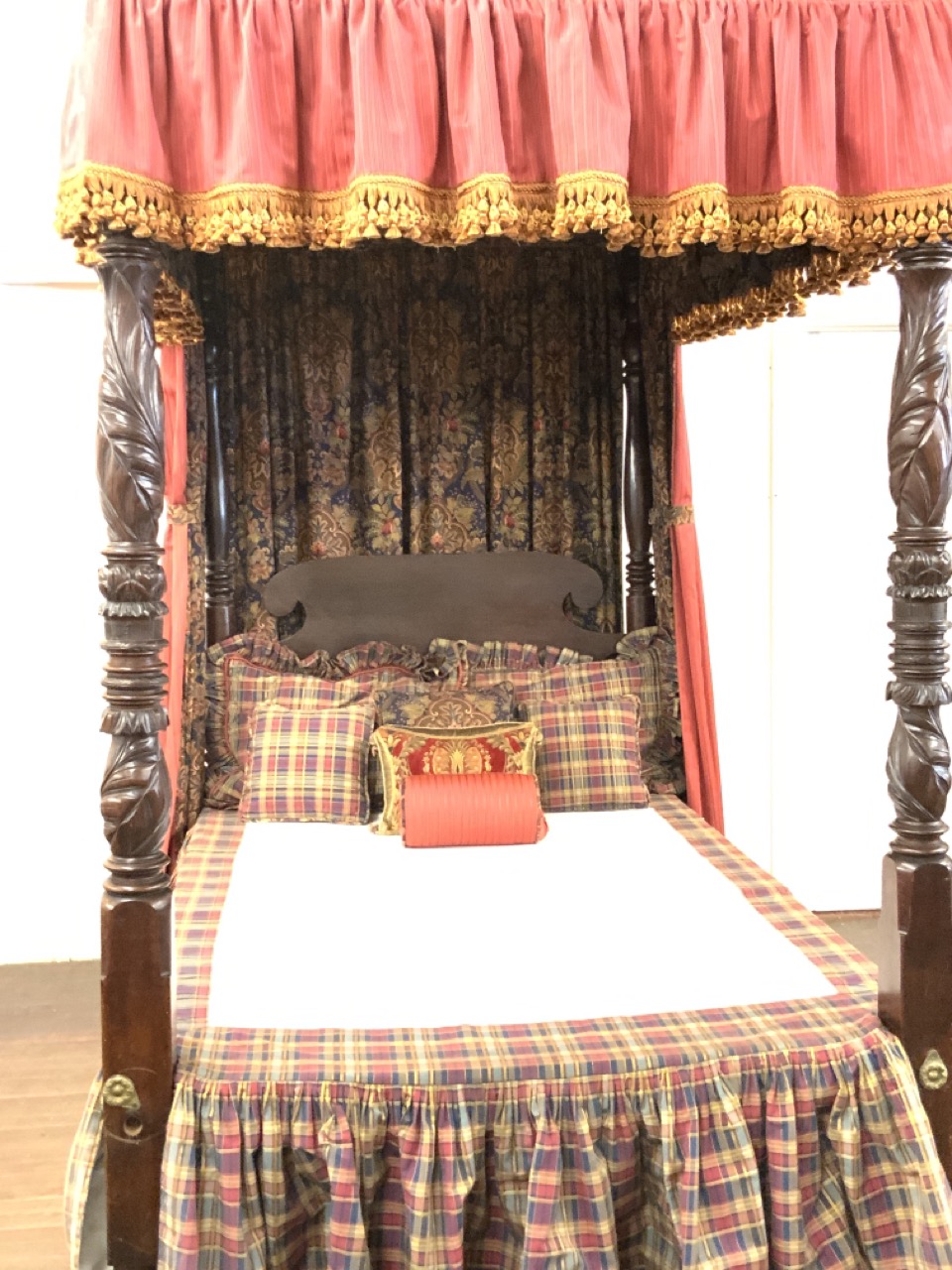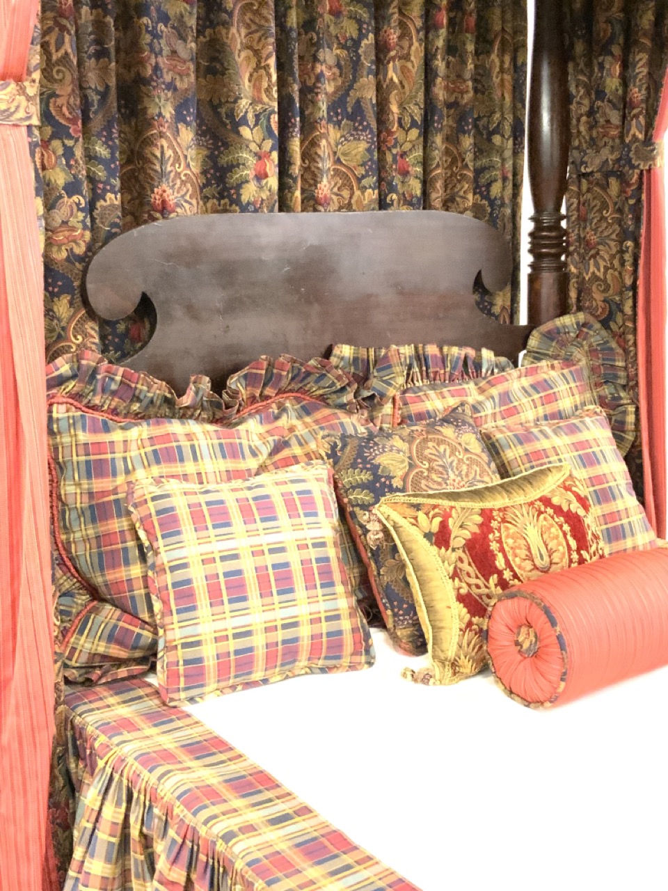 Empire carved mahogany four poster Tester bed. Custom made fabrics, pillows bedding as seen included.