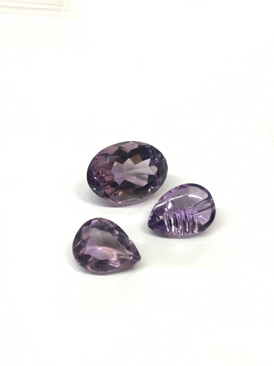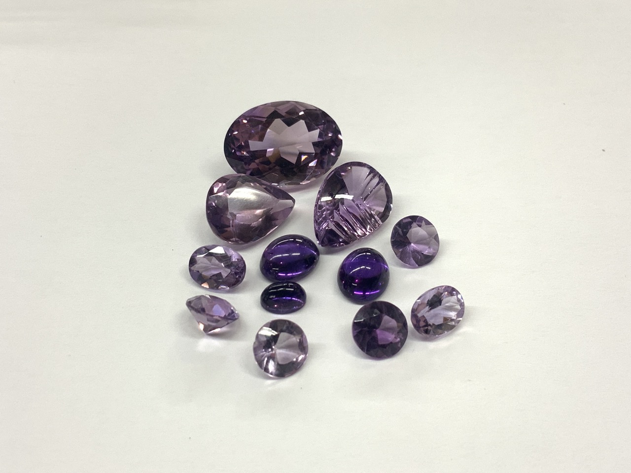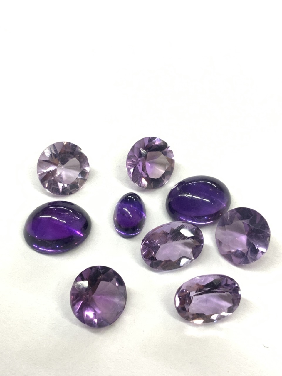 Four pairs of amethyst round and ovals, 1 fancy cut pear, 1 lg. oval, 1 pear shape and 1 small lab created. As see in photograph preview.