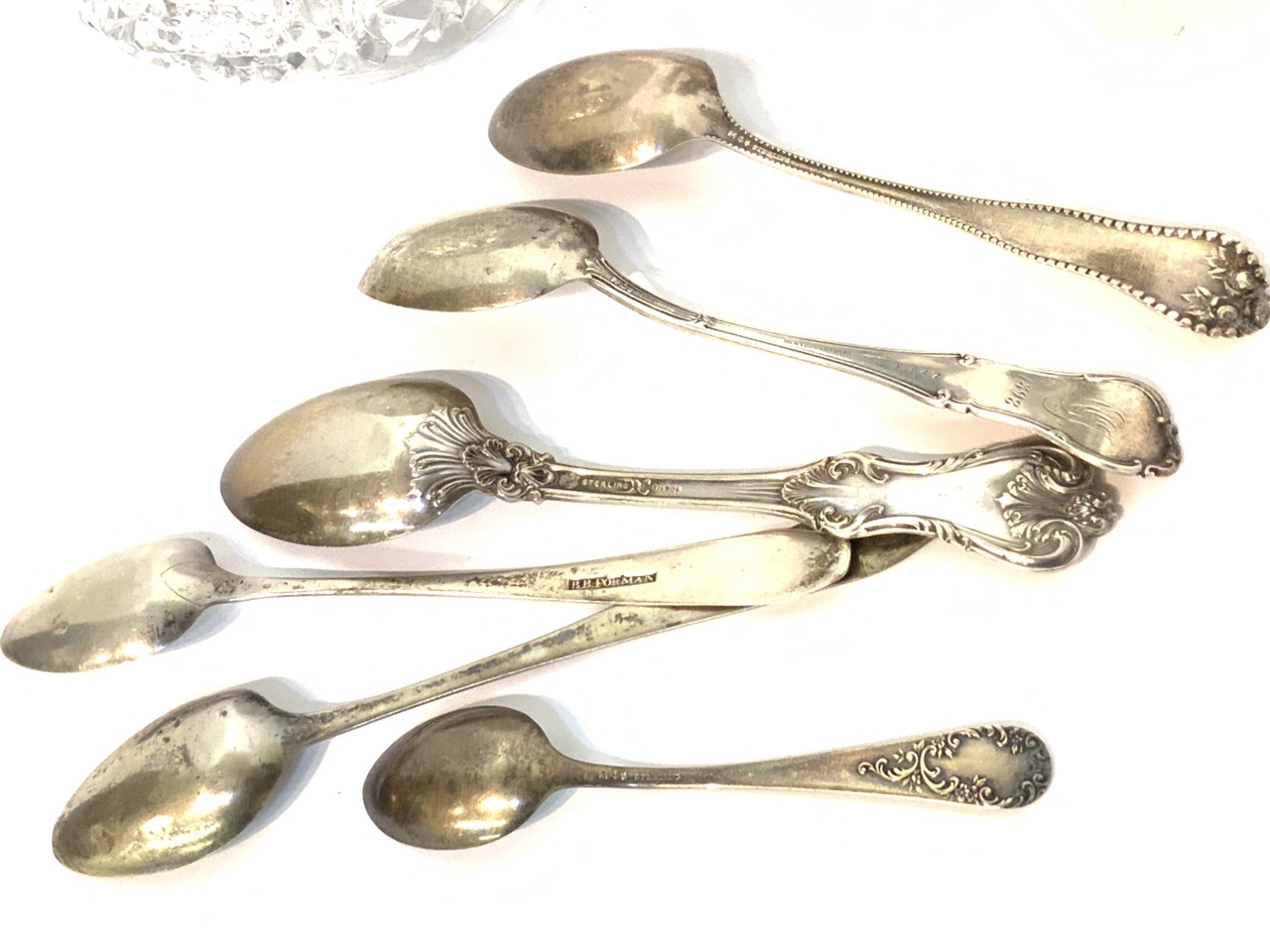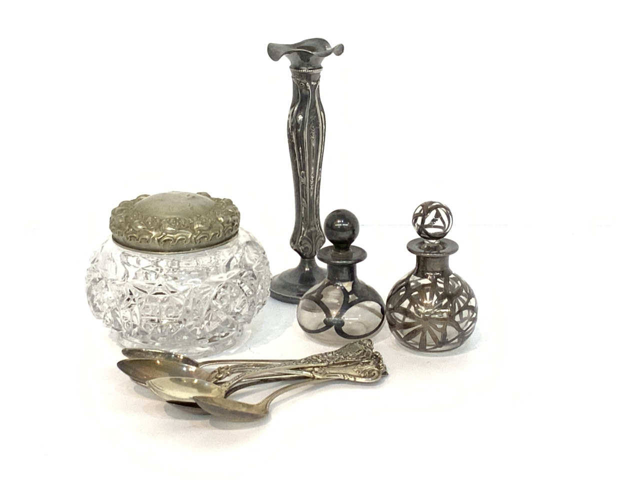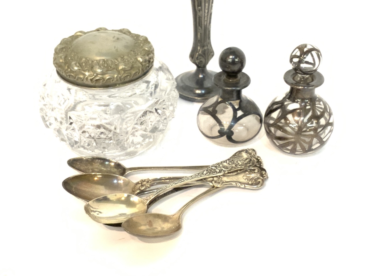 A compiled grouping of sterling silver flatware, perfumes and cut glass dresser jar with silver plated lid. Silver weight in excess of 3.4 avg. oz.