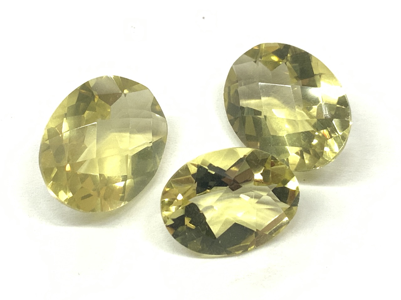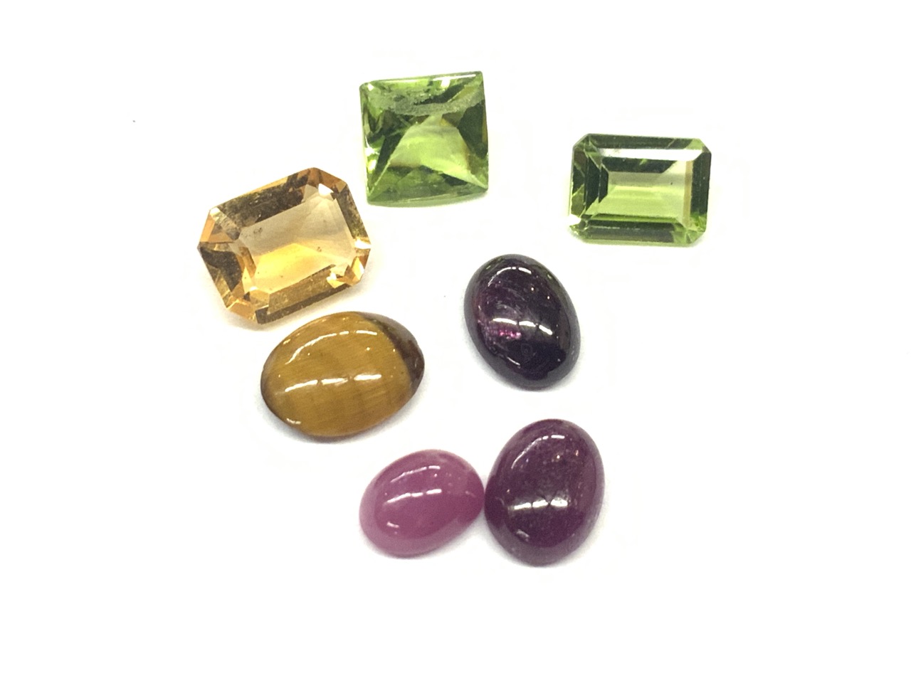 Assorted gemstones grouping. Green quartz, peridot, citrine, Cabochon ruby, Tiger's eye, yellow quartz etc.