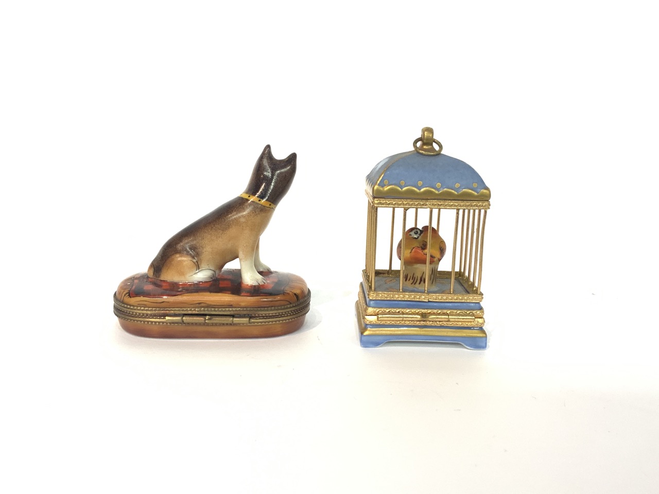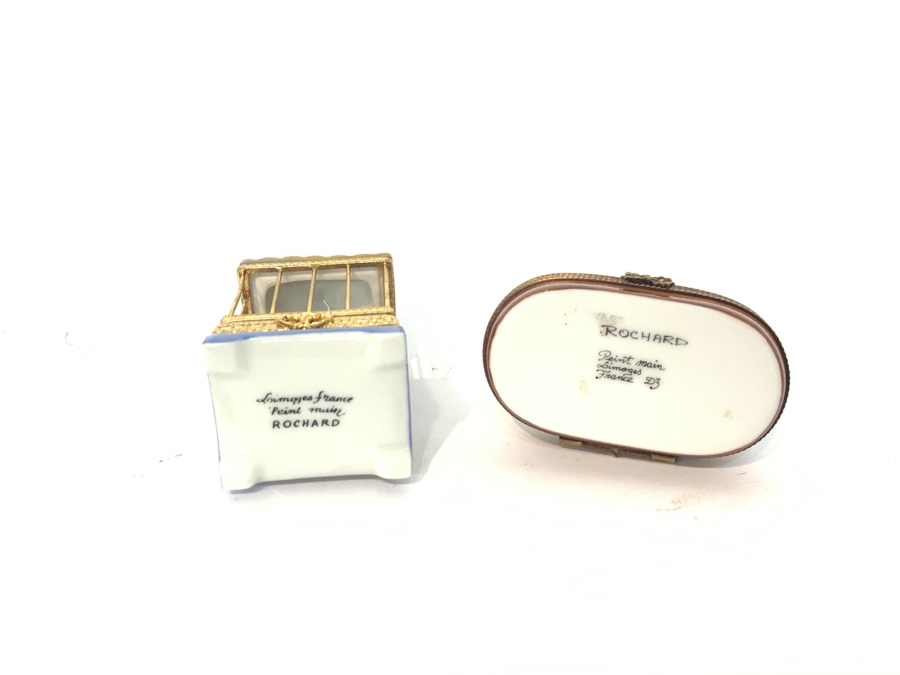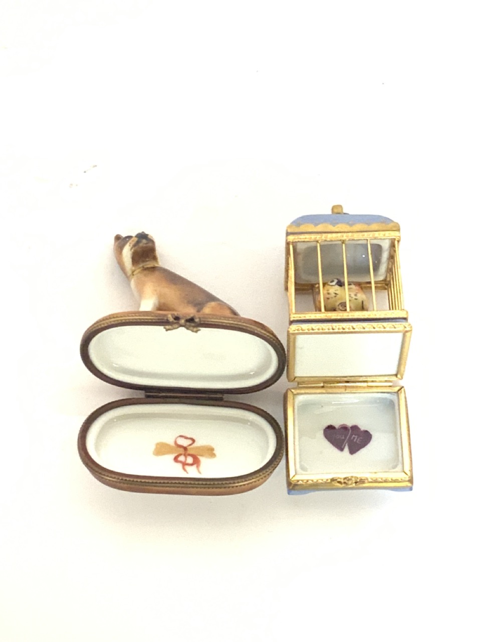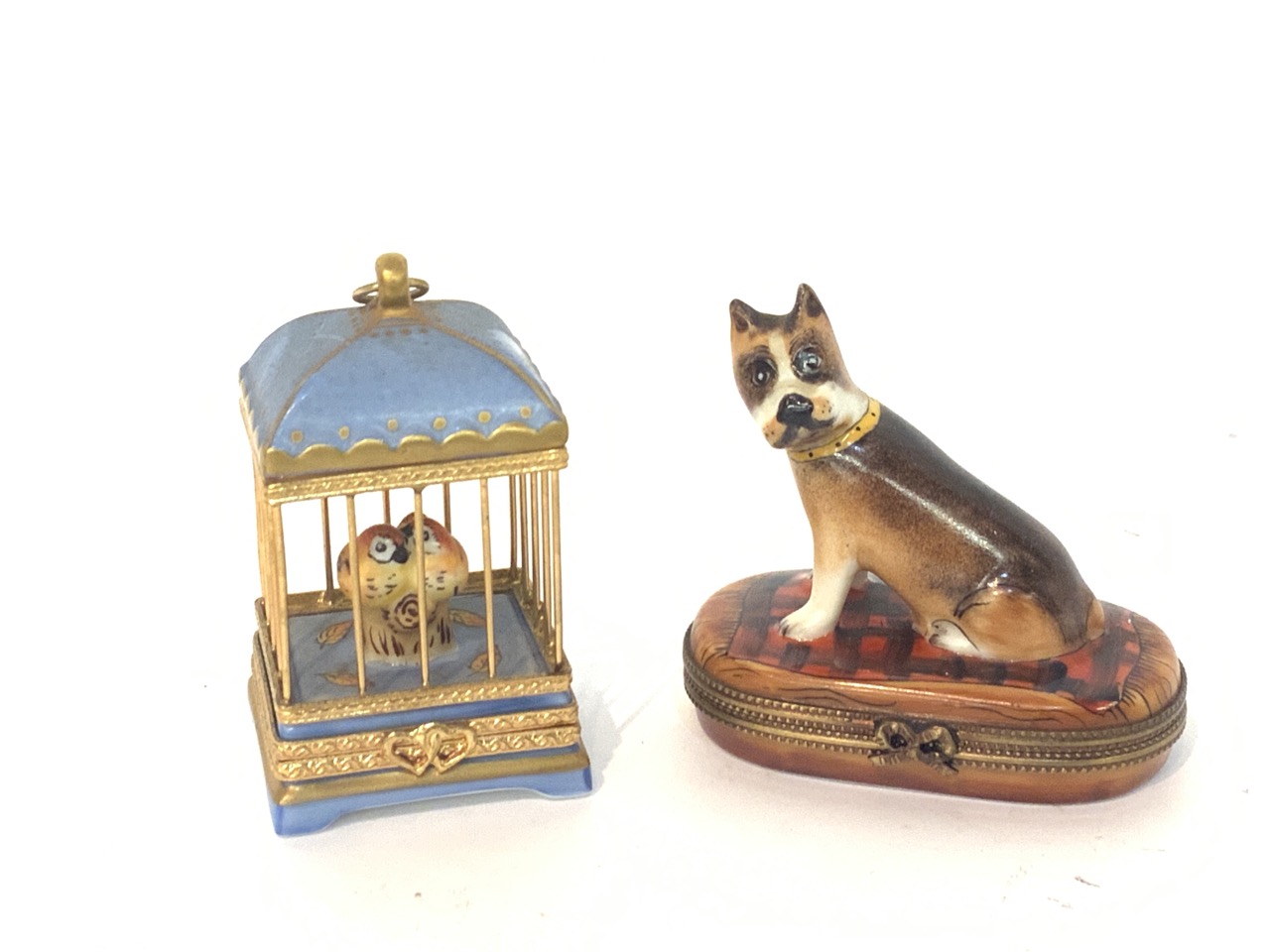 Limoges Rochard minature porcelain boxes. Bird cage and dog.