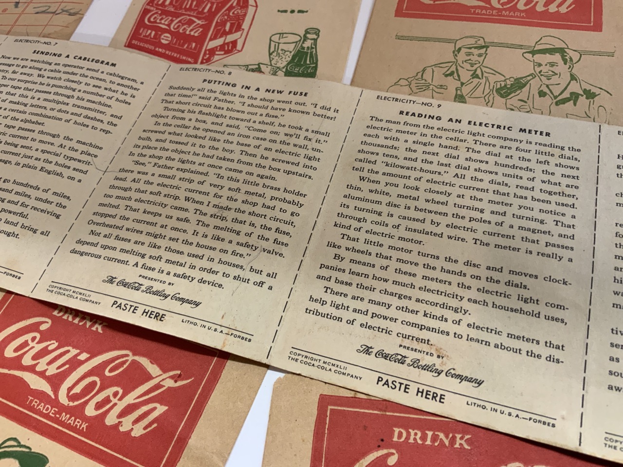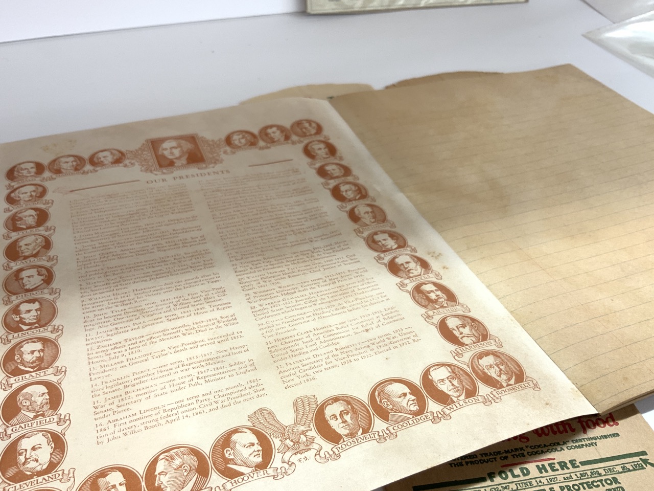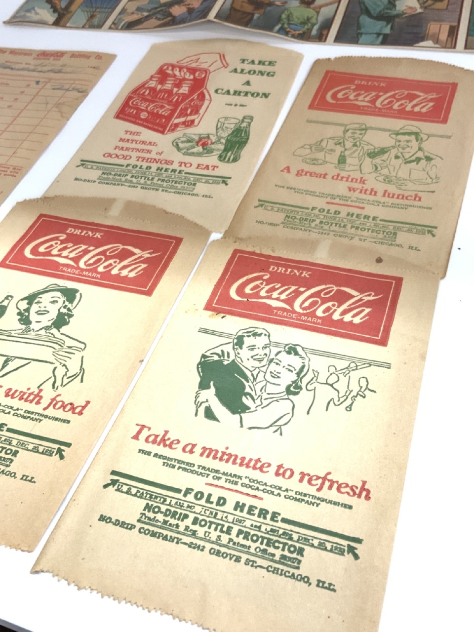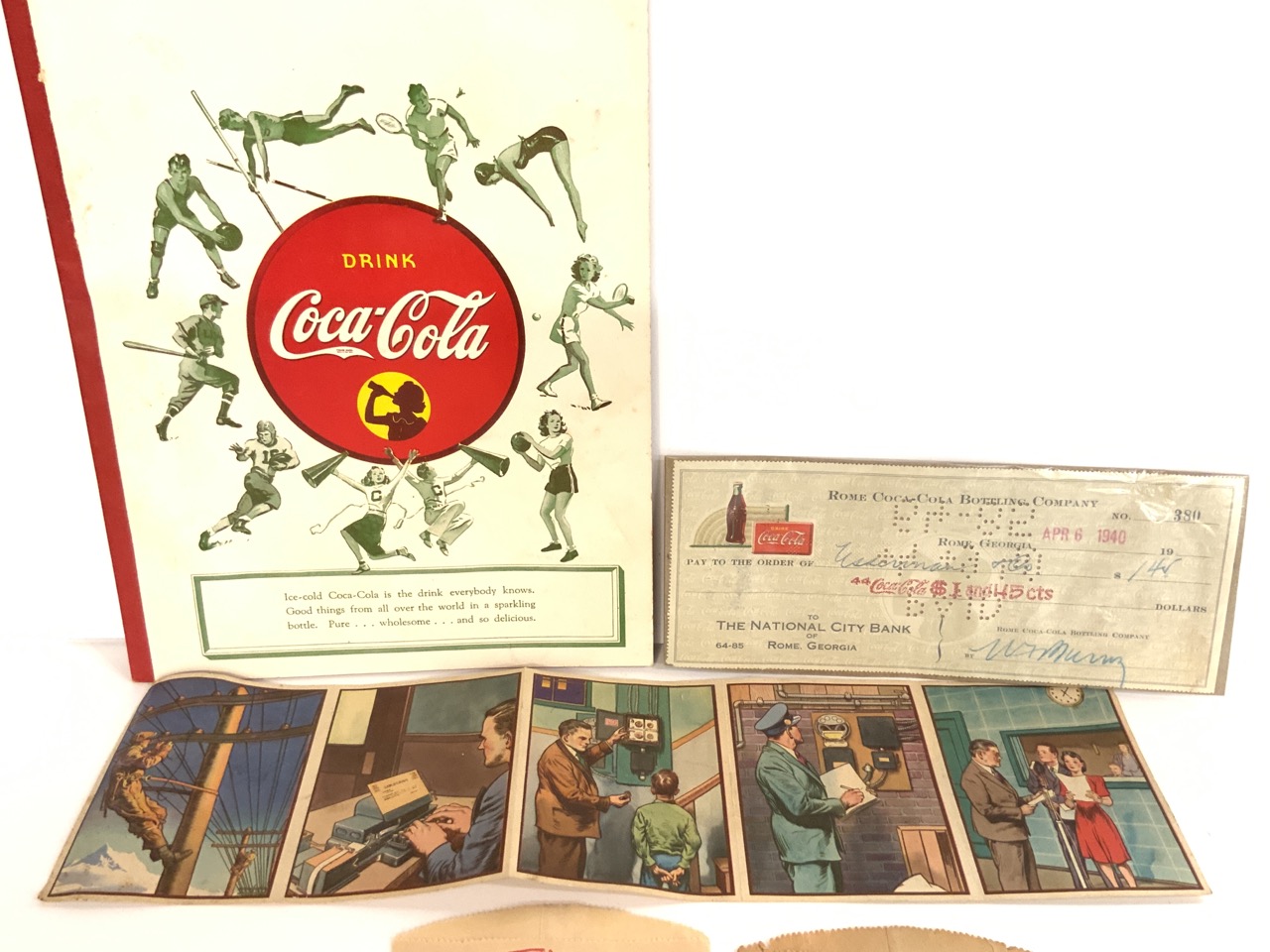 A compiled grouping of Coca-Cola paper ephemera. 1940's unused notebook, telegraph cards, signed check, bottle holders and receipt. Good condition. 1930's-1950's.