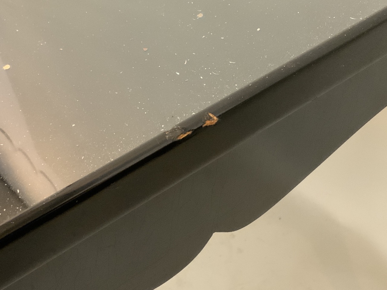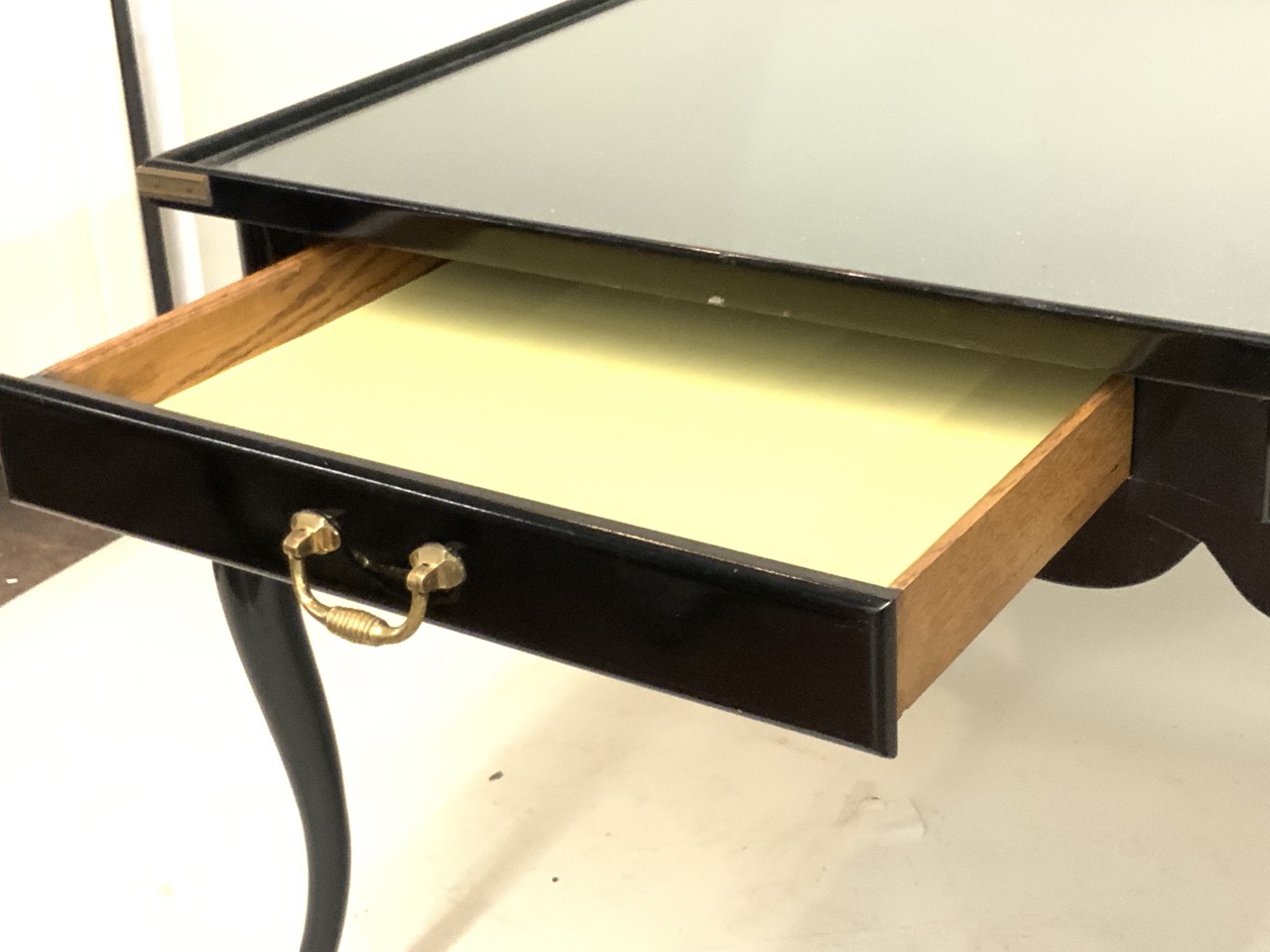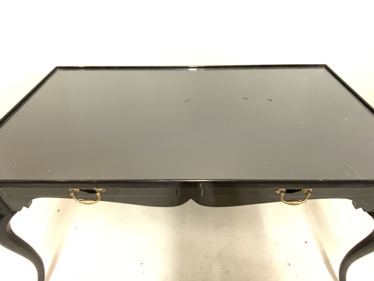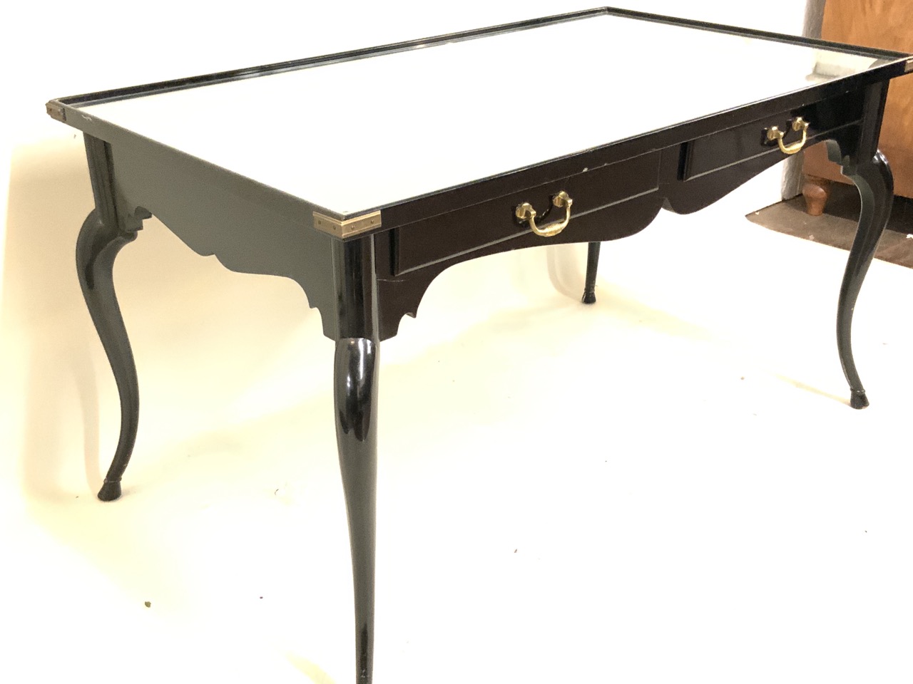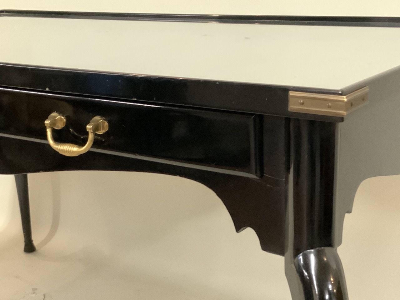A black lacquered wood two drawer writing desk with inset glass top. Personal desk of Pamela Harriman (1920-1997), U.S. Ambassador to France.