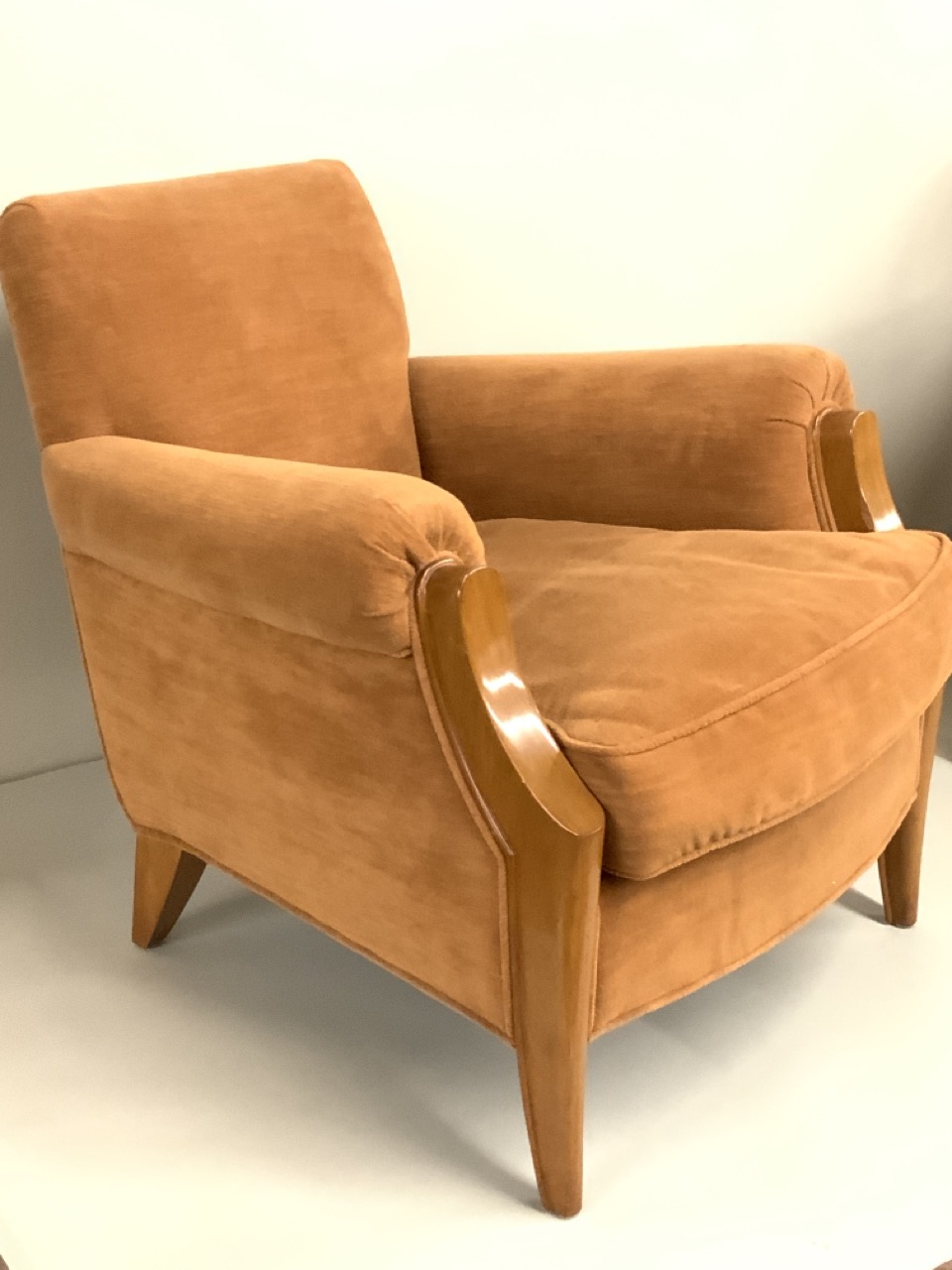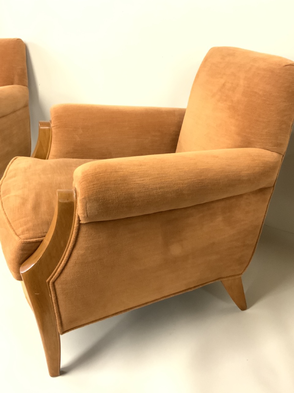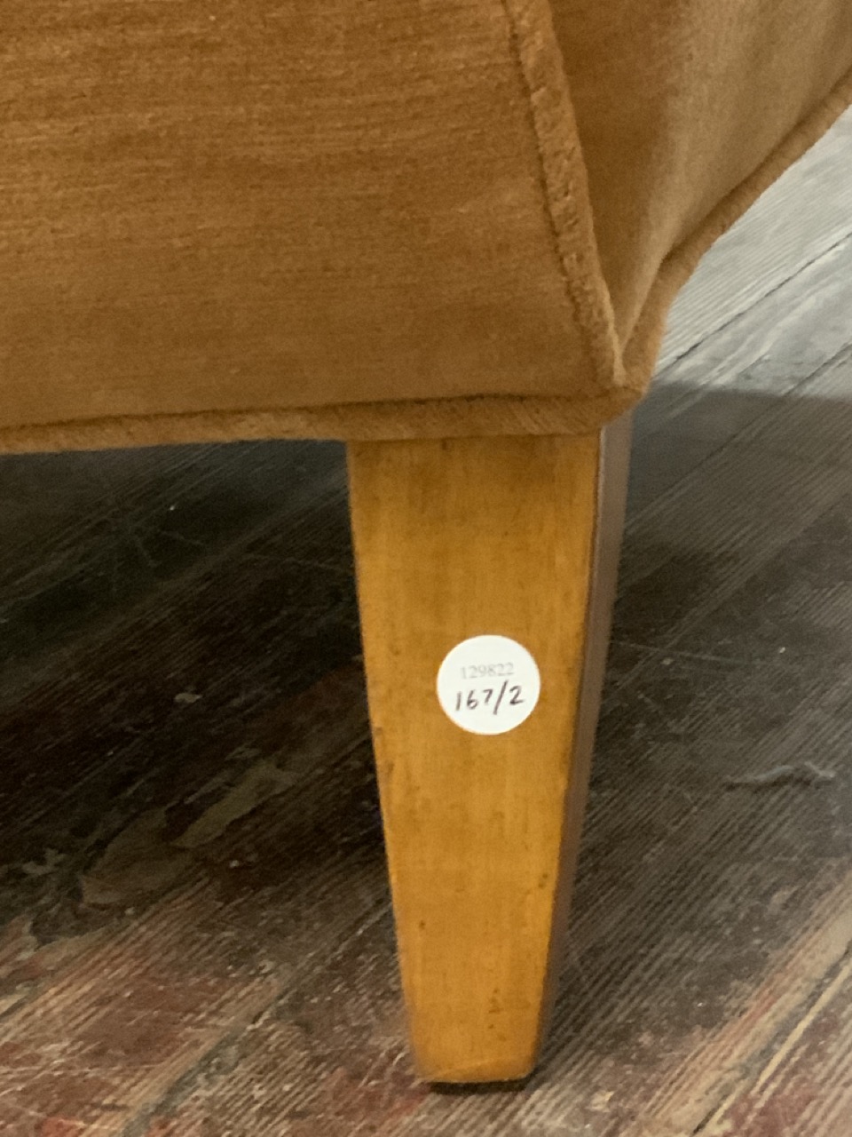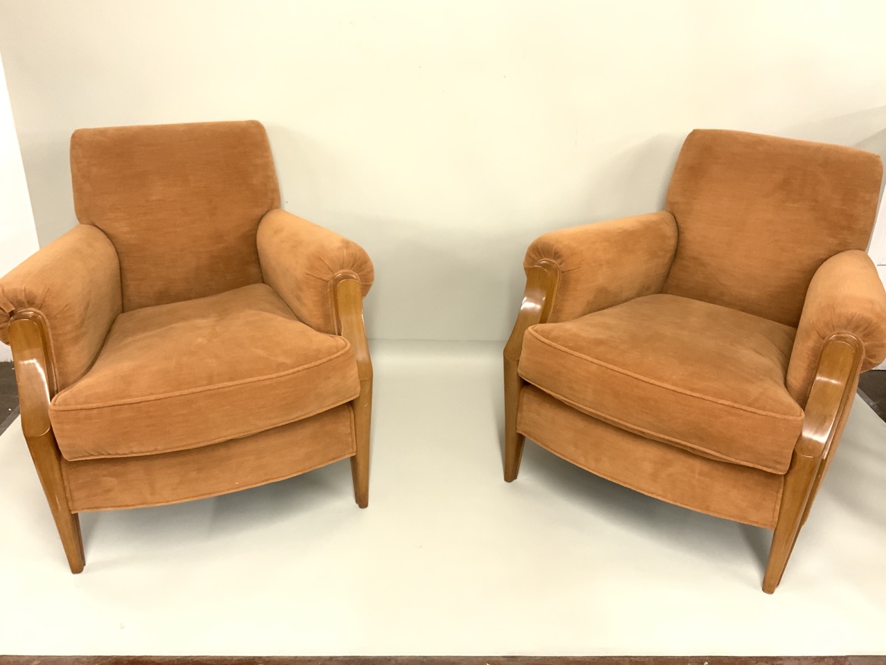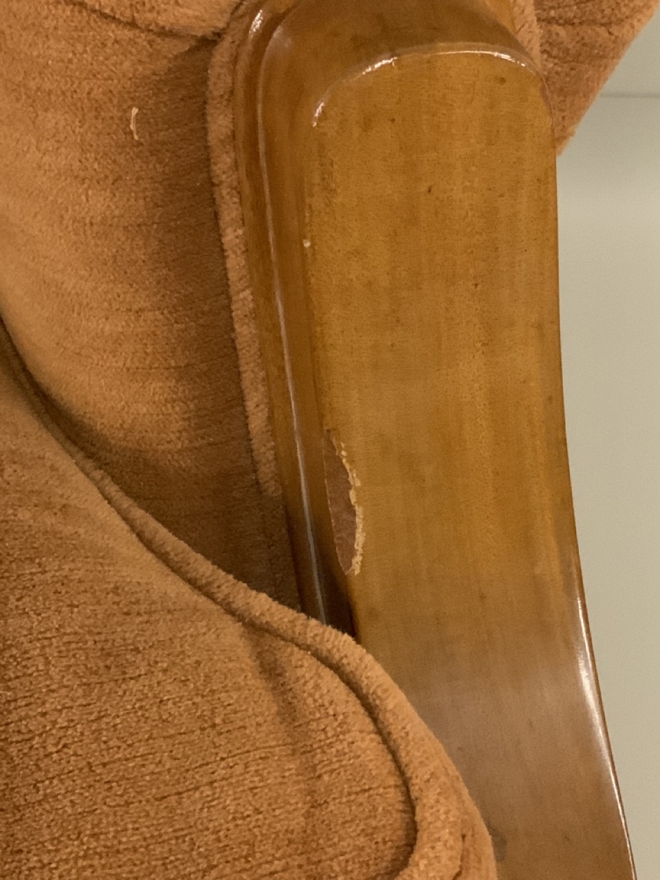 Condition report: Wood damage on front right arm chair phototgraphed to left. Please see photograph preview or call. Upholstered excellent. Clean and free of any staining or odor.