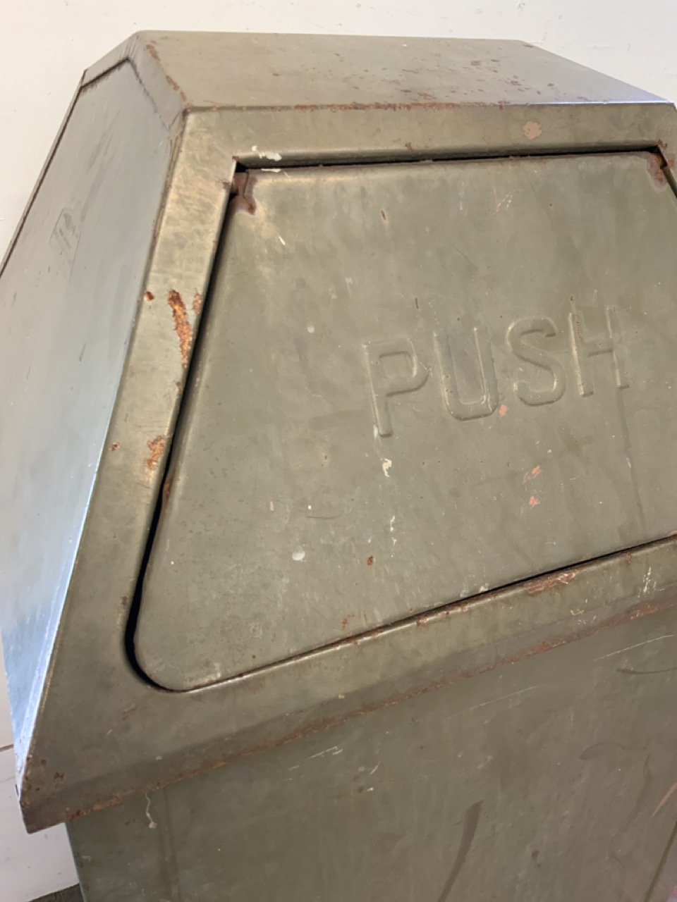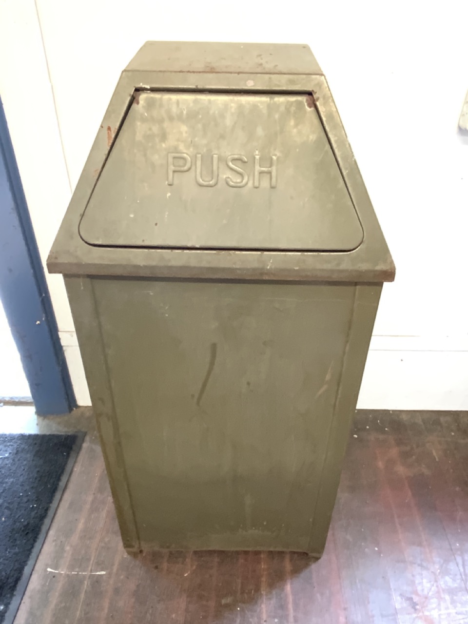 Vintage heavy metal commercial store or park trash can receptacle. Army green color. Includes newer heavy grade plastic drum liner. Some rusting on bottom from age. Overall good. Lid in good working order.