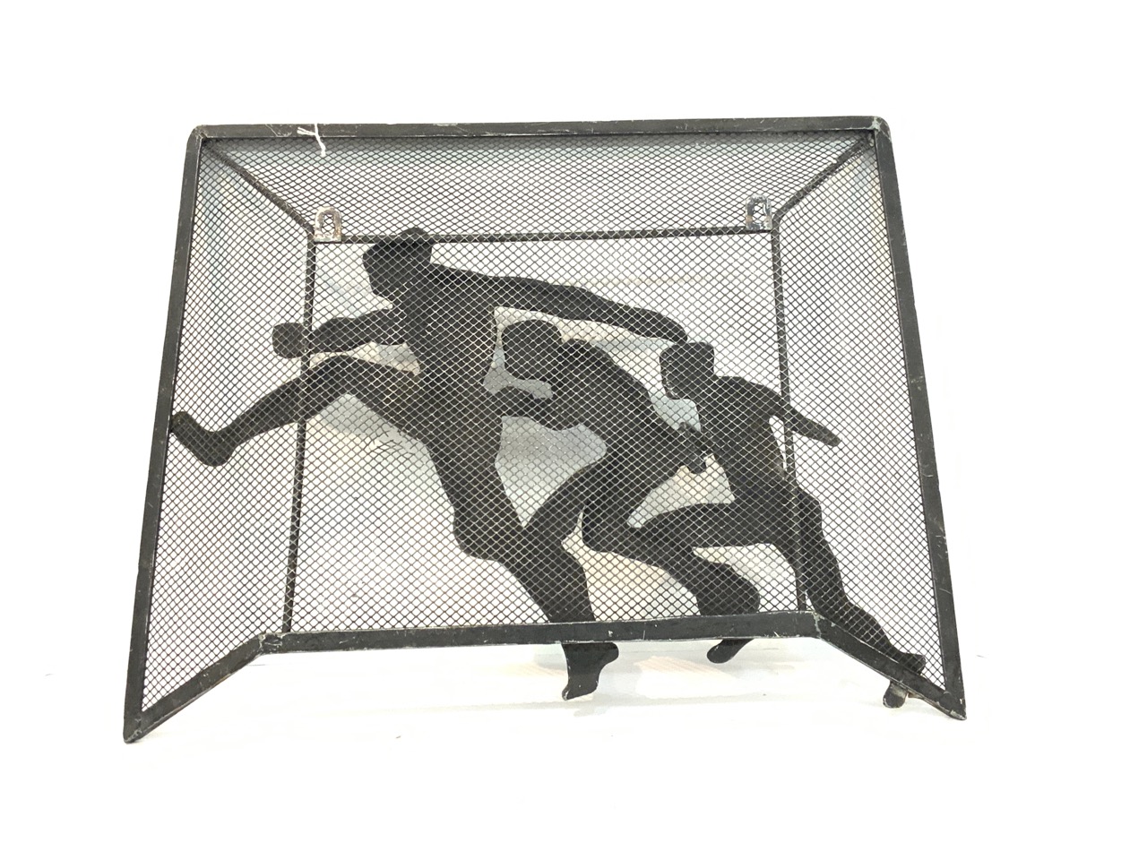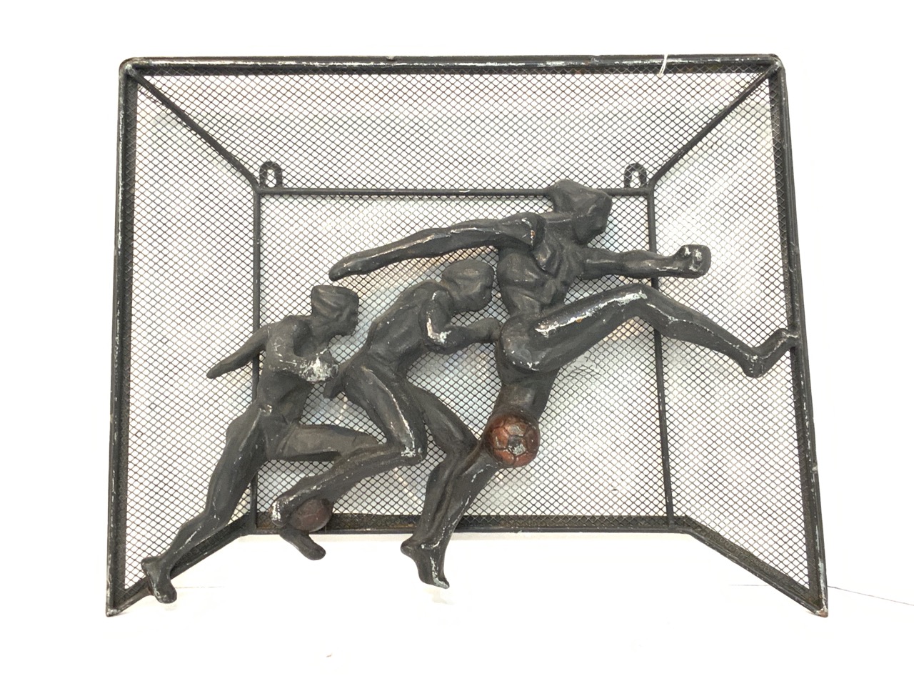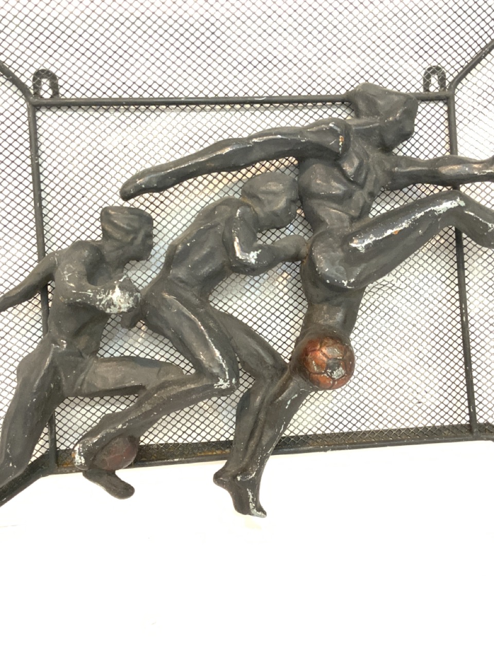 An aluminum wall sculpture, Art Deco period depicting three soccer players in motion. Well done example showing male physique.