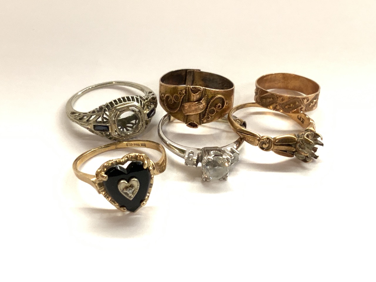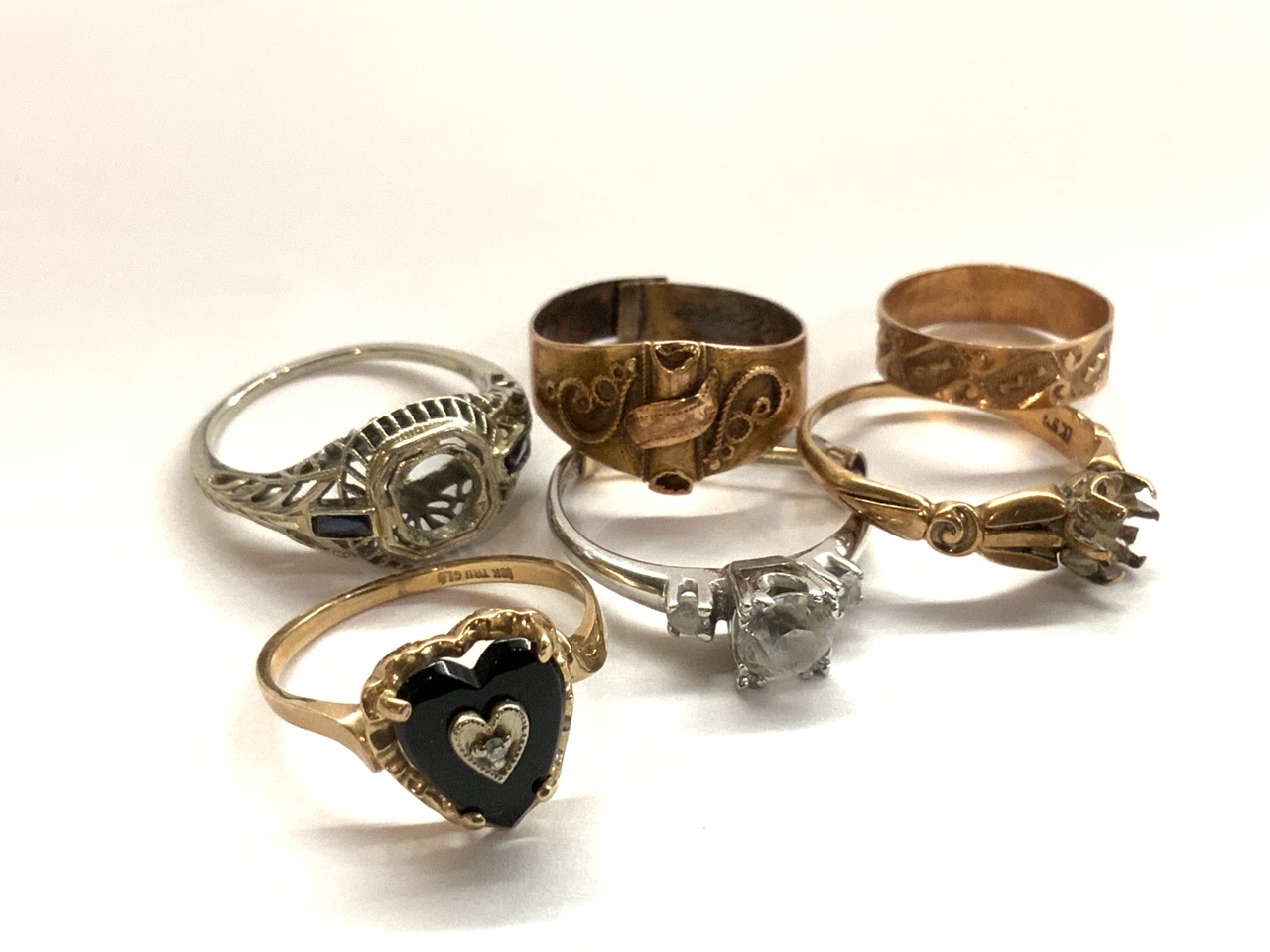 Six assorted estate gold ring. 10k-14k rings, Edwardian with blue sapphire setting, onyx heart ring etc.
