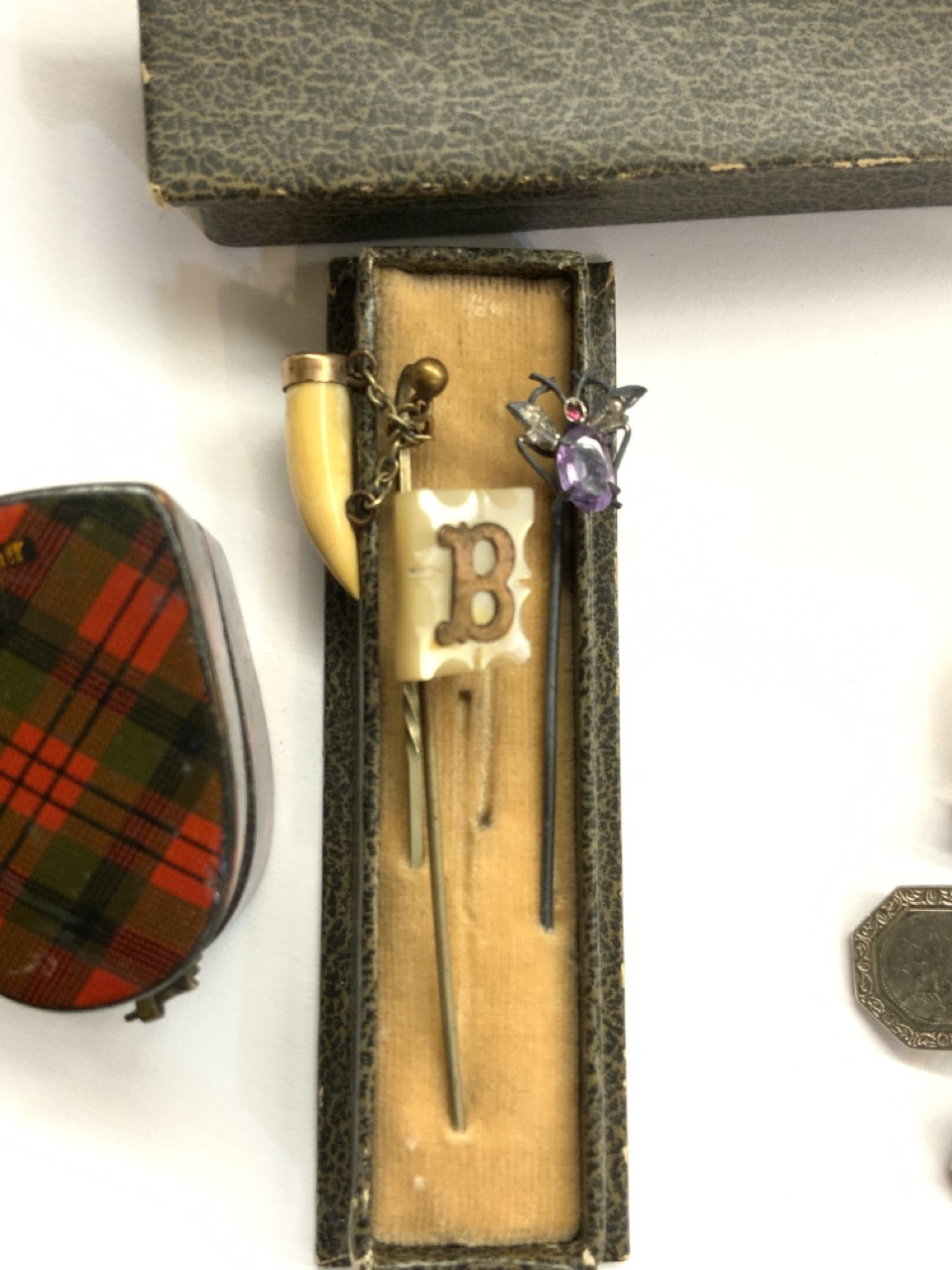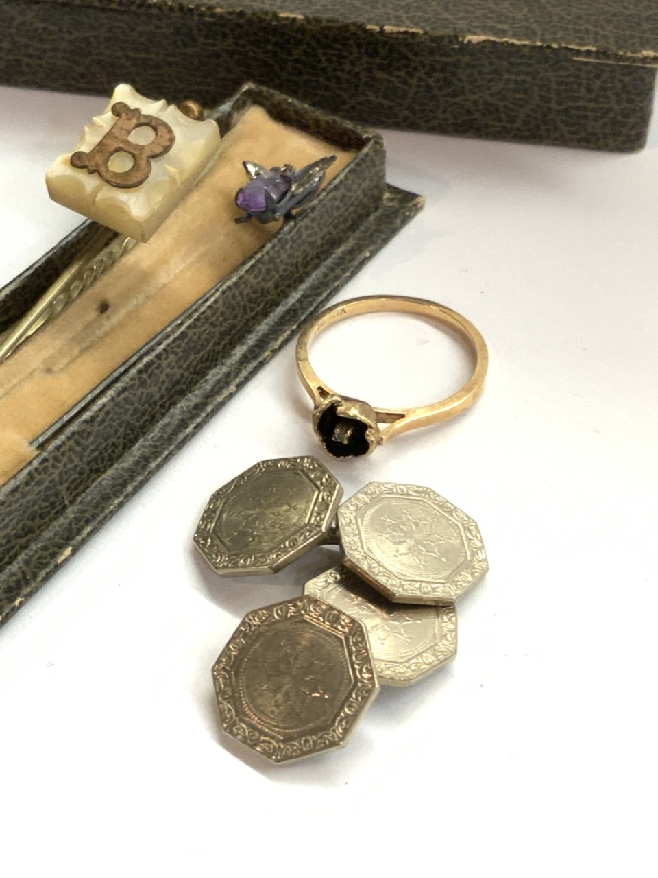 Compiled estate grouping of miscellaneous items including Tartinware Scottish ring box, 14k gold top cufflinks, diamond flower ring, 900 silver amethyst bug stick pin etc.