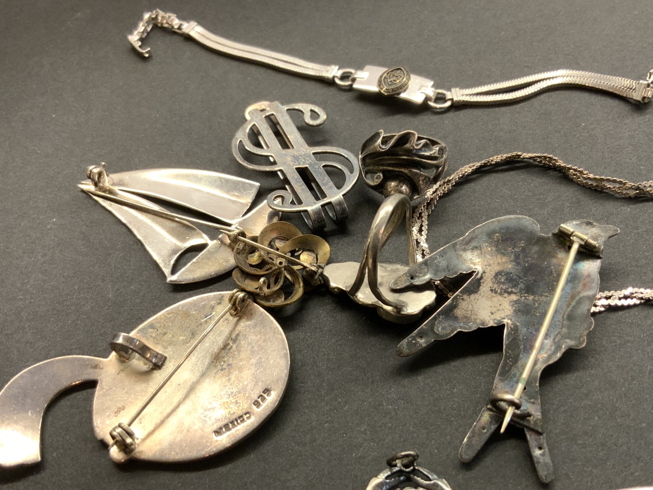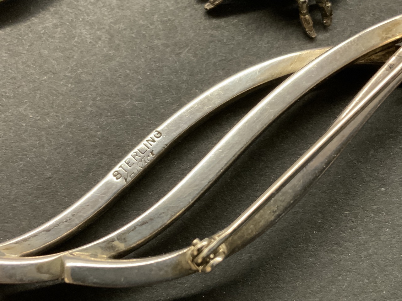 Estate sterling silver jewelry group. Ray Jack modernist design pin, Navaho ring, pins, bracelets etc. As seen in photograph preview.
