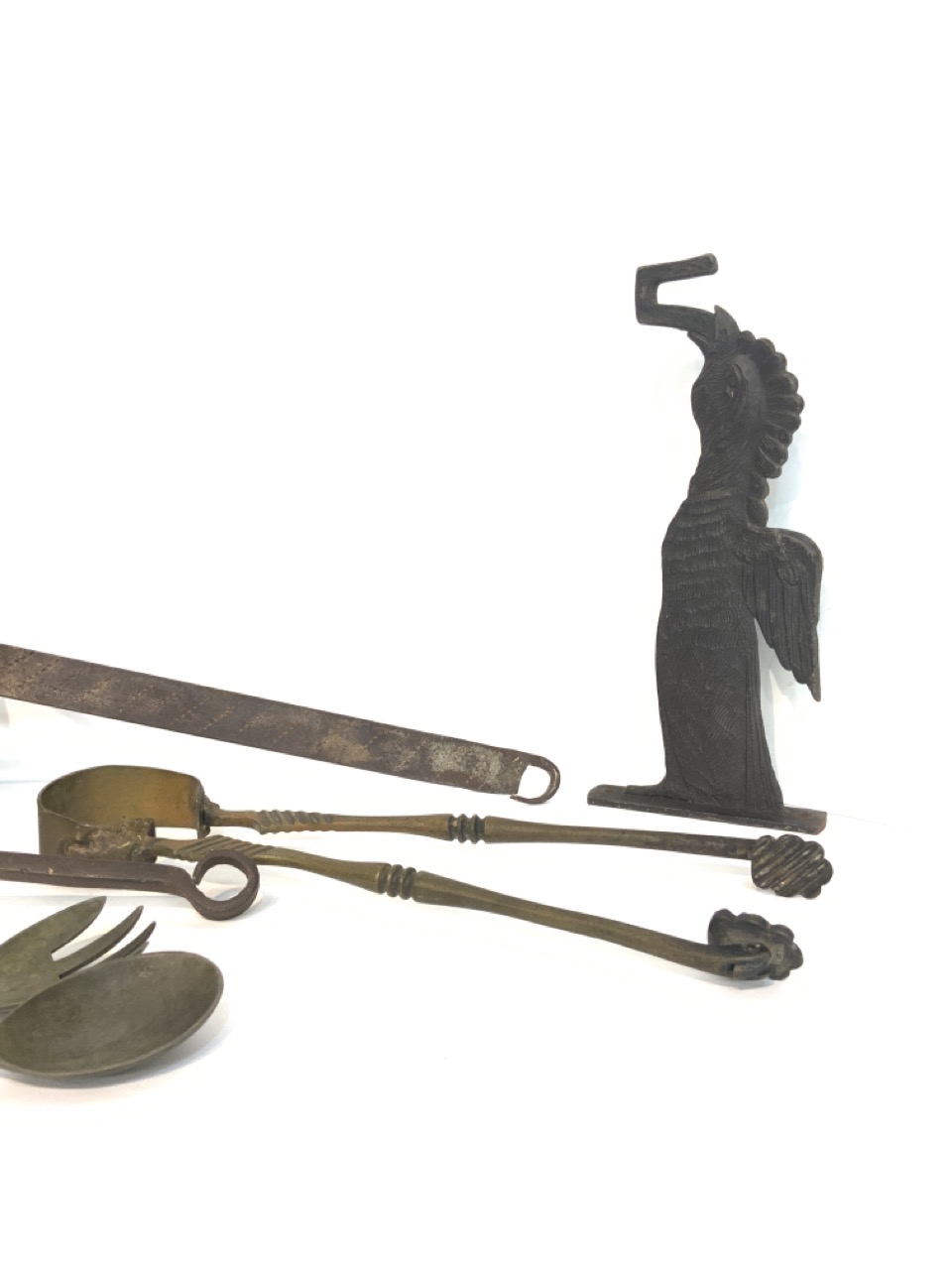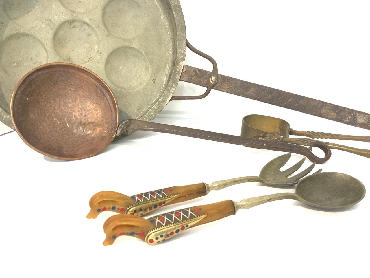 An assorted metalware grouping. Egg poacher, oil lamp mount, utensils etc. Estate compiled.