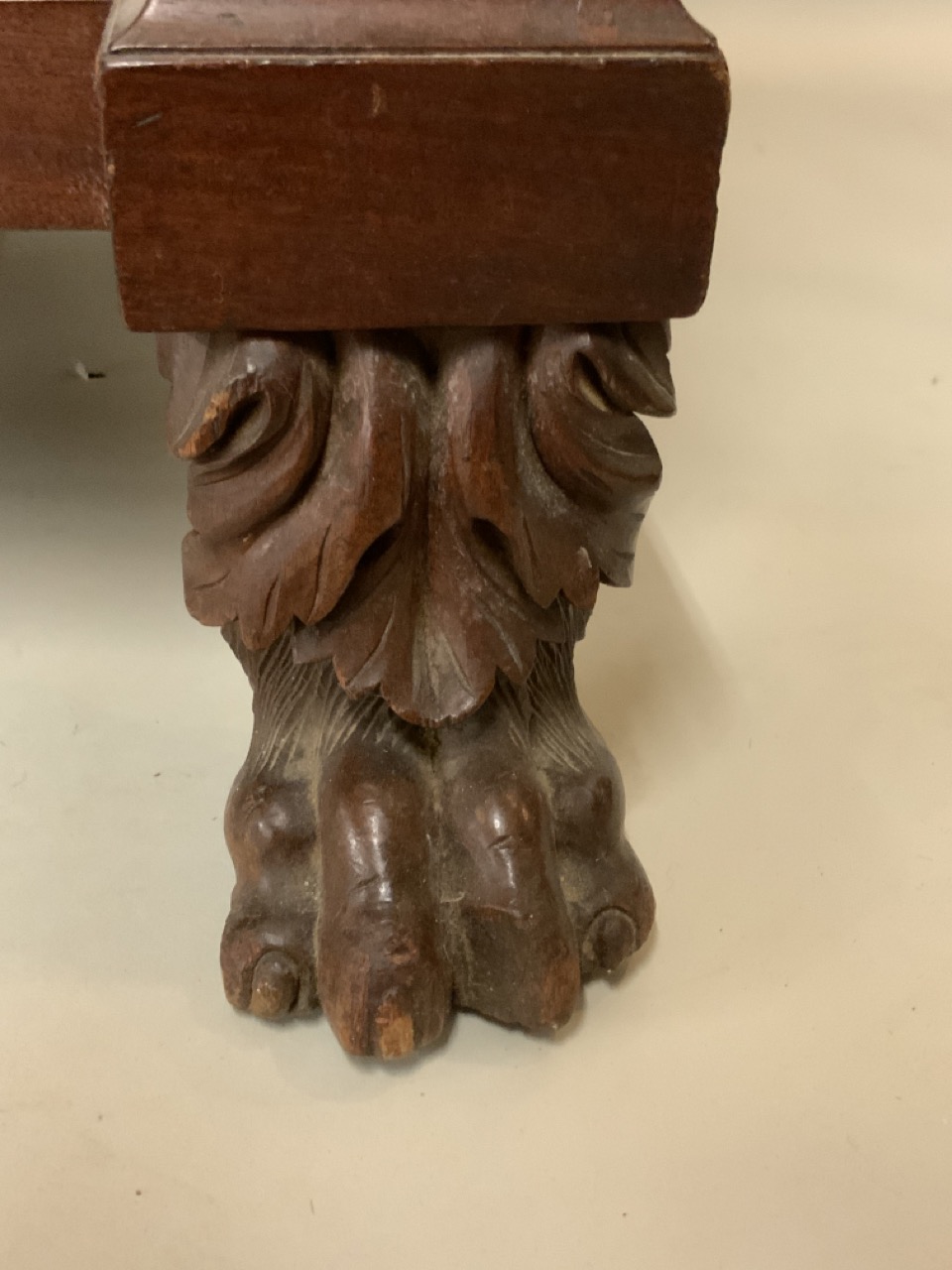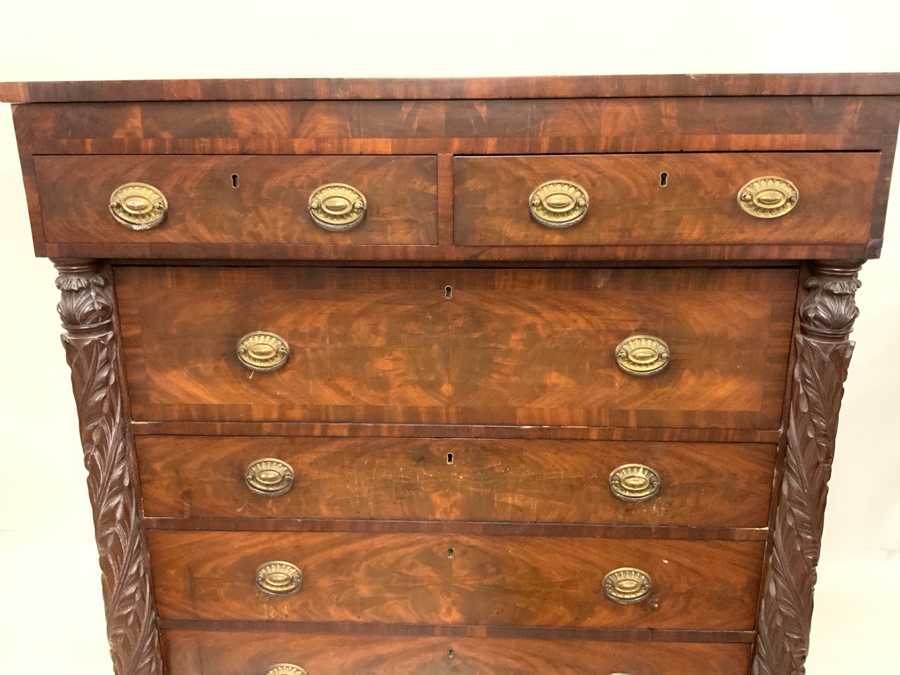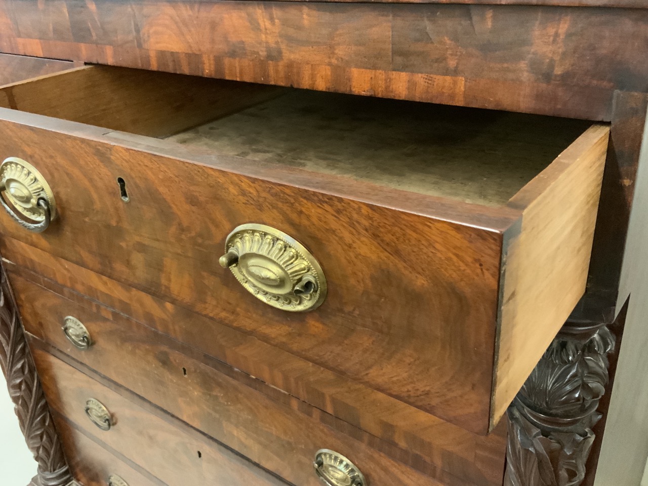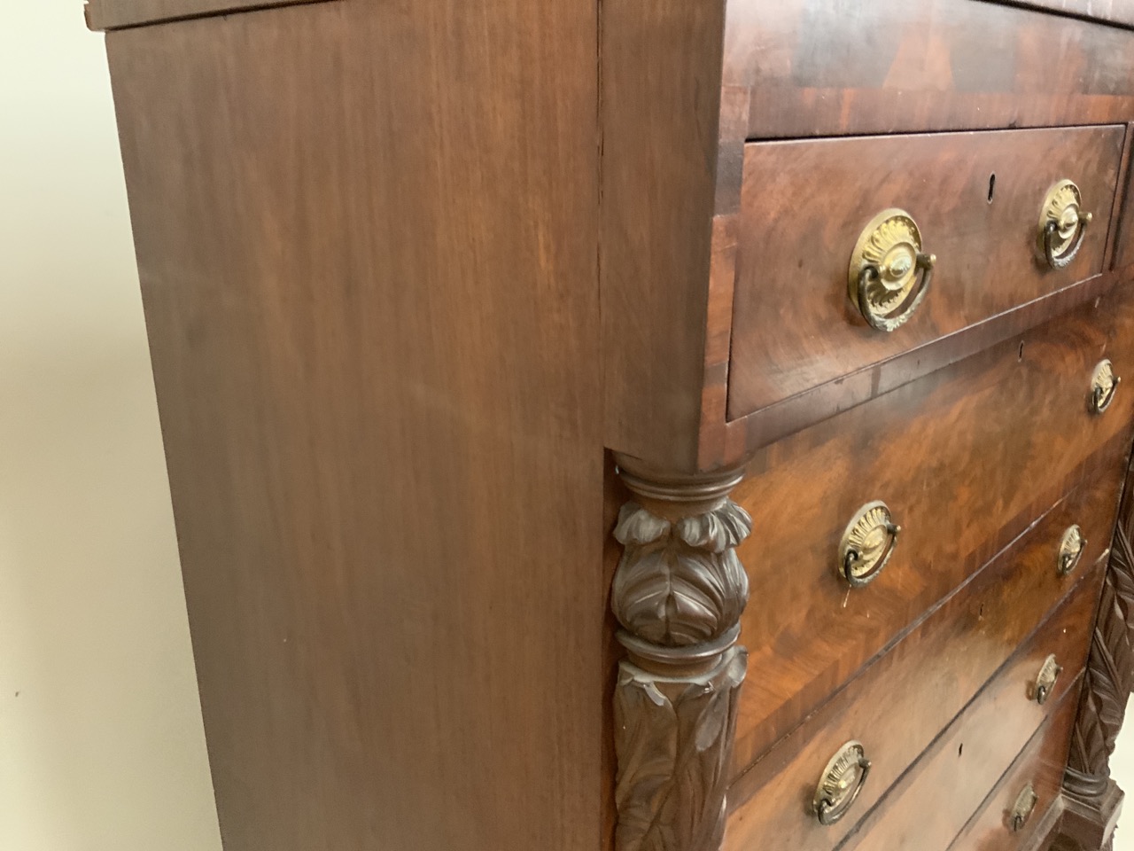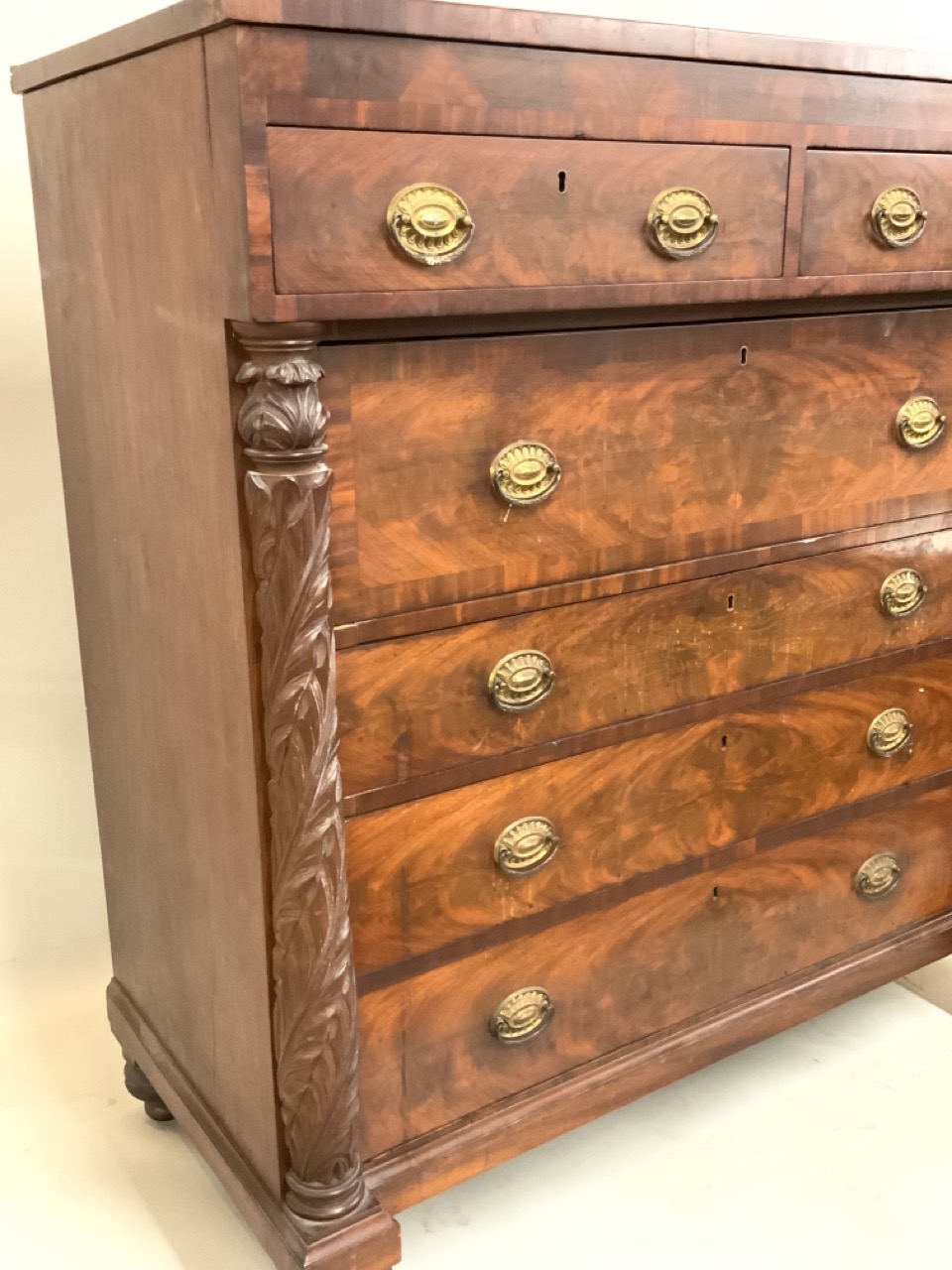 Two over four empire carved chest of drawers with Acanthus carved columns and hairy paw feet.