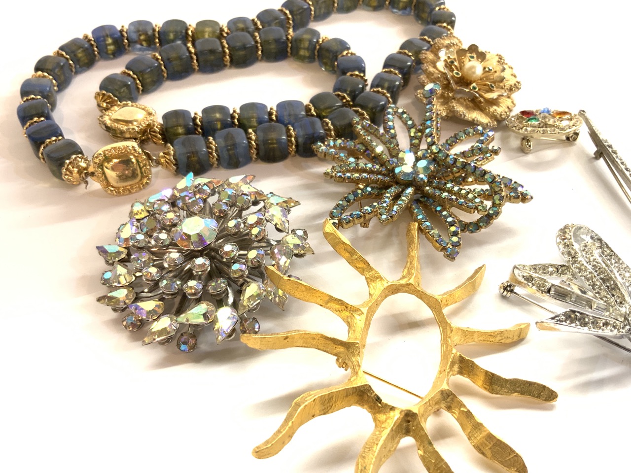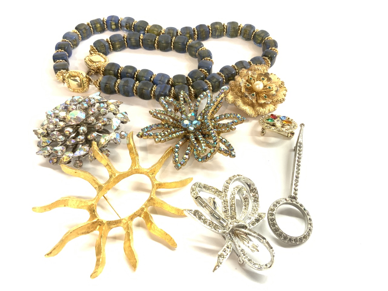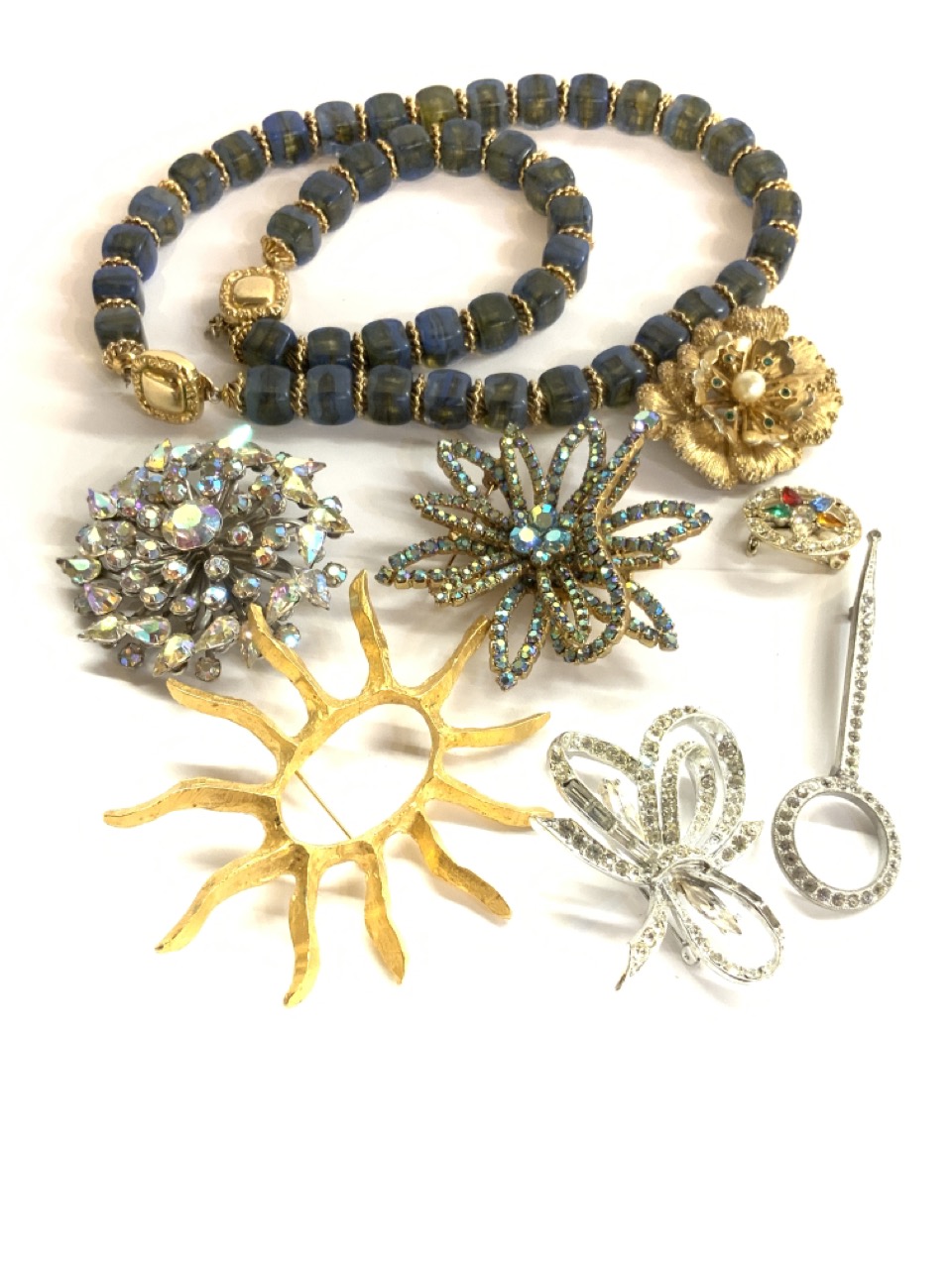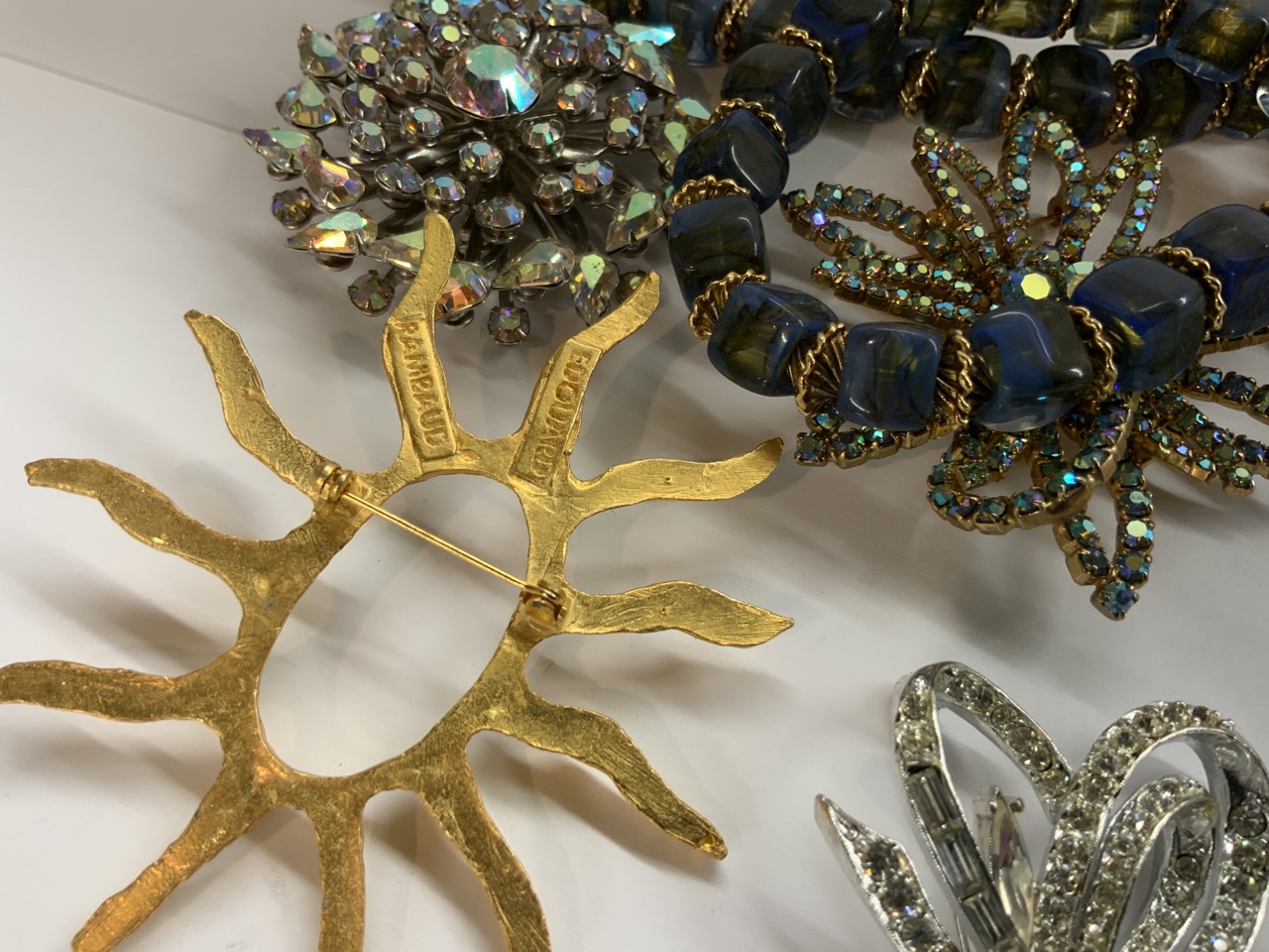 Assorted costume jewelry lot including Napier, Edouard etc. Rhinestones pins unsigned. Vintage. As seen in photograph preview.