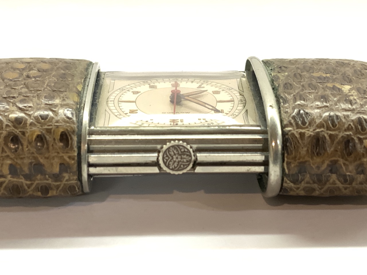 Movado travel alarm clock. Pocket size with hoop for fob. Very nice condition with alligator skin case. Retractable.