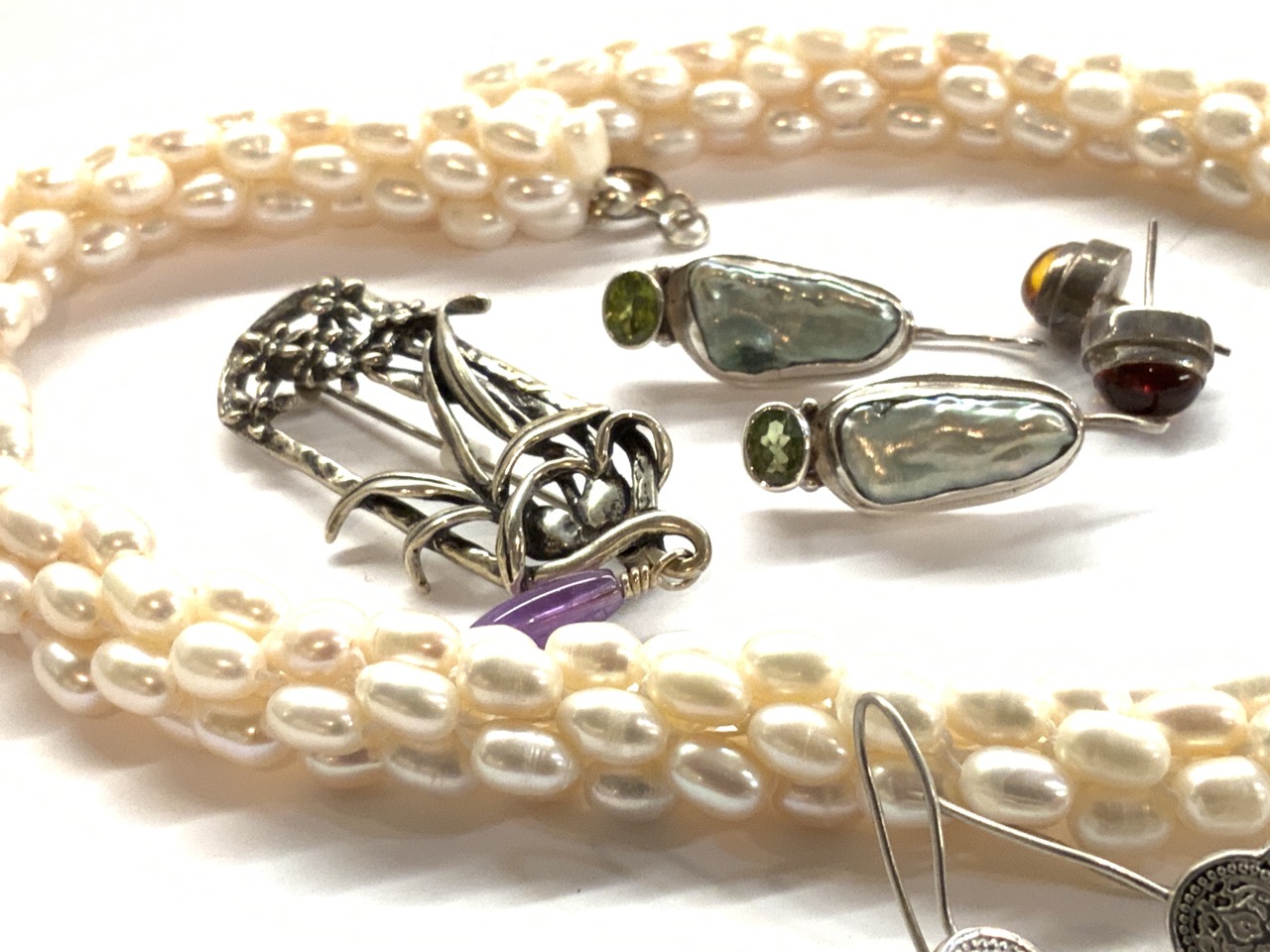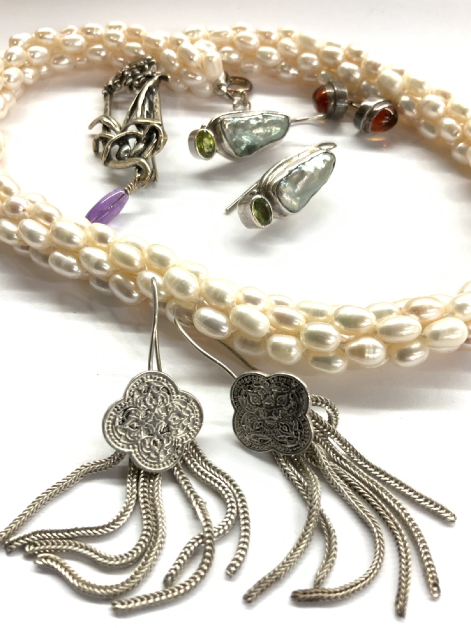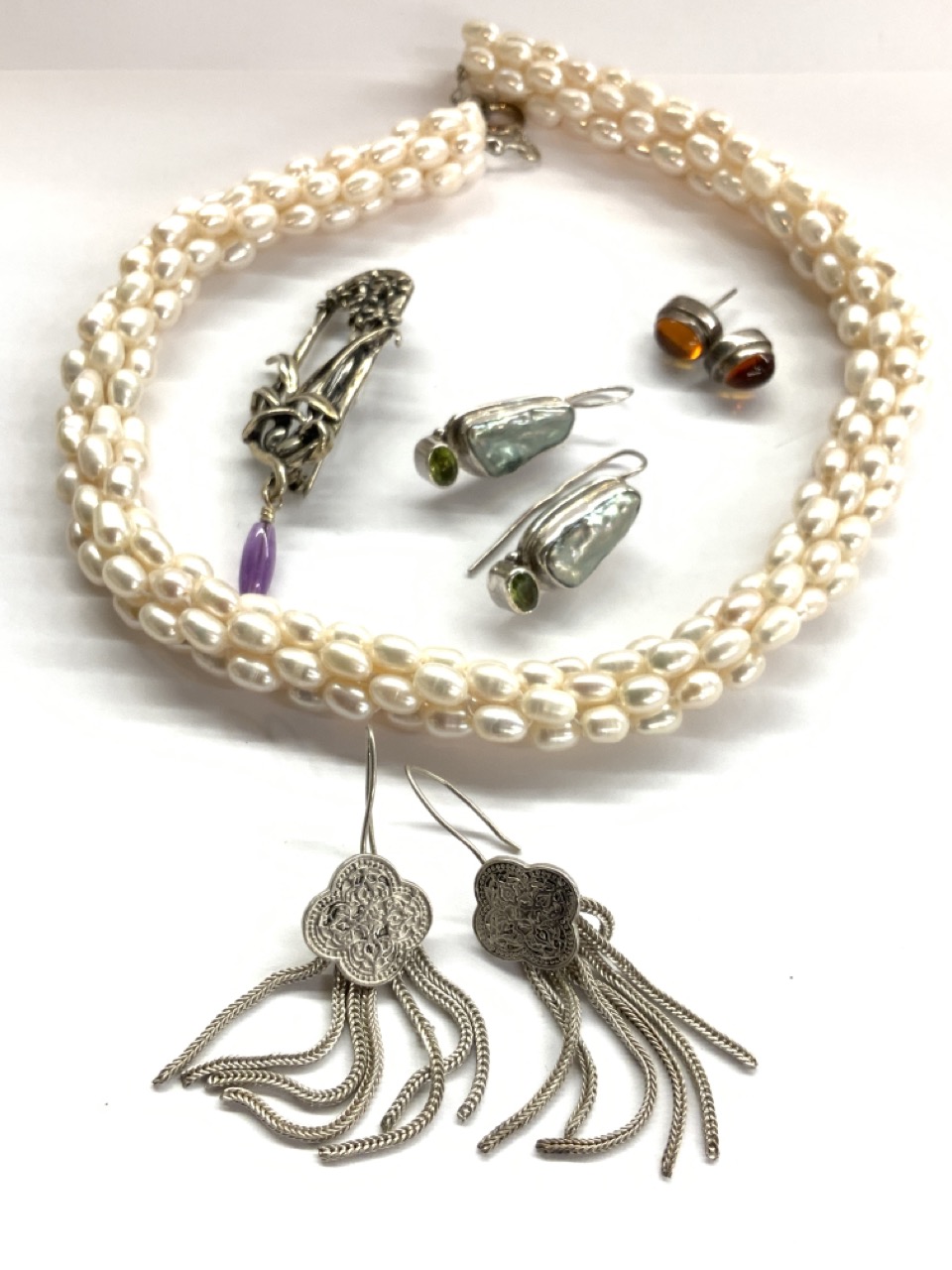 A compiled grouping of silver jewelry, pearls etc. As seen in photograph preview.