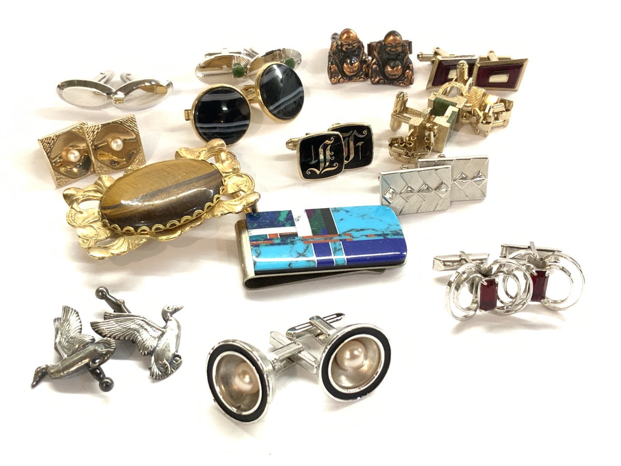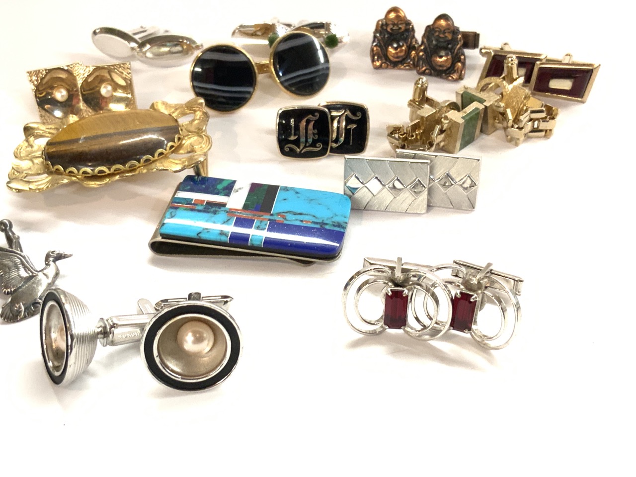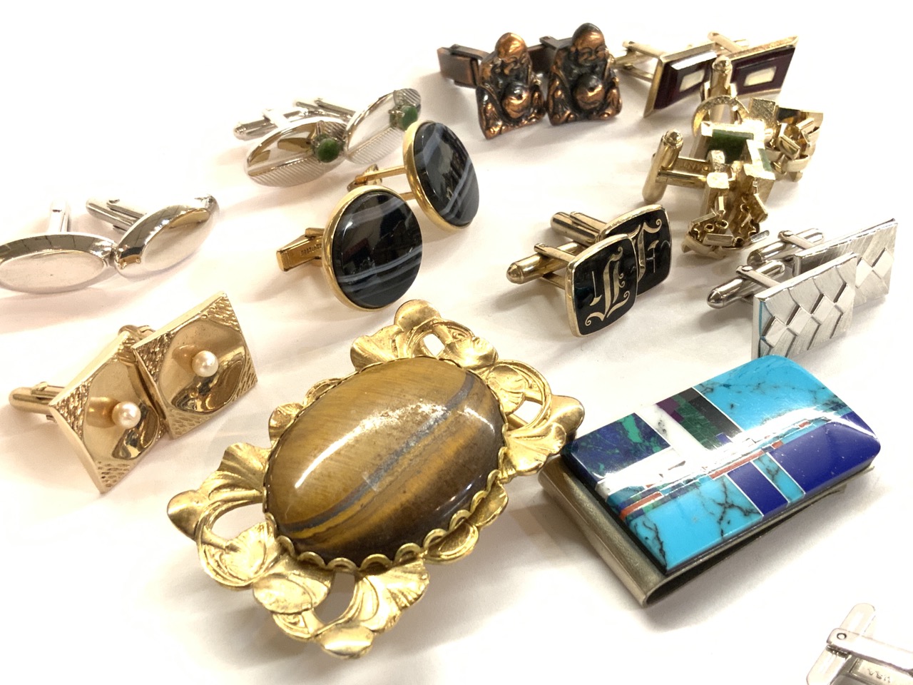 A compiled grouping of men's jewelry. Cufflinks all match pairs, money clip, buckle etc. As seen in photograph preview.