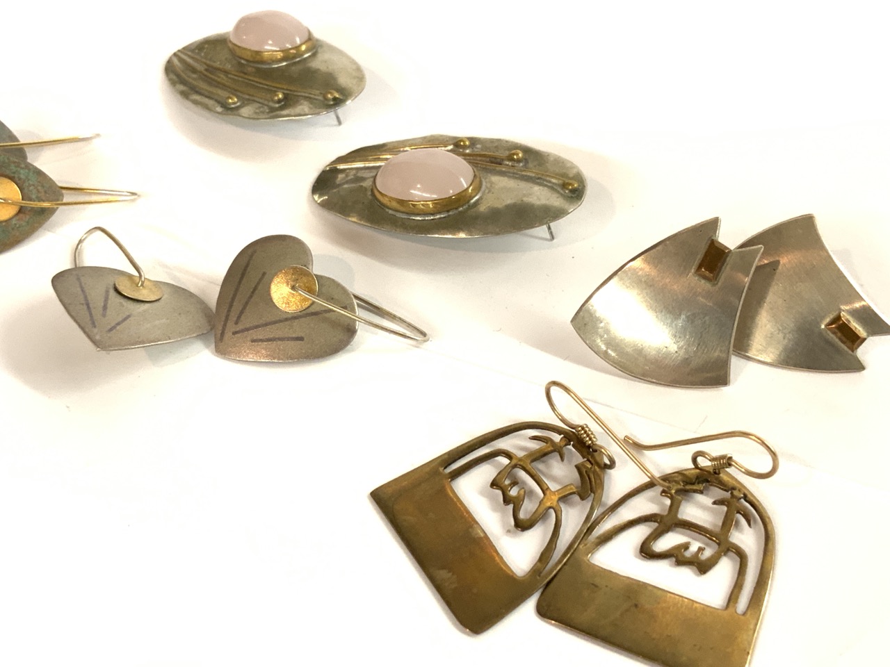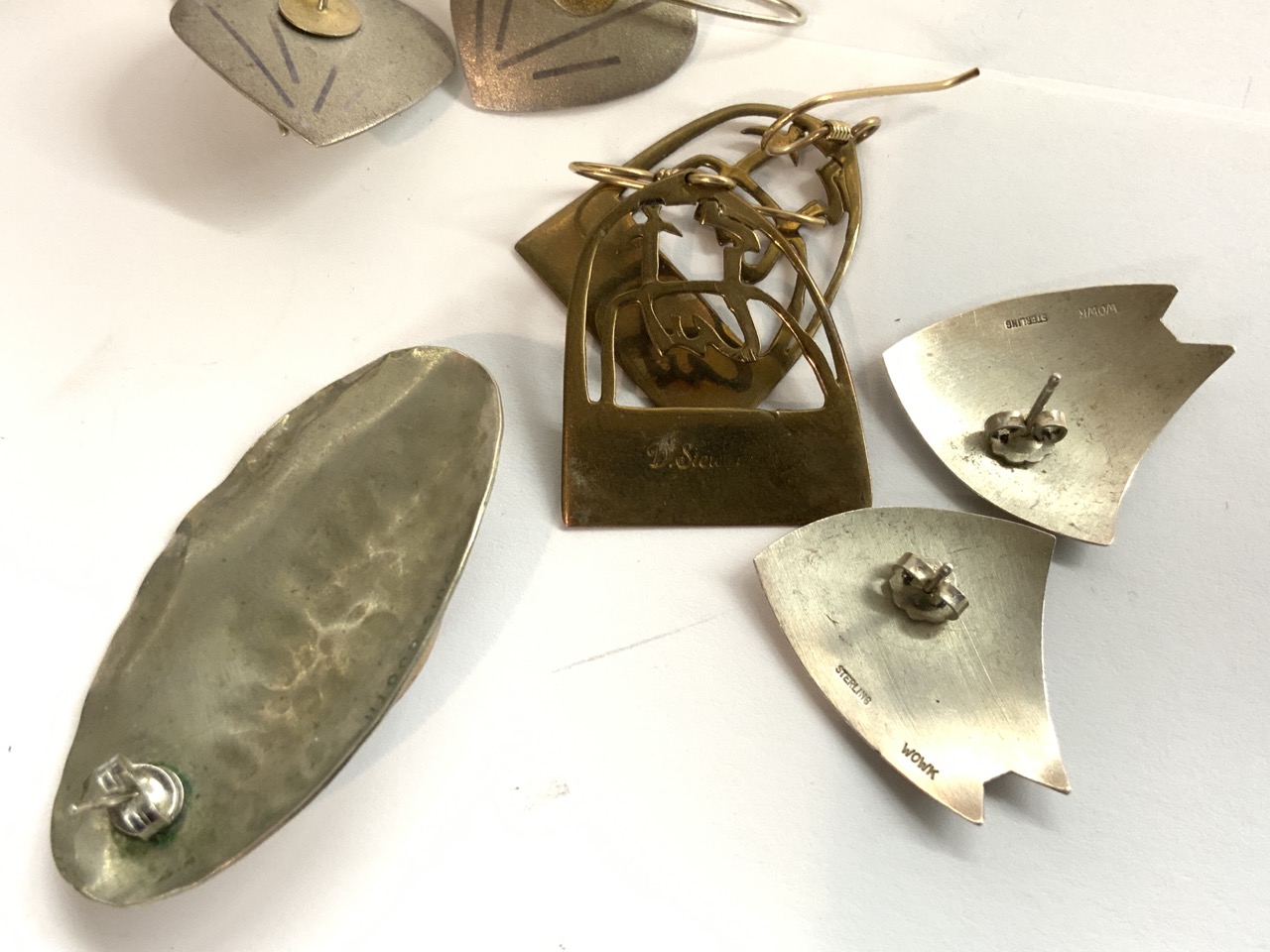 80's Modern design earrings lot. D. Stewart, Louis Booth etc. Silver and brass metals.