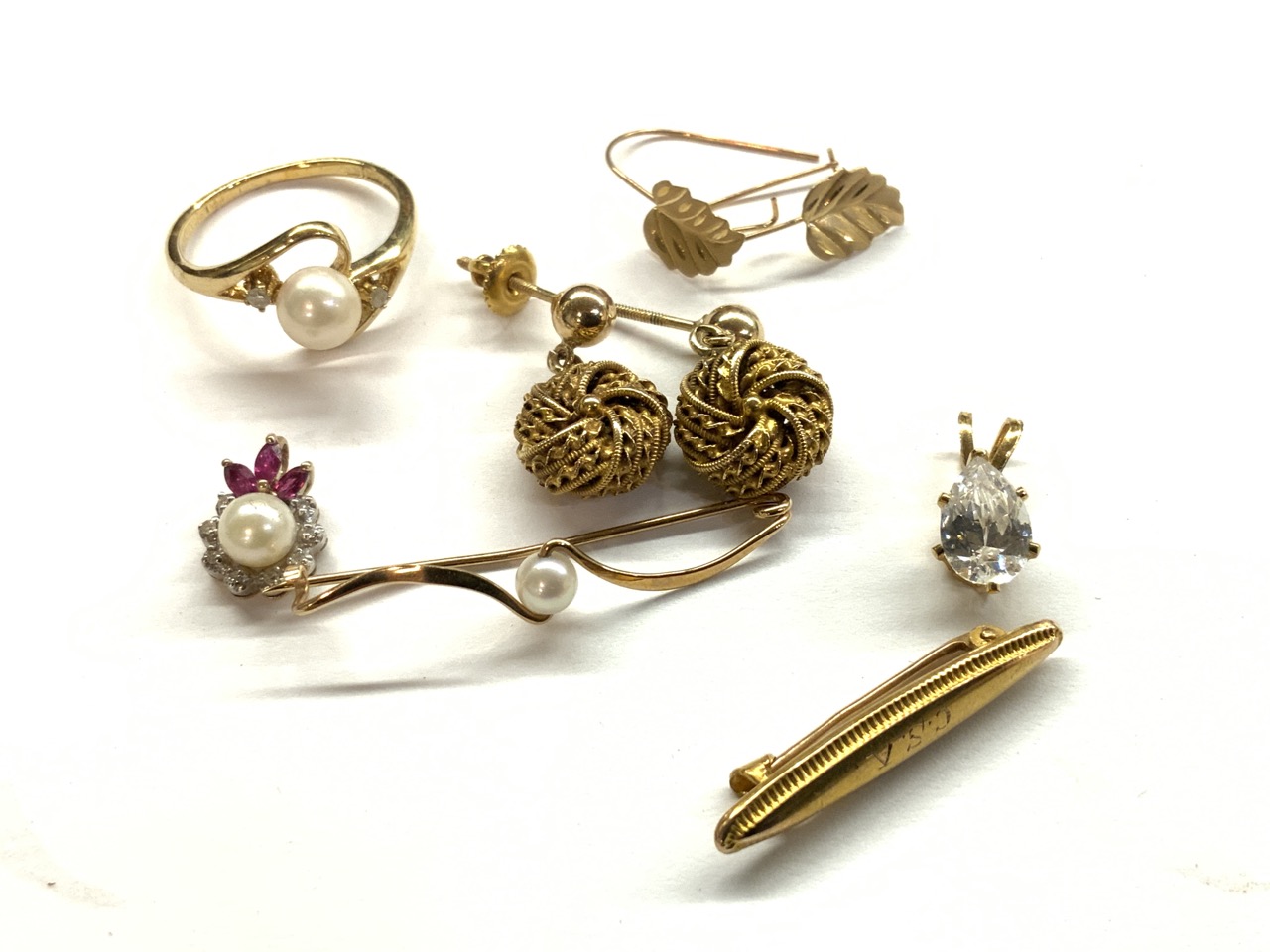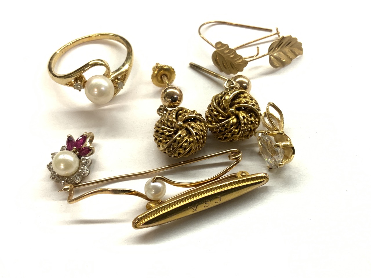 A compiled grouping of 10-14k gold jewelry with gemstones.