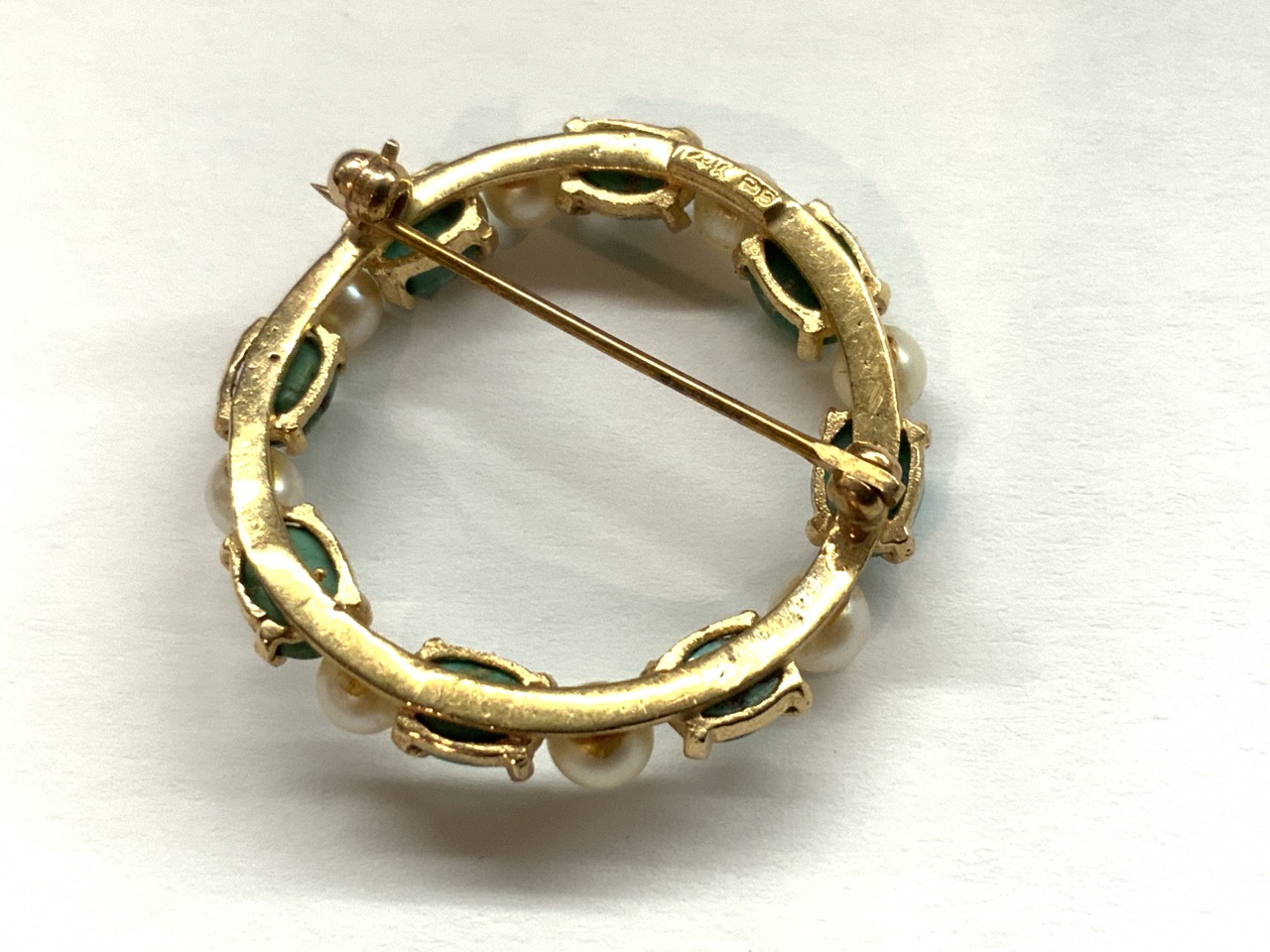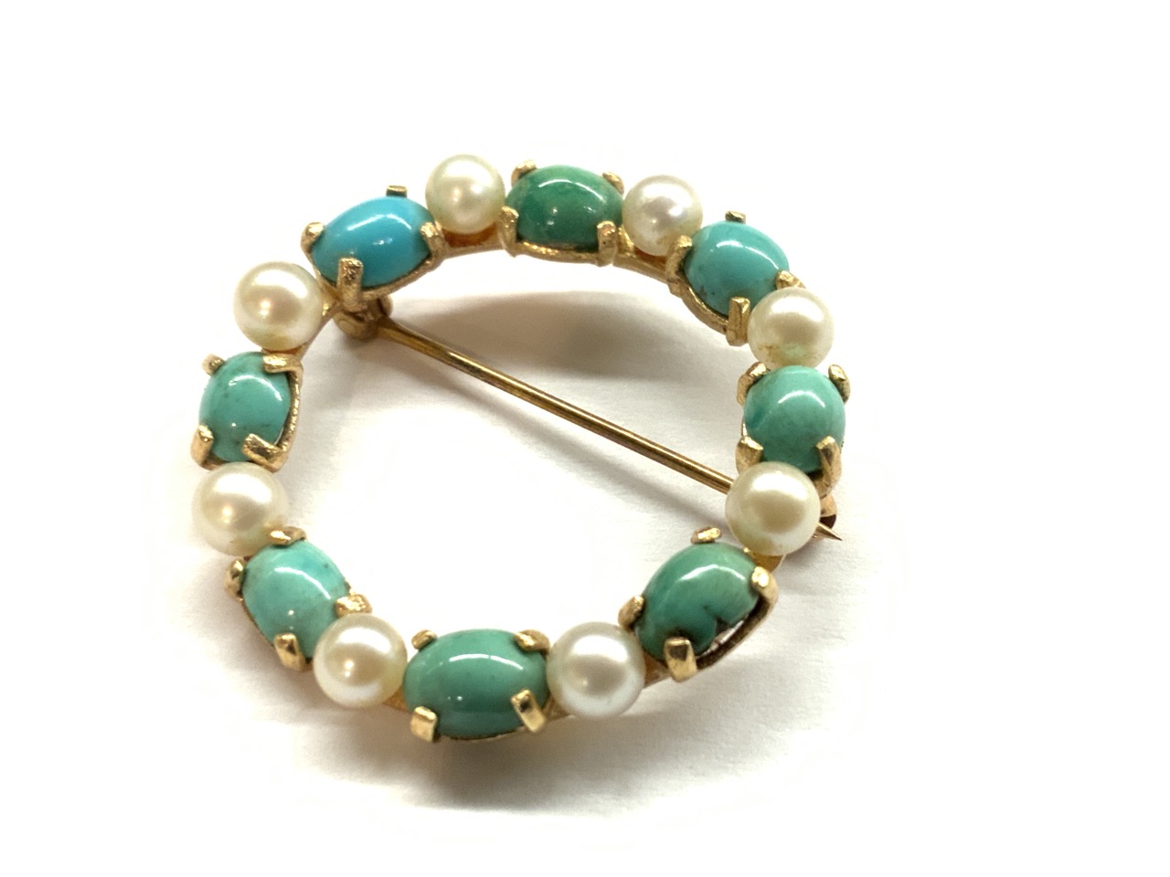 14k turquoise and pearl circular pin.