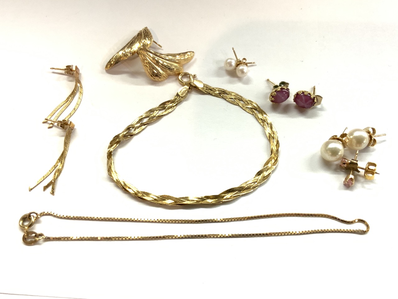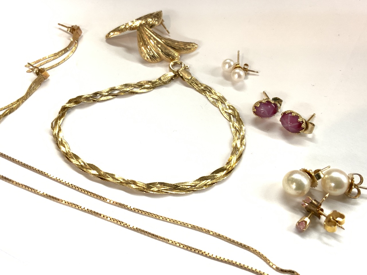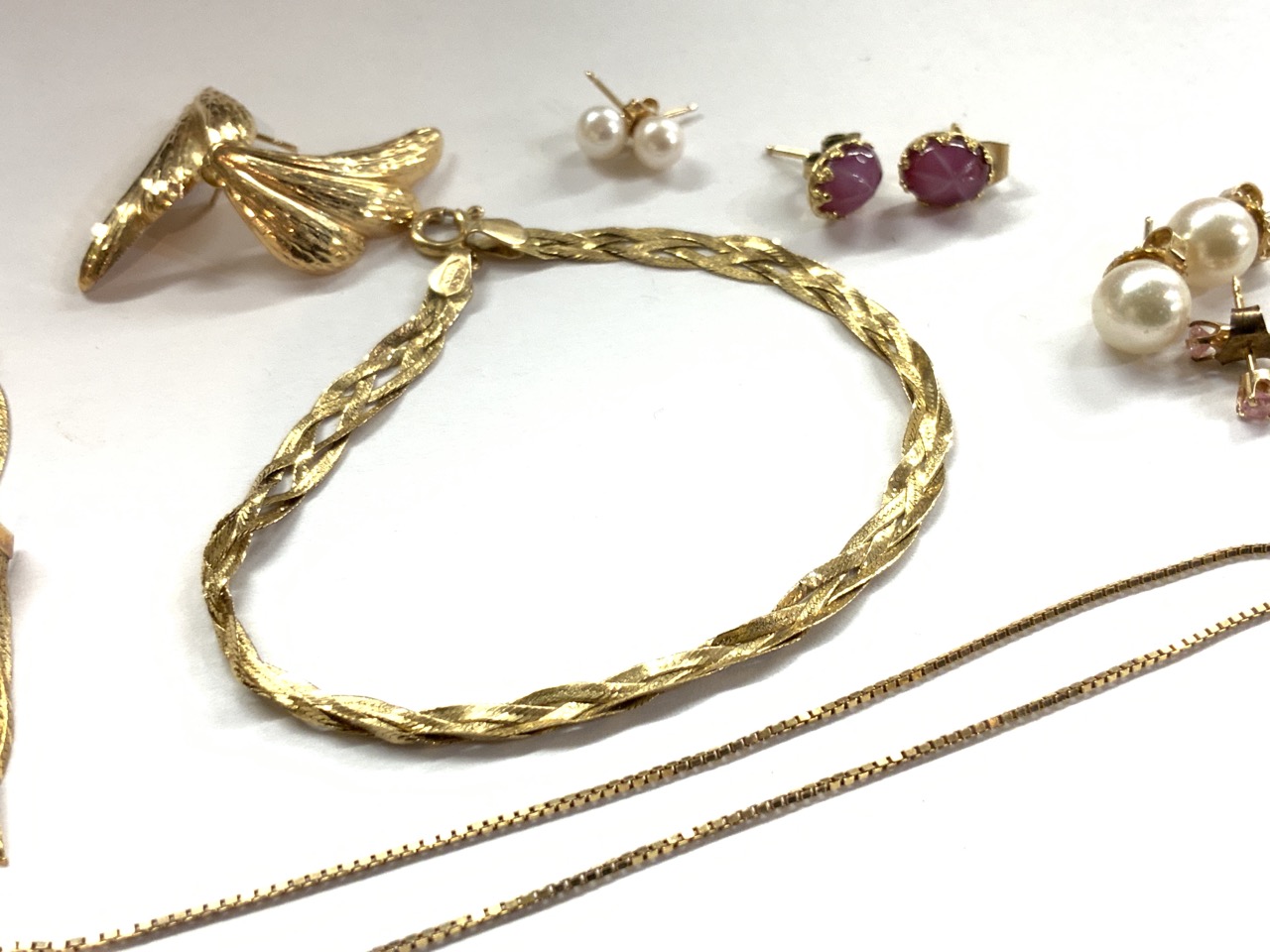 Estate compiled 14k yellow gold jewelry. two bracelets, earrings, star sapphires and pearls etc.