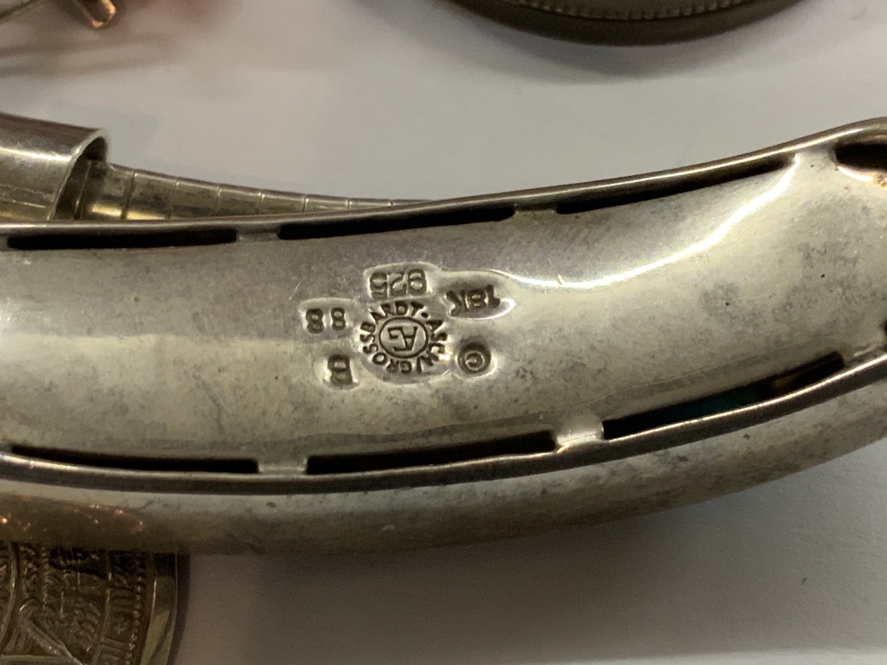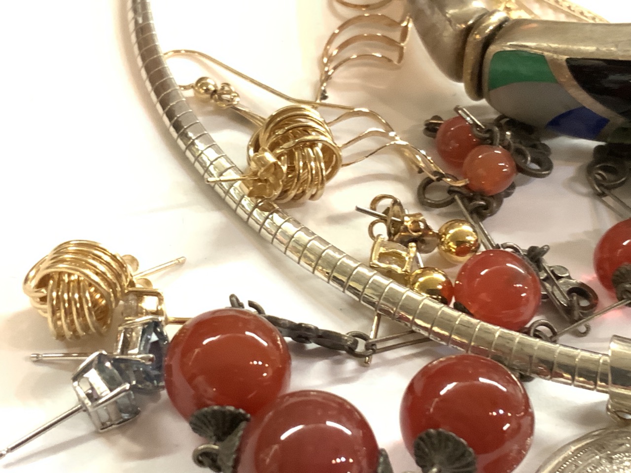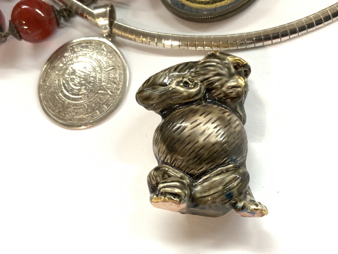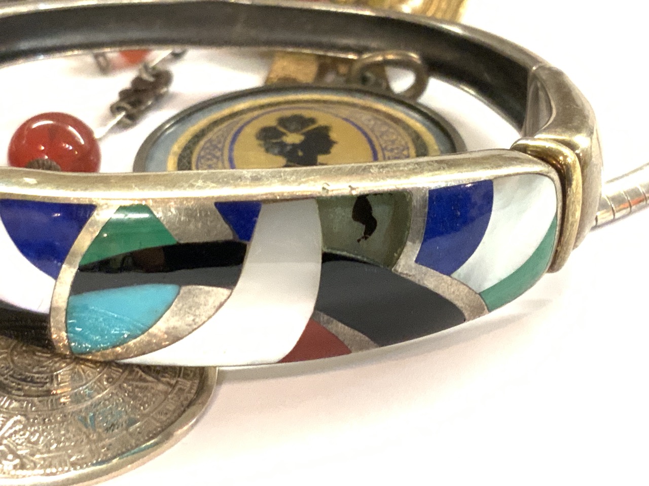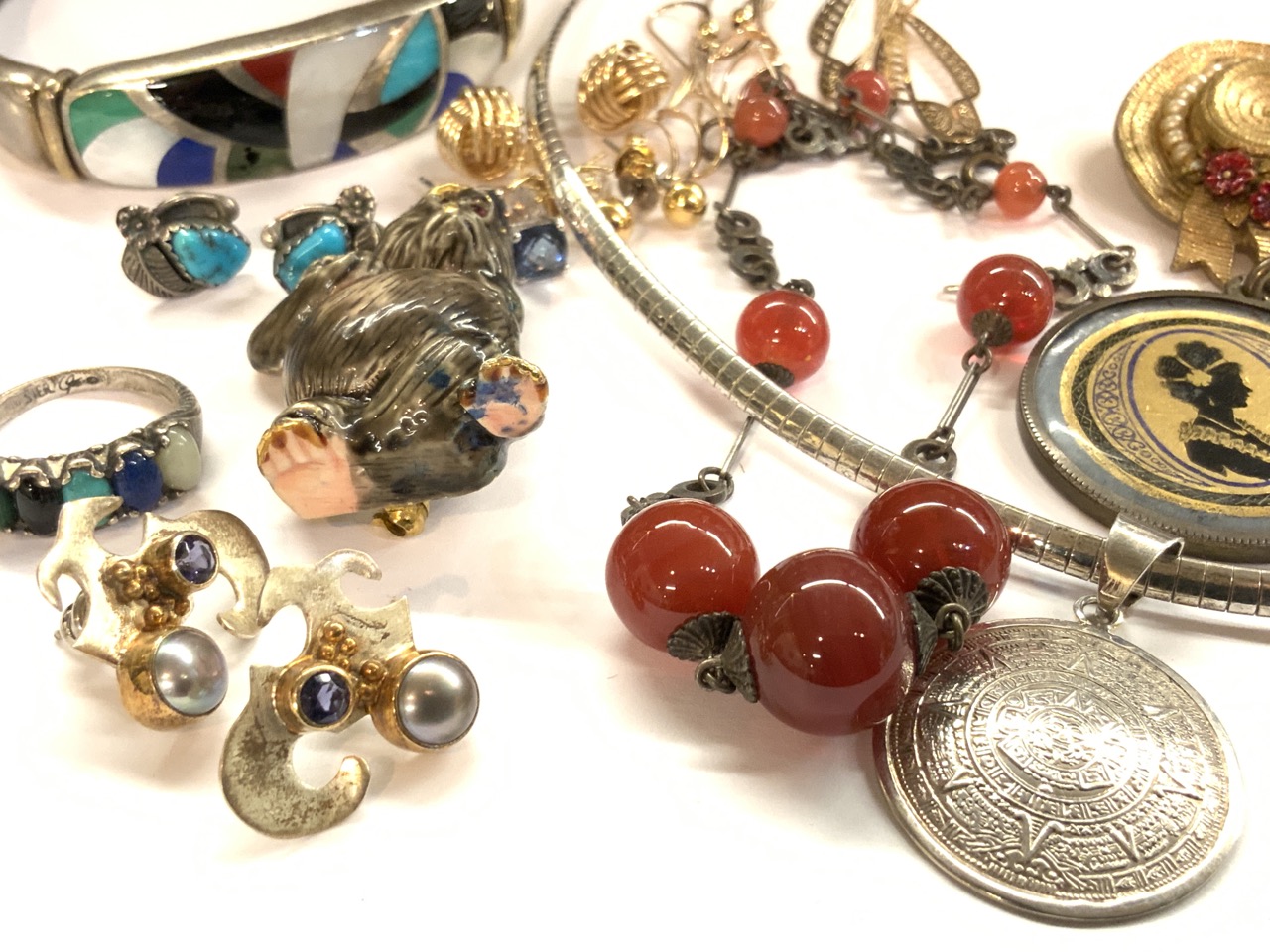 Assorted costume jewelry and sterling silver group. Original by Robert monkey pin, Ciner, gold plated silver earrings, Taxco bracelet needing repair etc.