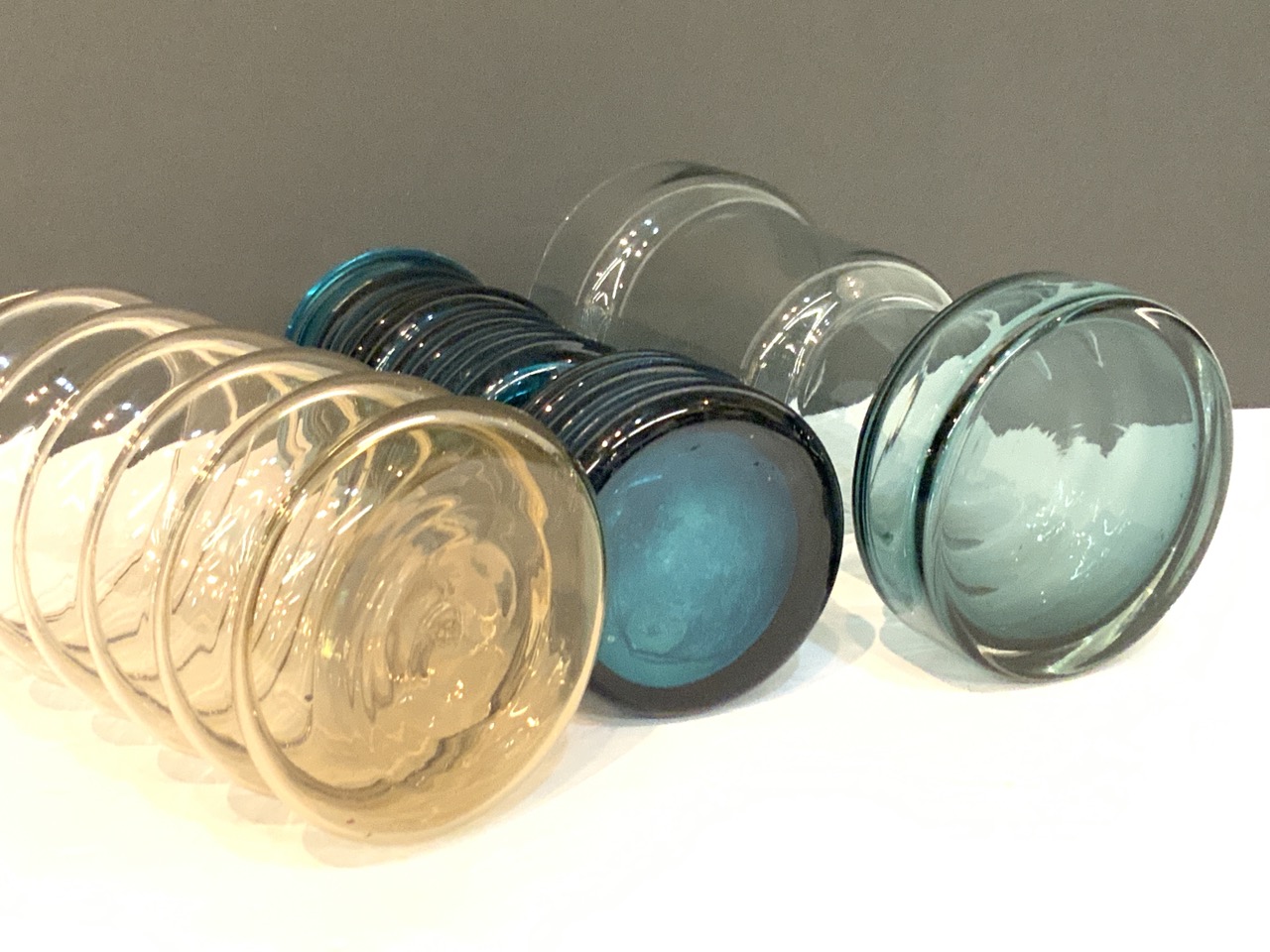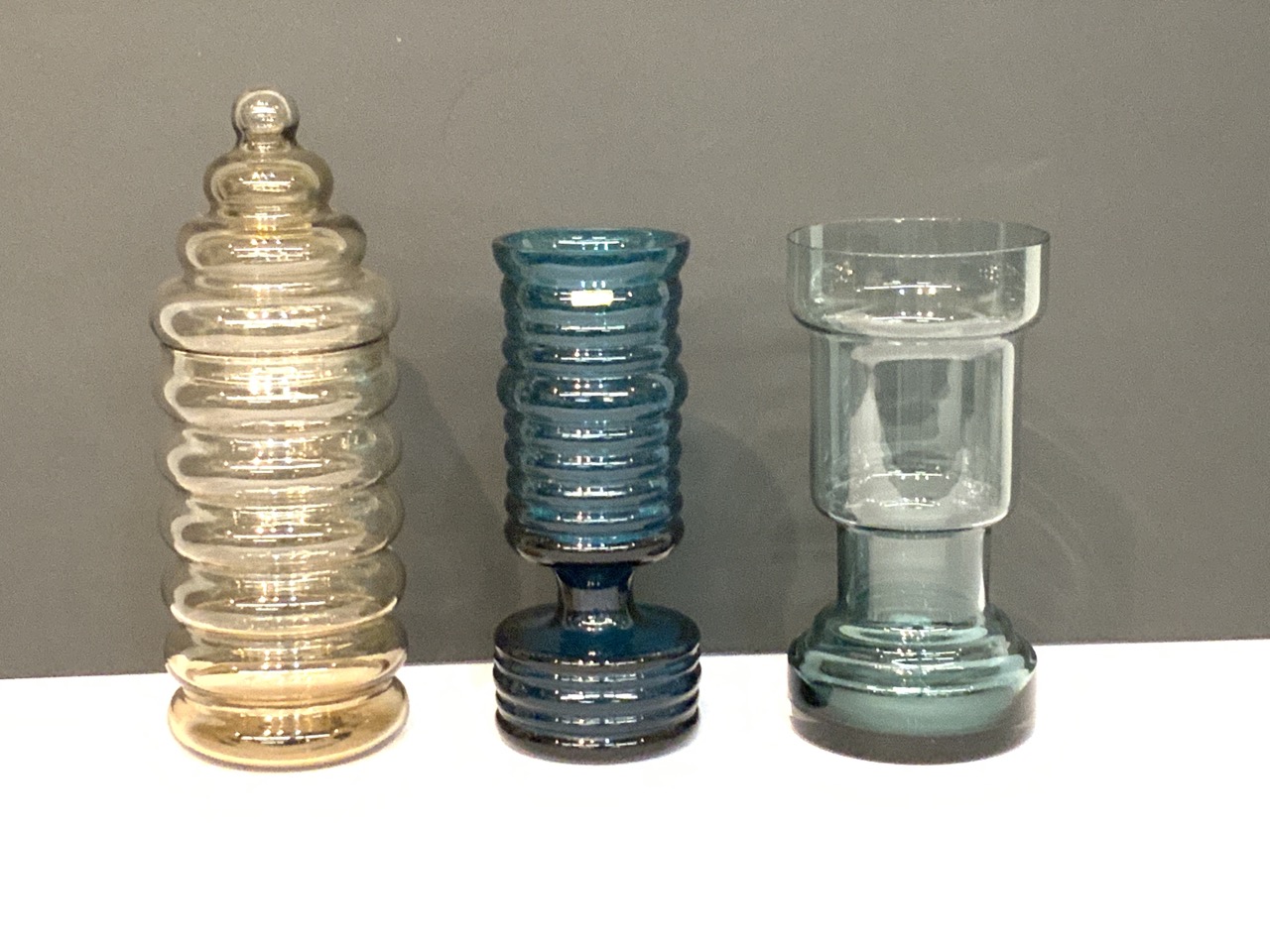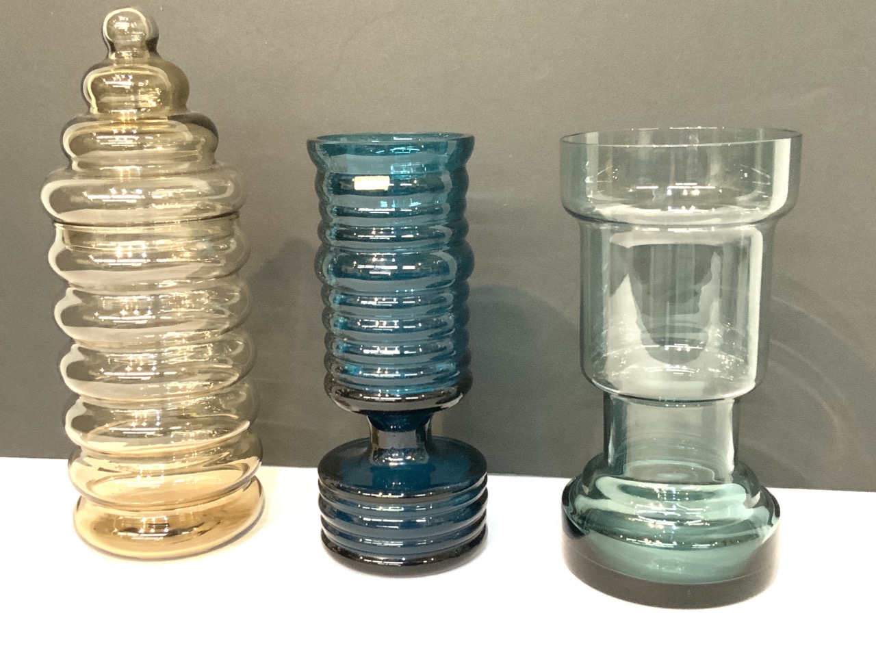 Three piece MCM design glass vases and covered jar.