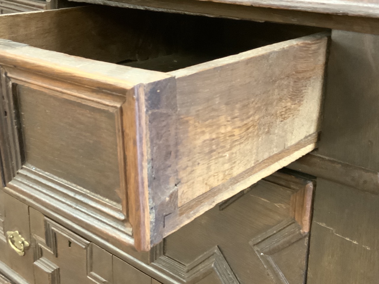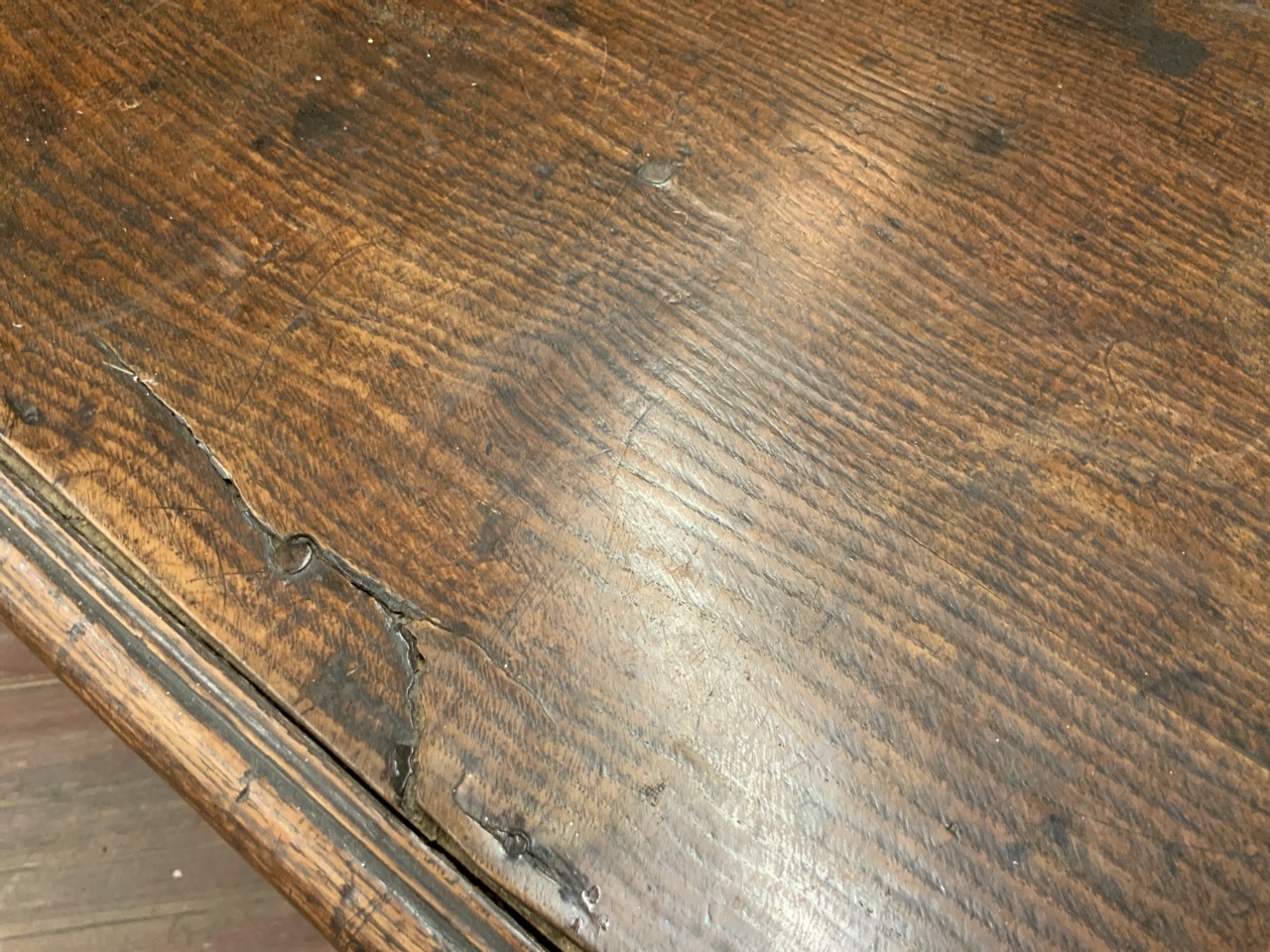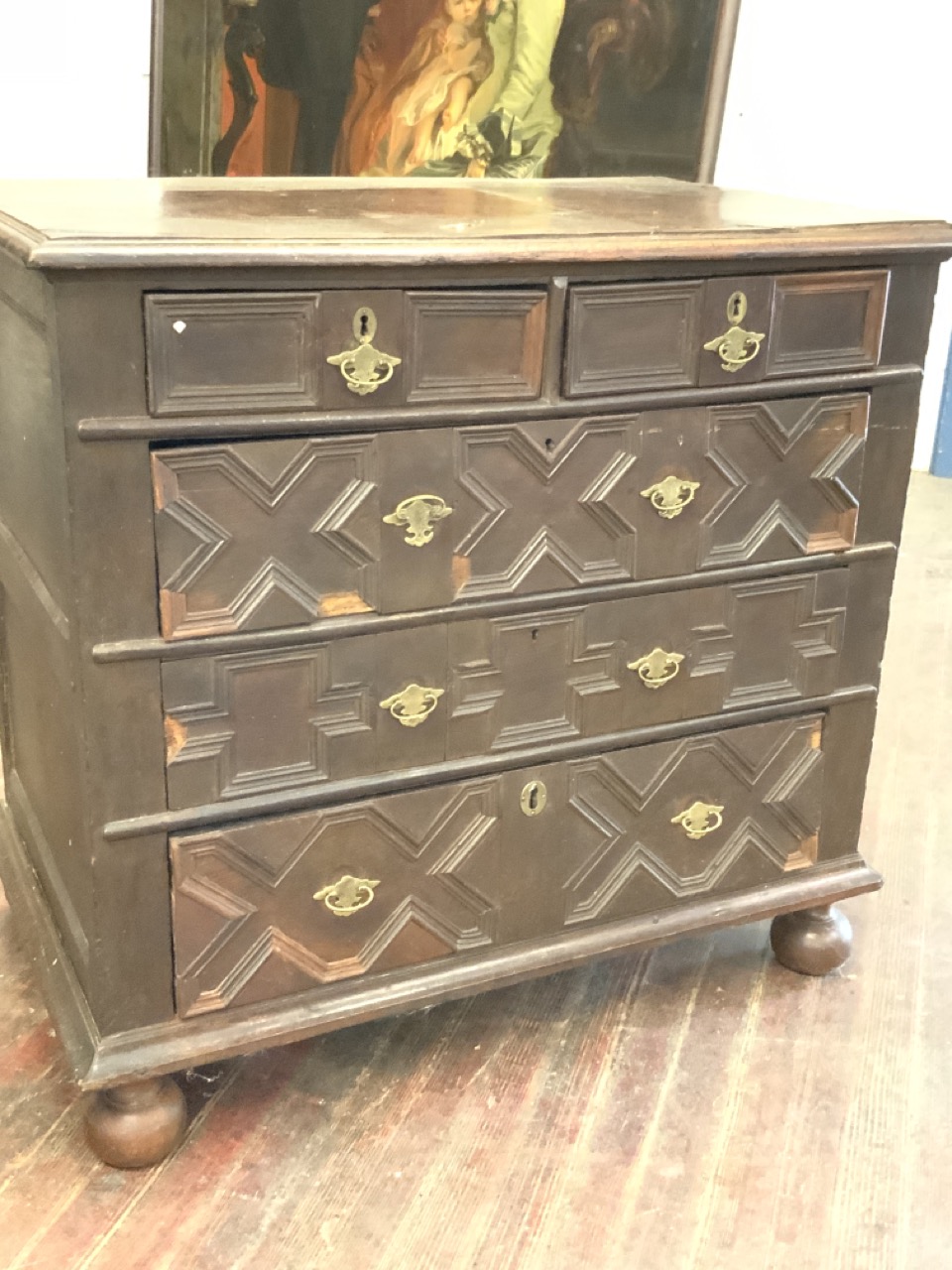 A 17th c. English Charles II Chest of Drawers. Two over three set on bun feet.