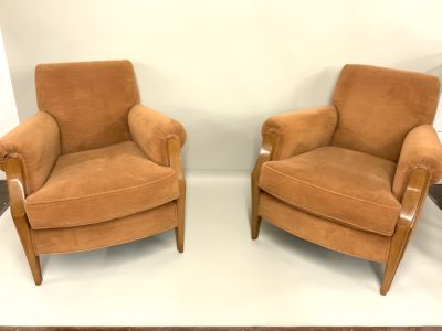 A pair of mohair upholstered lounge chairs. Dimensions: 33"h X 33" X 36"d Condition report: Wood damage on front right arm chair phototgraphed to left. Please see photograph preview or call. Upholstered excellent. Clean and free of any staining or odor.