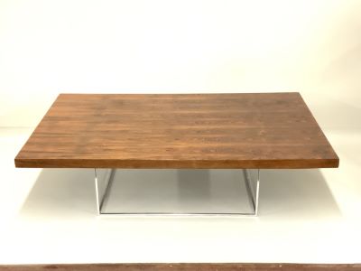 Rosewood veneered and chrome base coffee table. Dimensions: 15"h X 34" X 54" Condition report: Some coaster stains to surface. Overall very good, please see photograph preview or call.