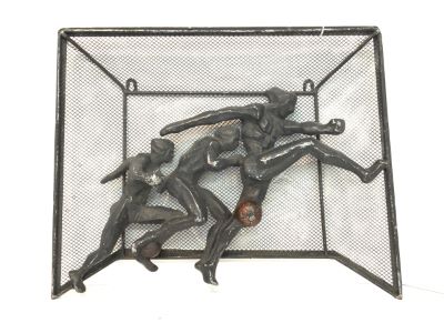 An aluminum wall sculpture, Art Deco period depicting three soccer players in motion. Well done example showing male physique. Dimensions: 15.2” x 19.5”