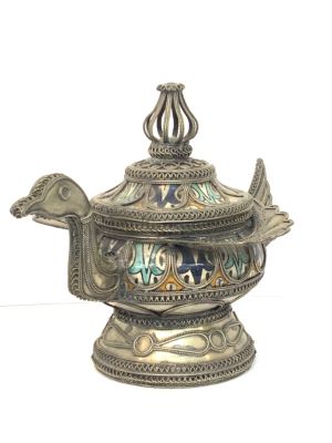A decorative Persian bird figural covered dish. Dimensions: 10” x 12.5”